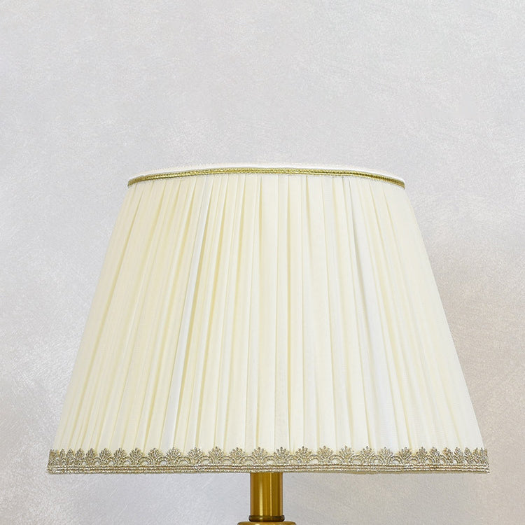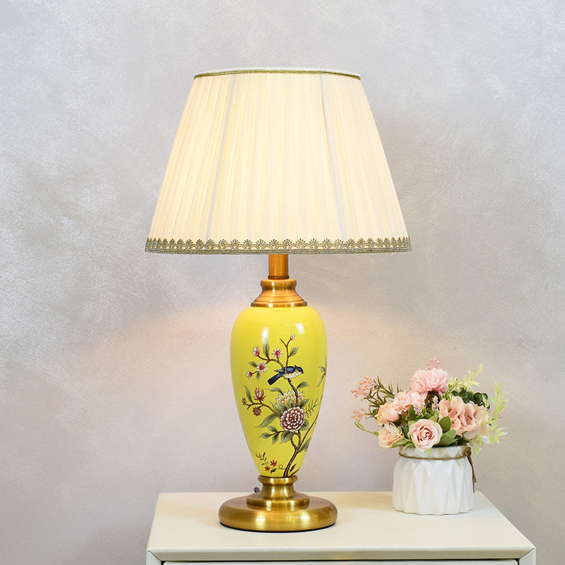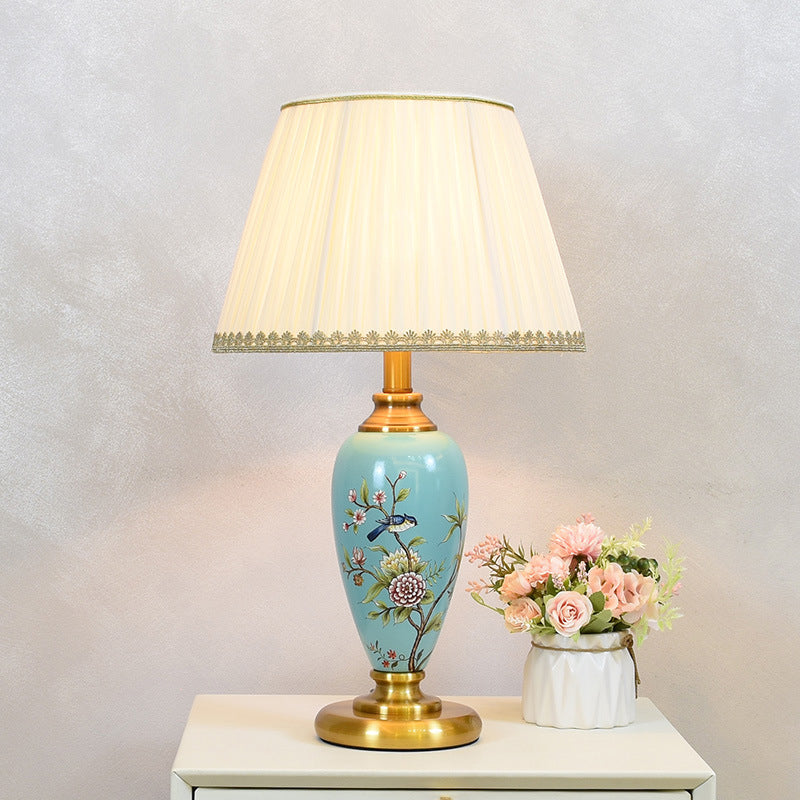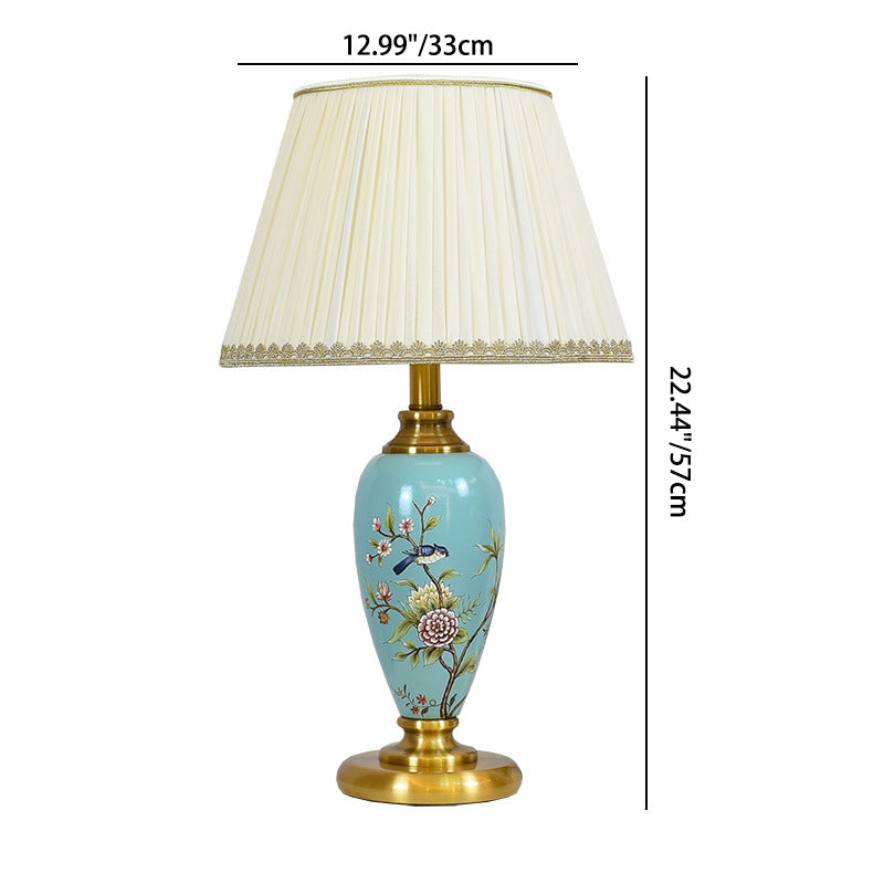 Traditional Chinese Bird And Flower Cylinder Hardware Ceramic Fabric 1-Light Table Lamp For Bedroom