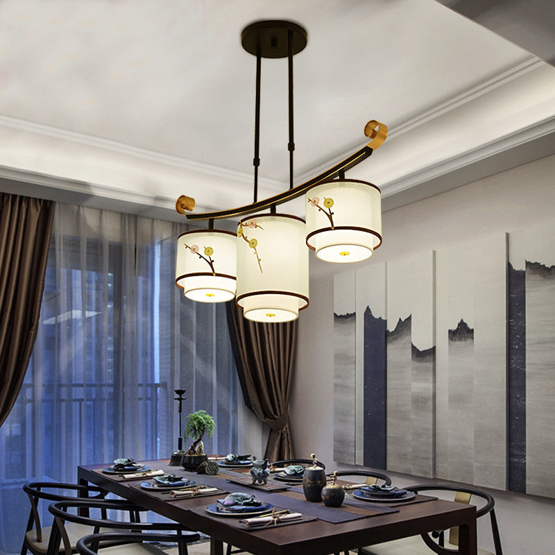 Traditional Chinese Cylinder Pattern Fabric Lampshade Iron 3/4 - Light Chandelier For Dining Room
