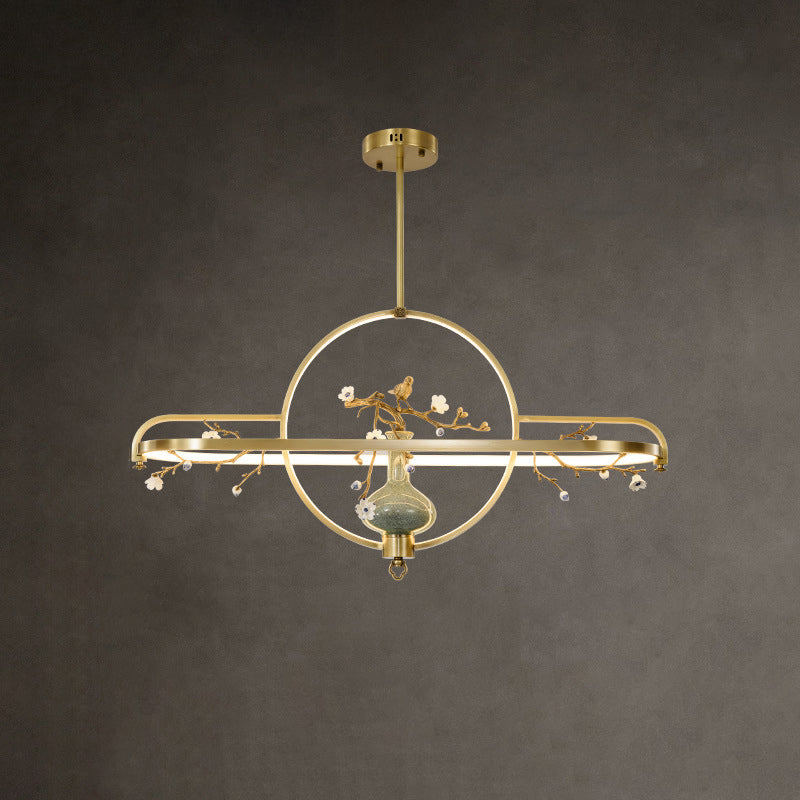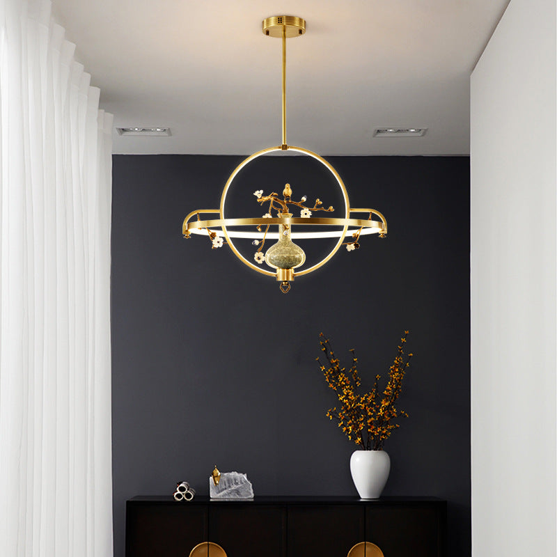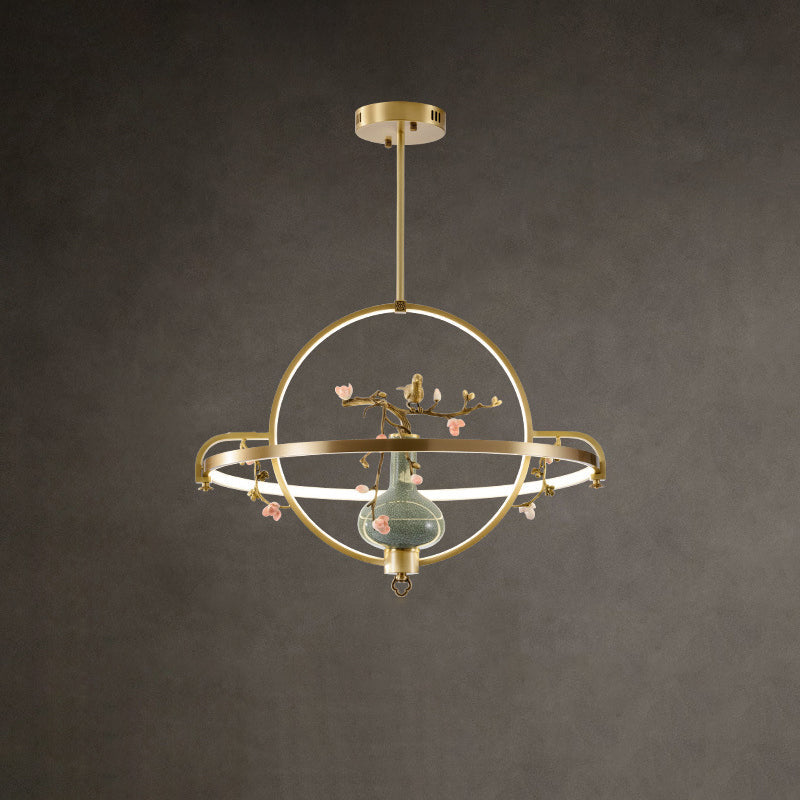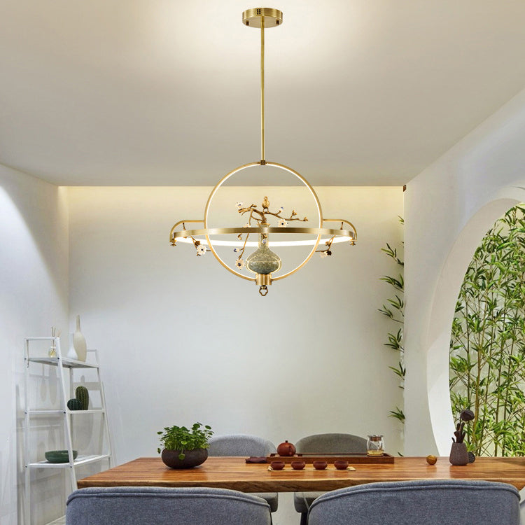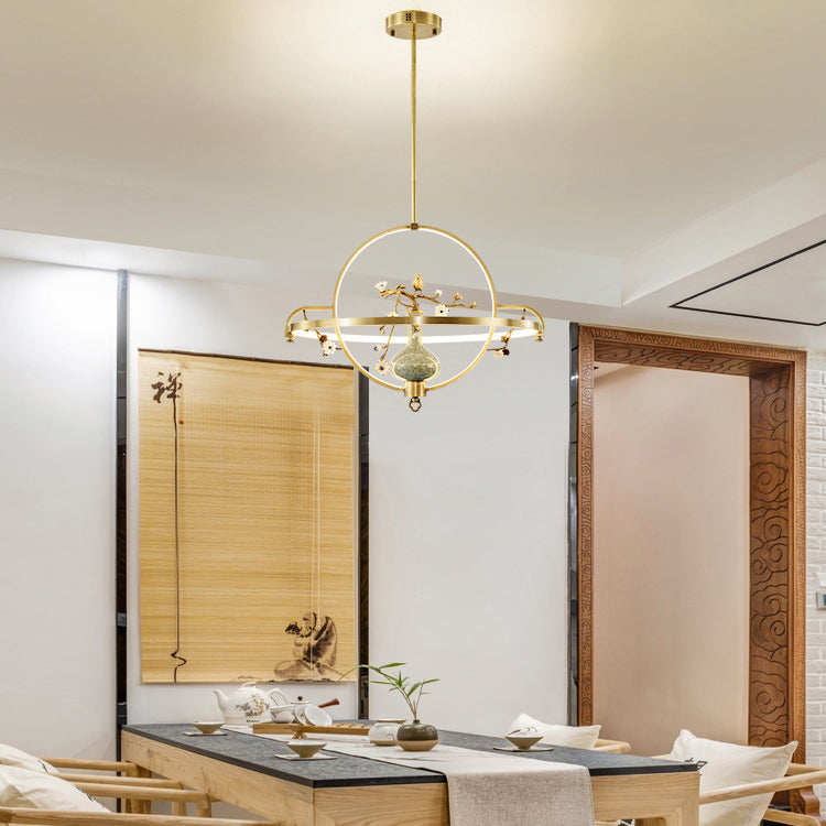 Traditional Chinese Dome Round Magnolia Plum Blossom Ceramic Vase Copper Silicone LED Chandeliers For Dining Room