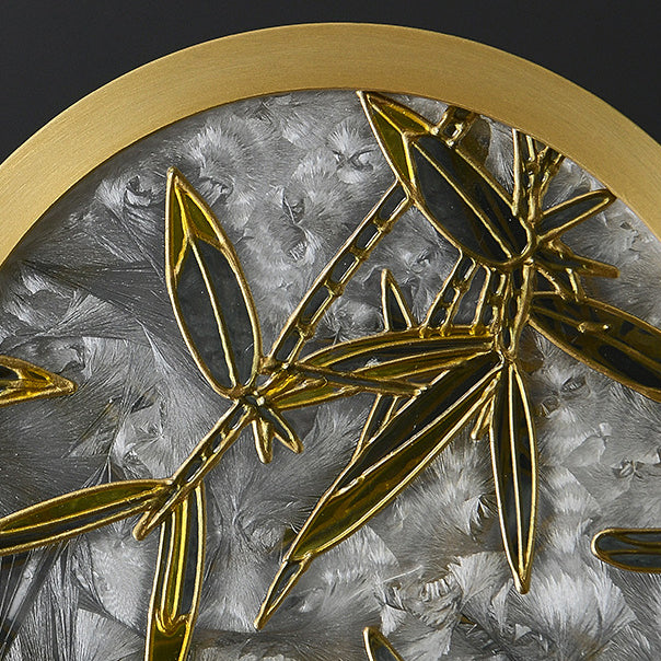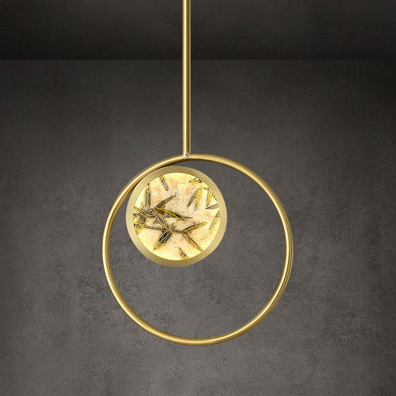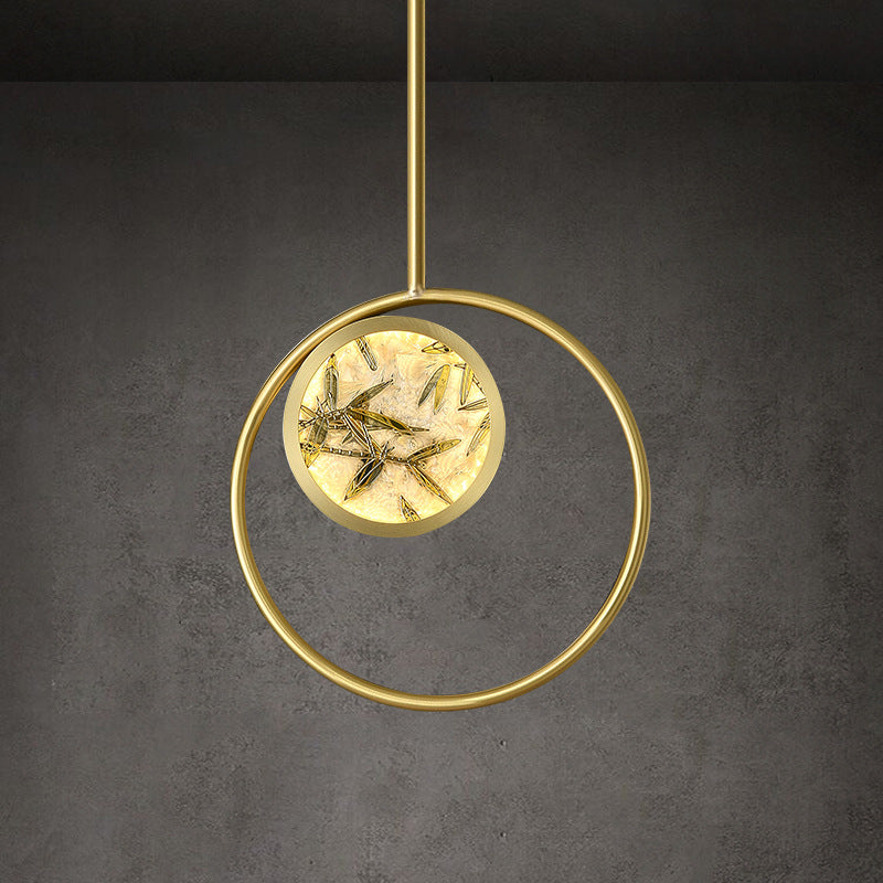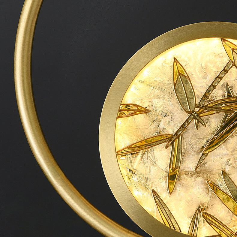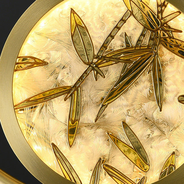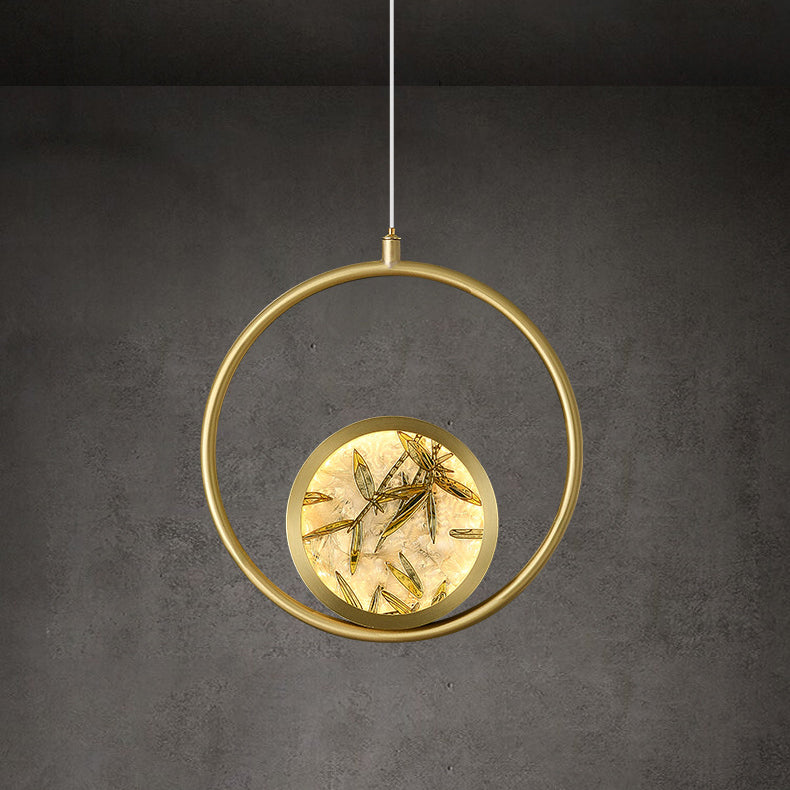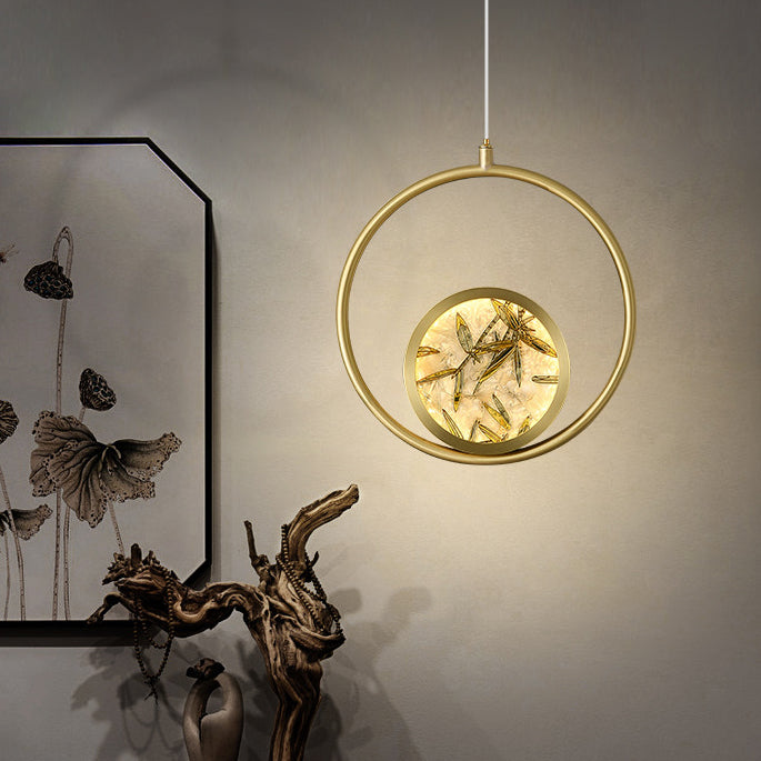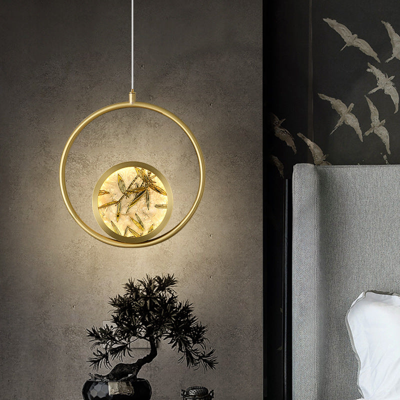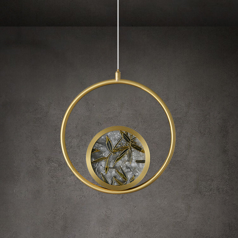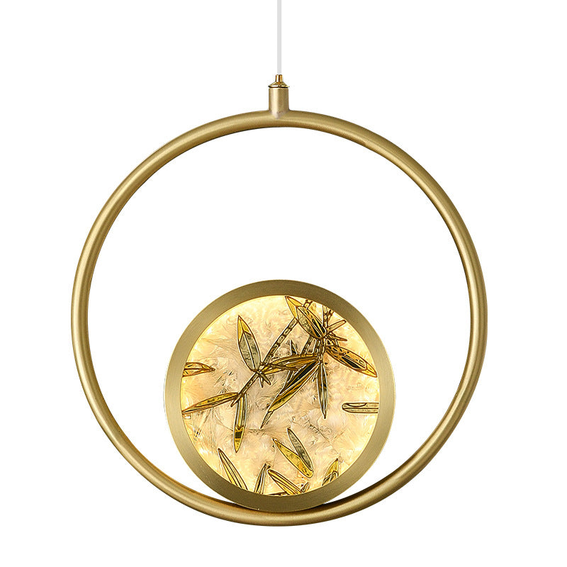 Traditional Chinese Glass & Brass Round Leaf Pattern LED Pendant Light For Bedroom & Living Room