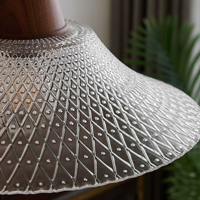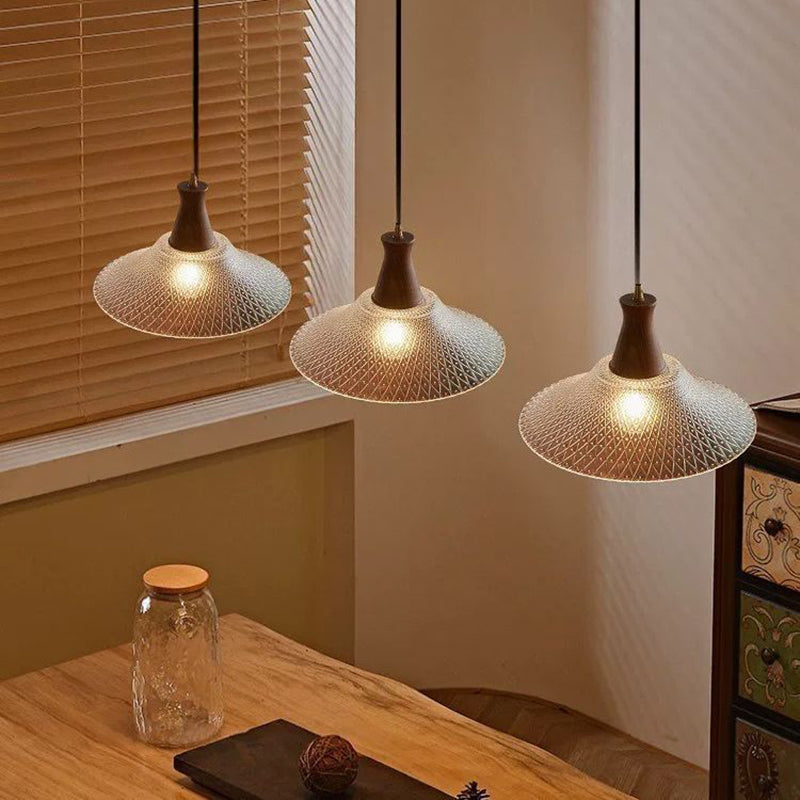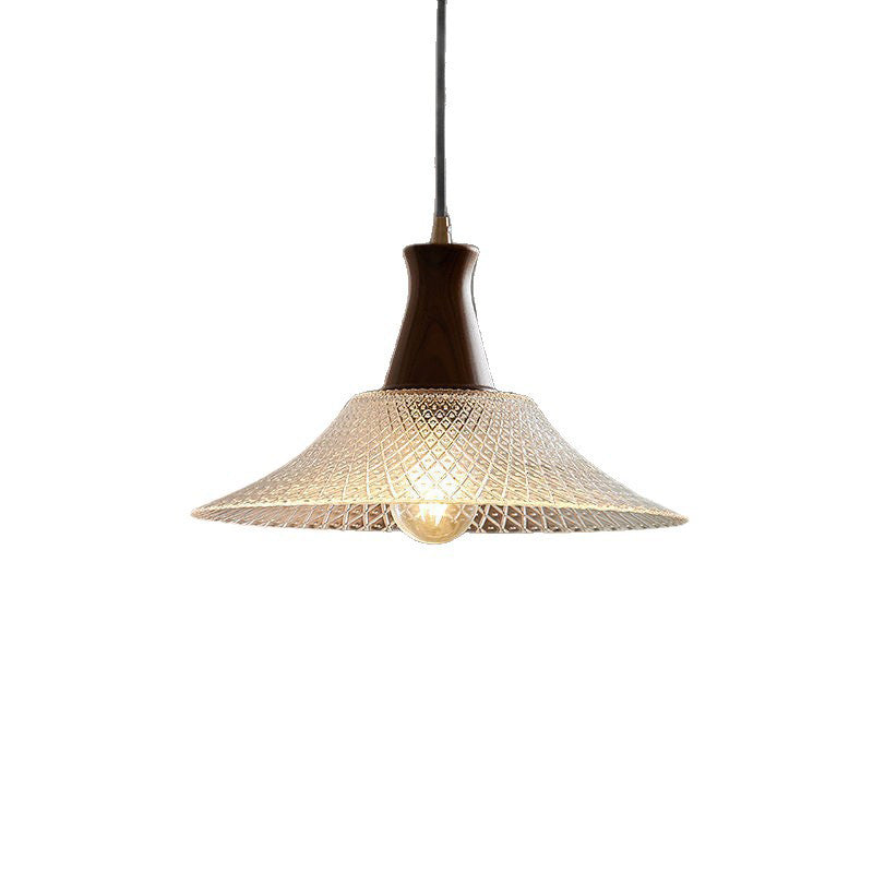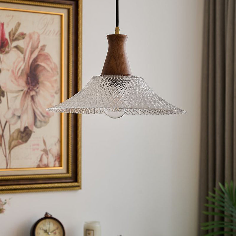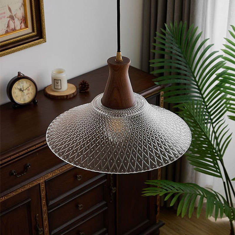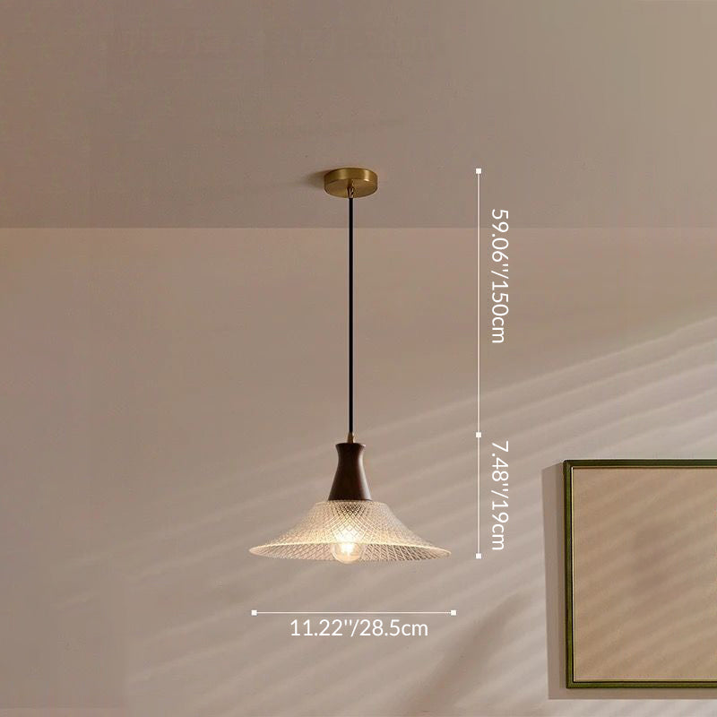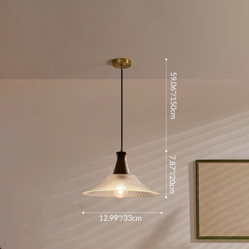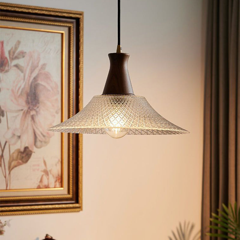 Traditional Chinese Glass Walnut Brass Flared Round 1-Light Pendant Light For Bedroom