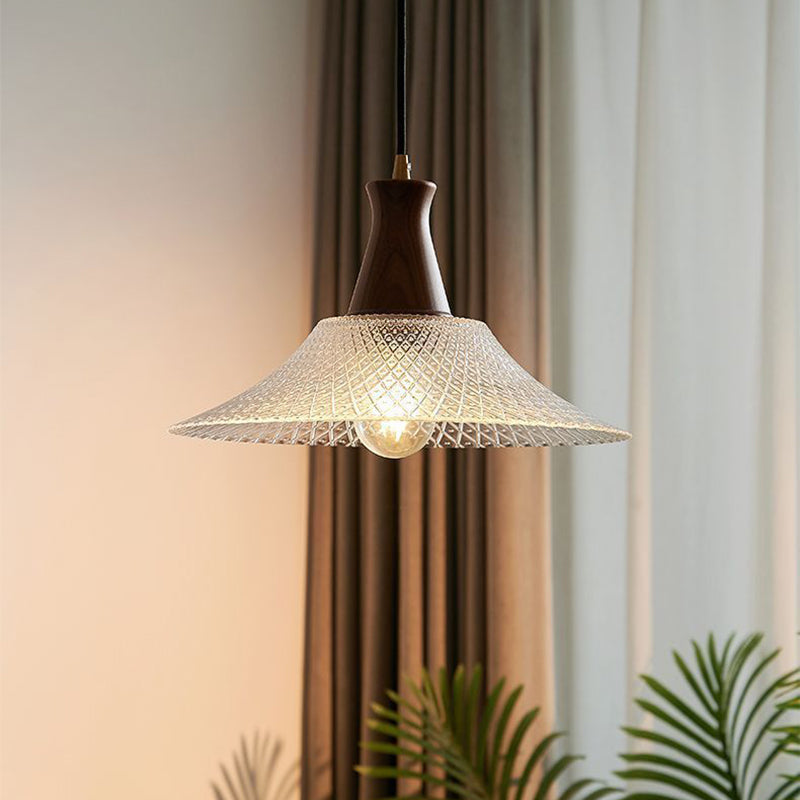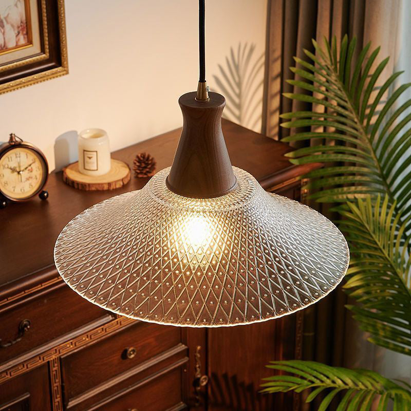 This 1-light pendant light features a handcrafted walnut wood finish with a flared glass shade and brass accents, delivering soft, non-glare lighting. Its detailed texture, classic round silhouette, and warm walnut color bring a refined vintage touch to any bedroom or reading nook.