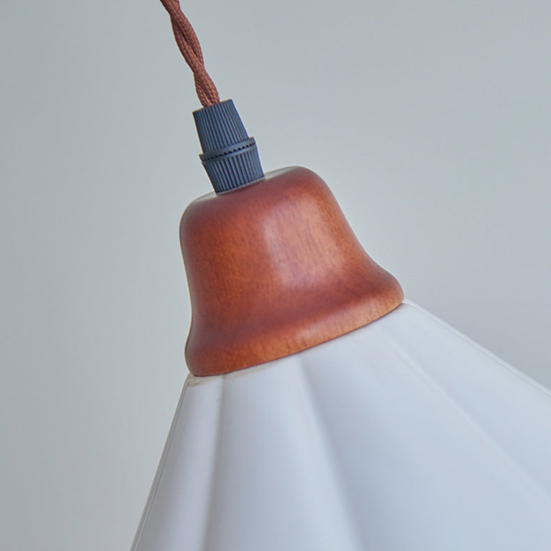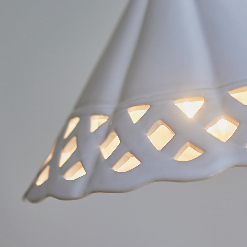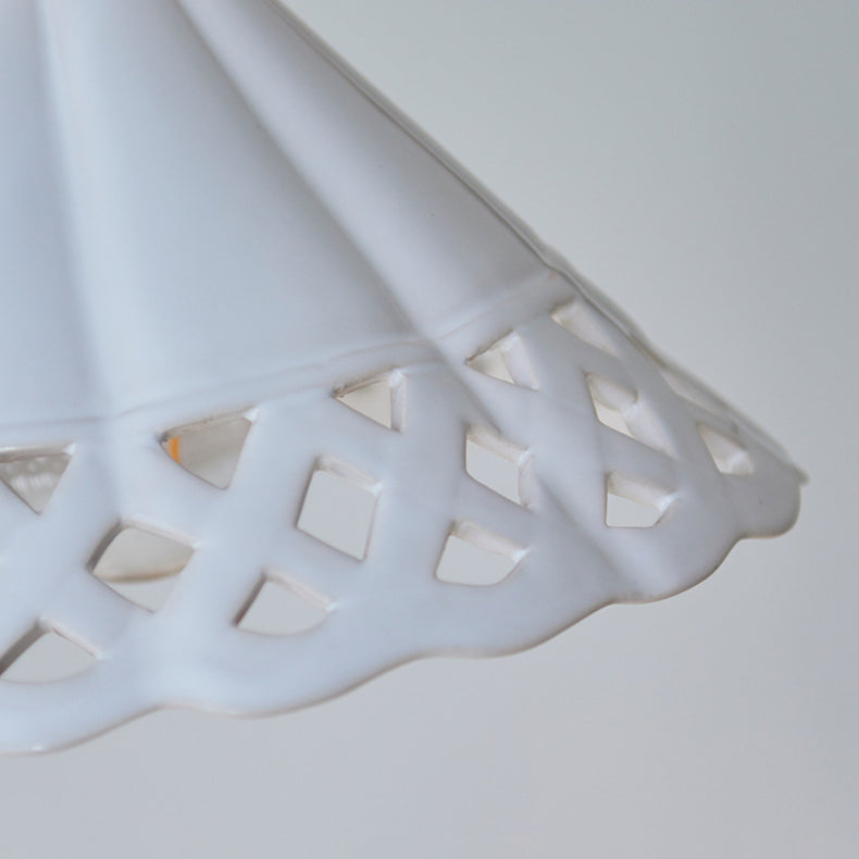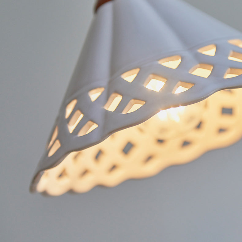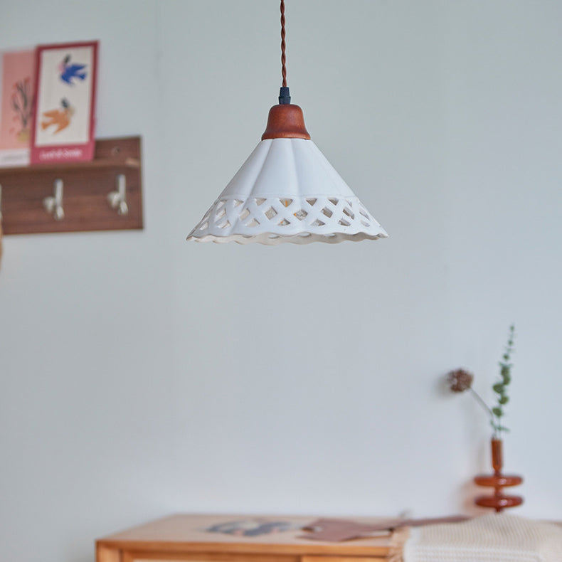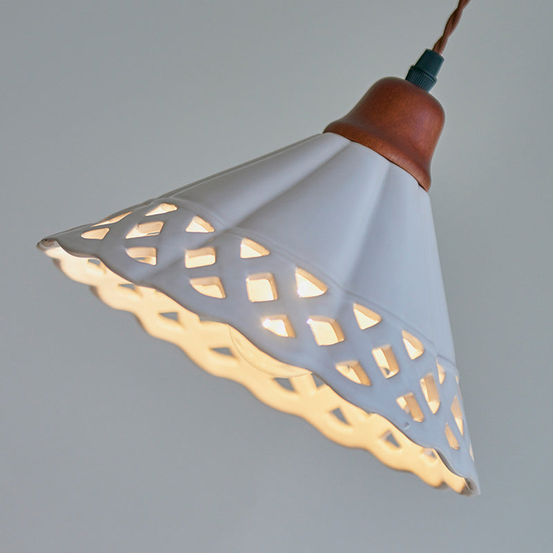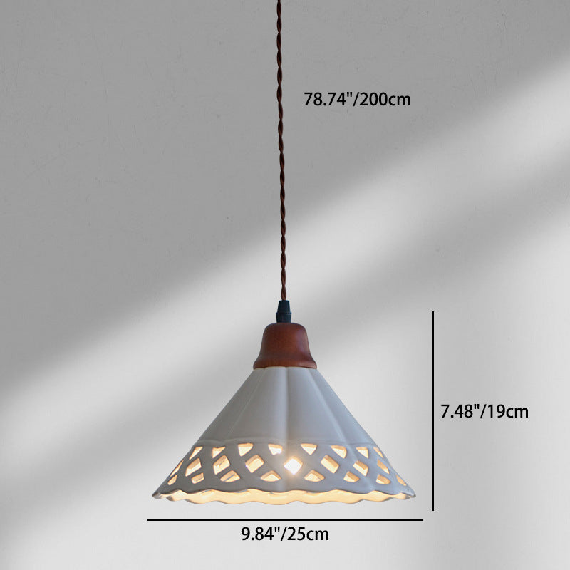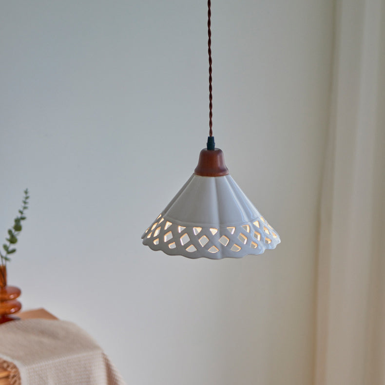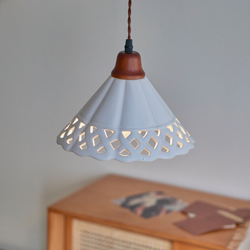 Traditional Chinese Hollow Cone Ceramic Solid Wood 1-Light Pendant Light For Bedroom