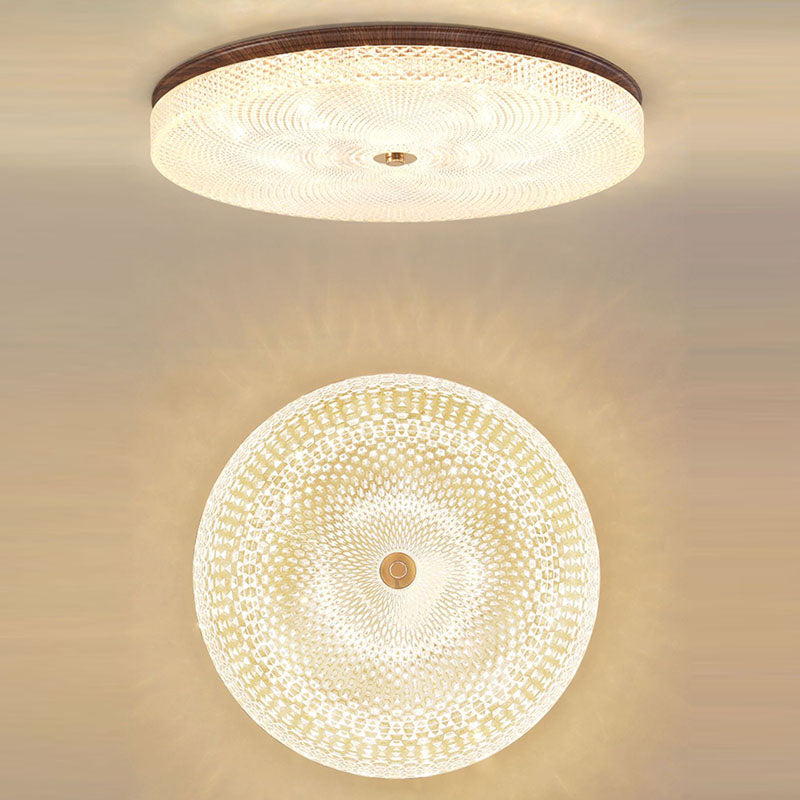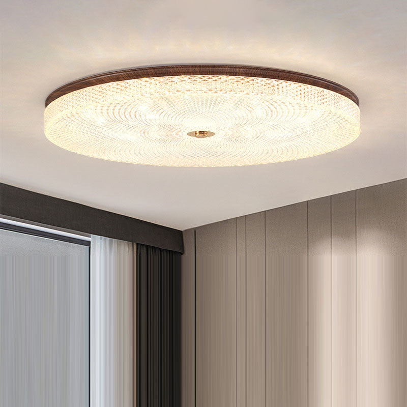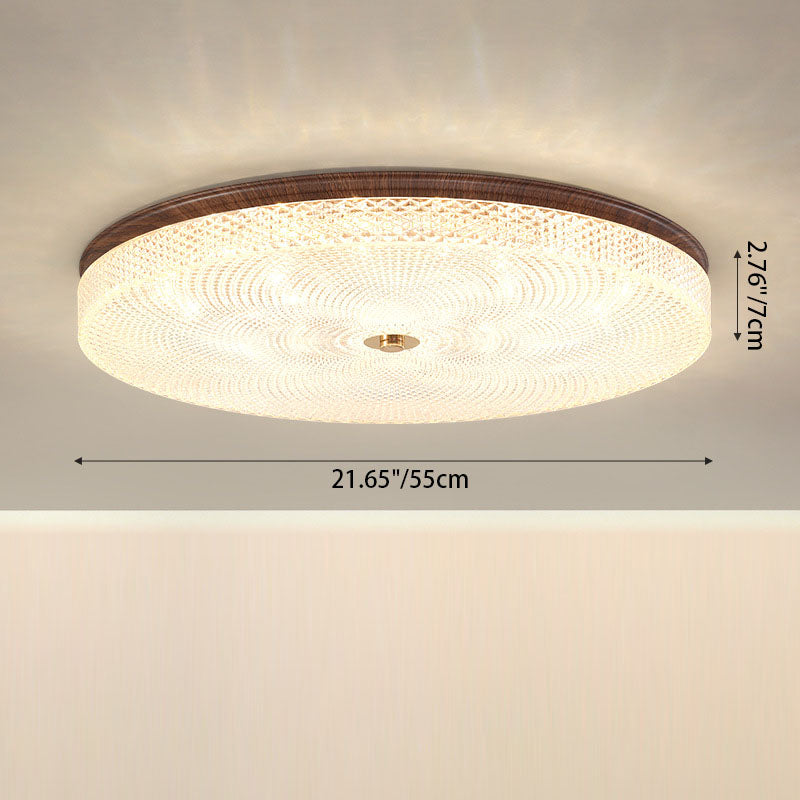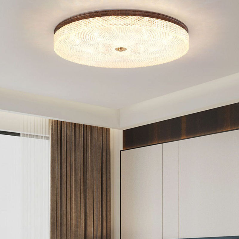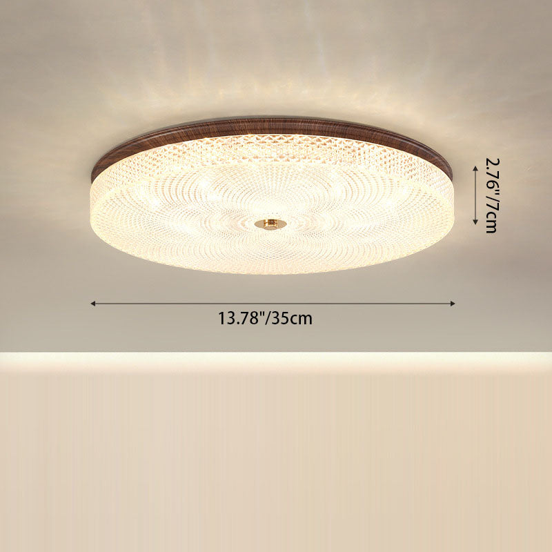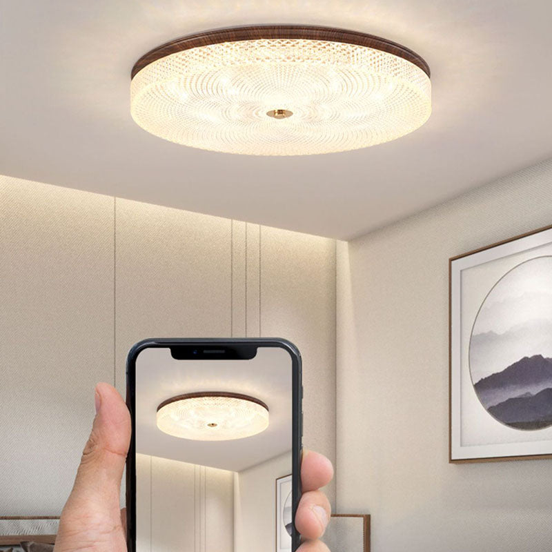 Traditional Chinese Iron Acrylic Round Wood Grain LED Flush Mount Ceiling Light For Living Room
