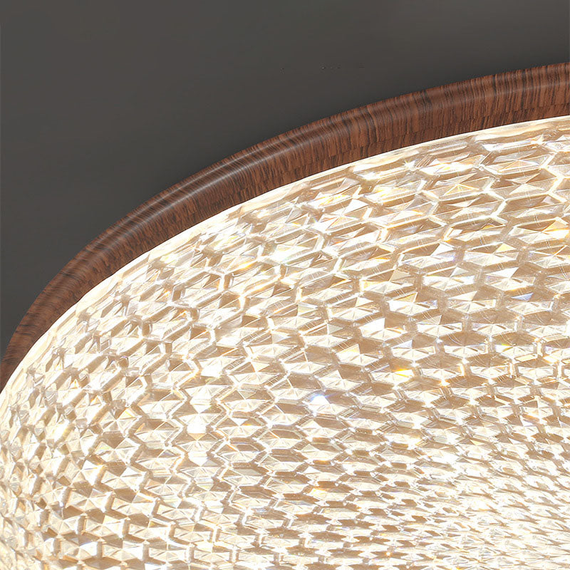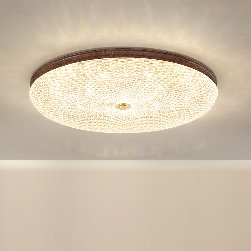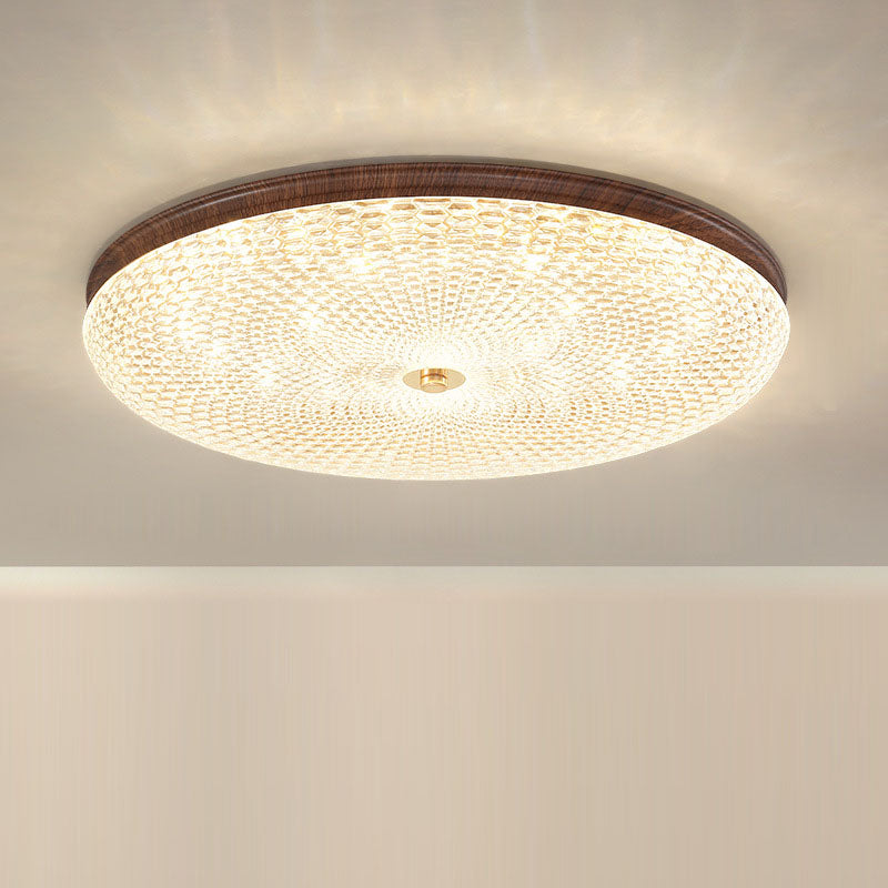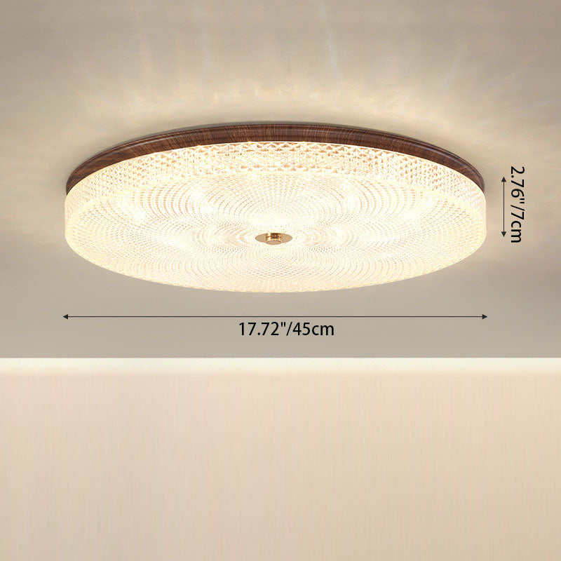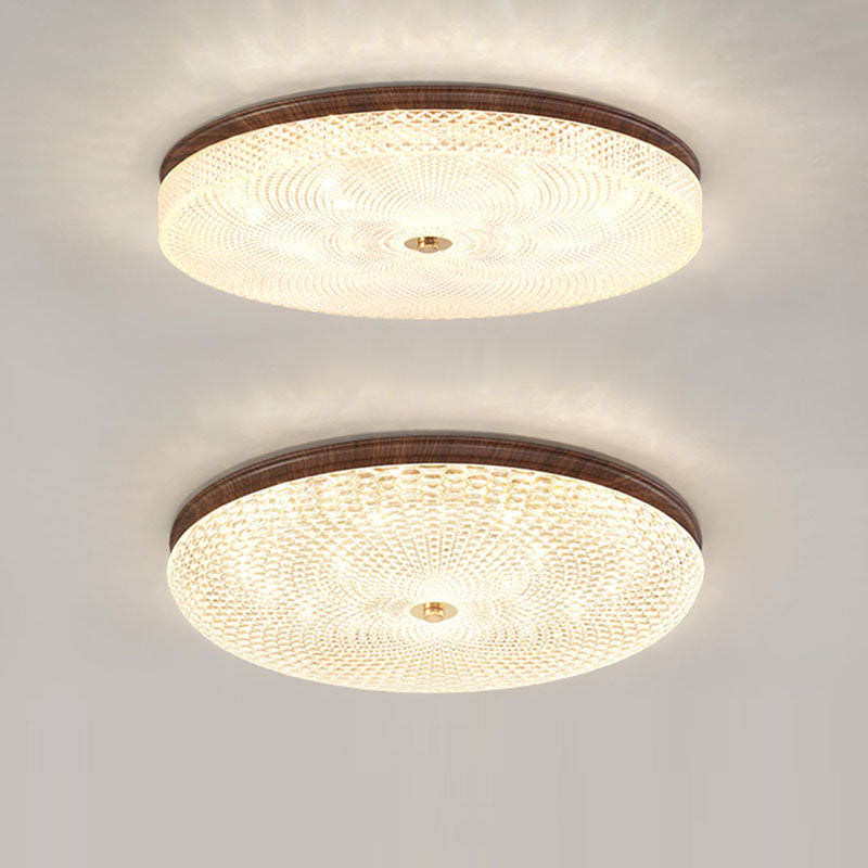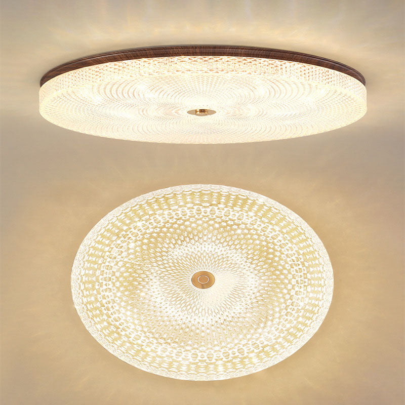 Traditional Chinese Iron Acrylic Round Wood Grain LED Flush Mount Ceiling Light For Living Room