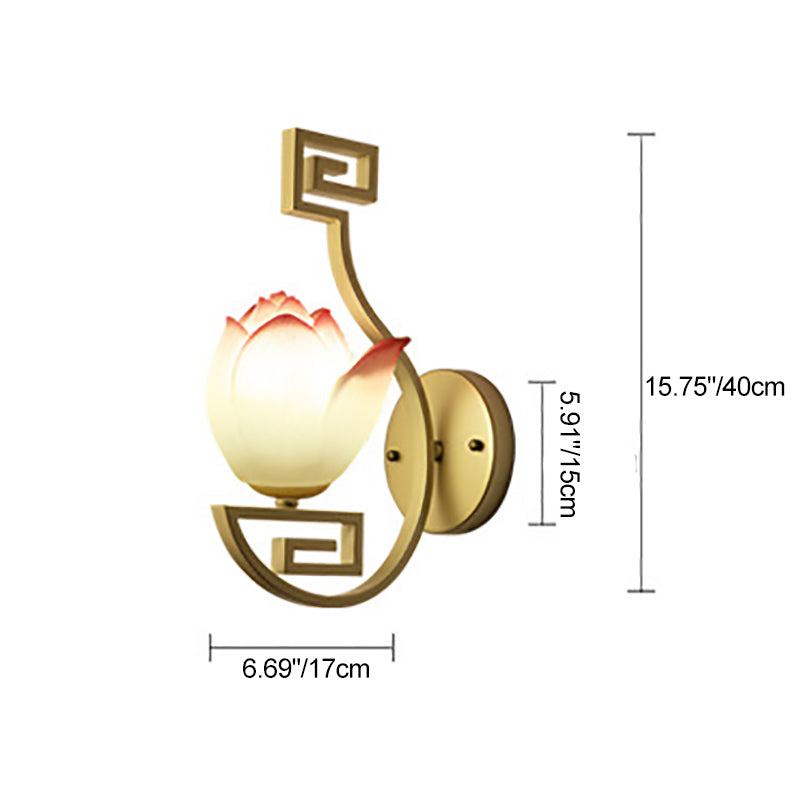 Illuminate your space with this decorative wall sconce featuring a lotus-shaped lampshade and elegant curved iron arm. Crafted from durable iron and resin in a luxurious gold finish, this high-temperature resistant fixture embodies traditional Chinese aesthetics—ideal for adding a touch of classic elegance to bedrooms and living rooms.