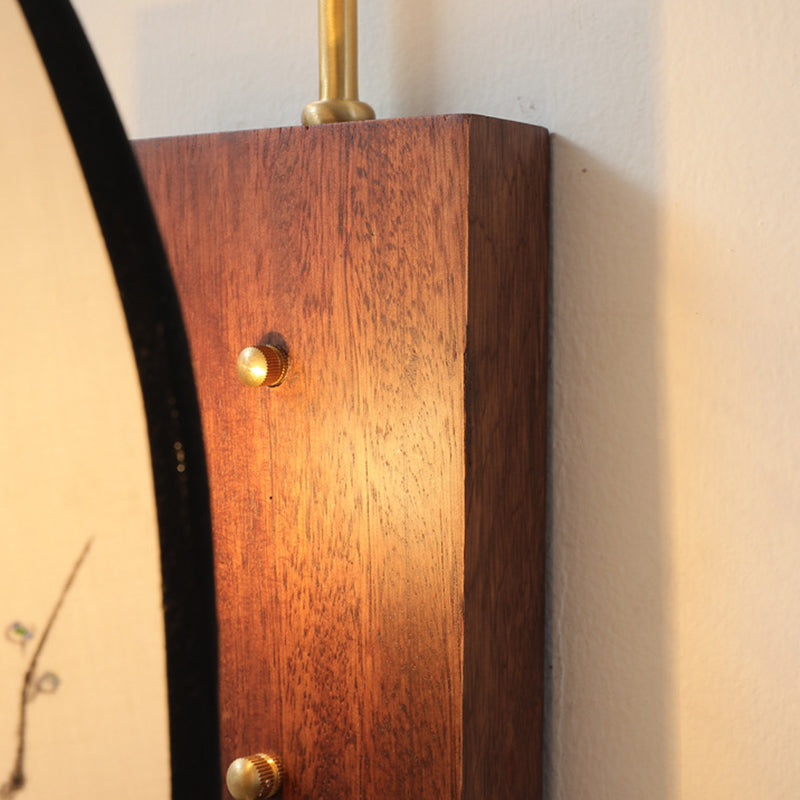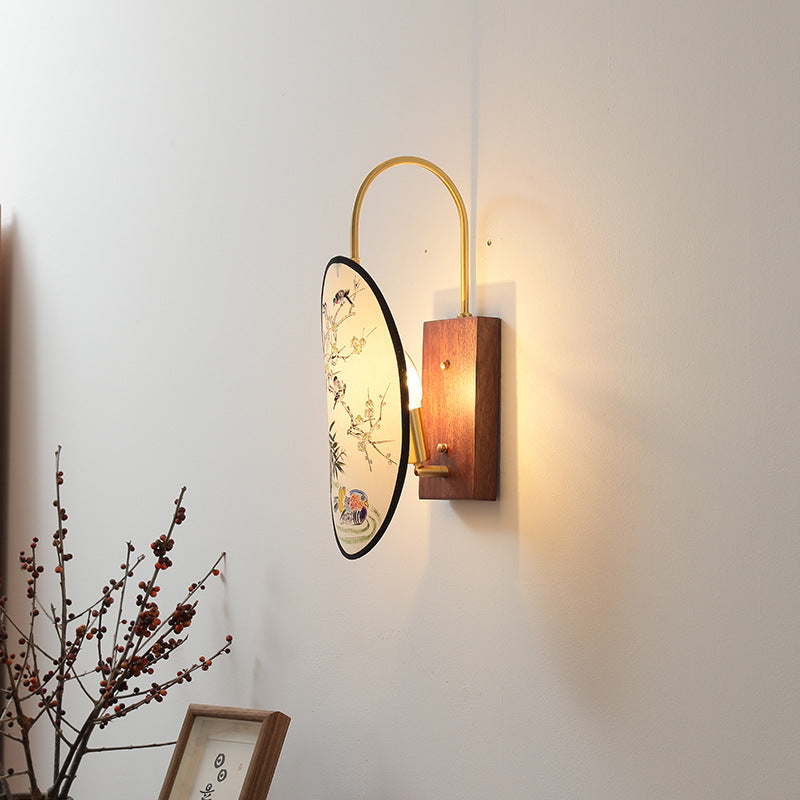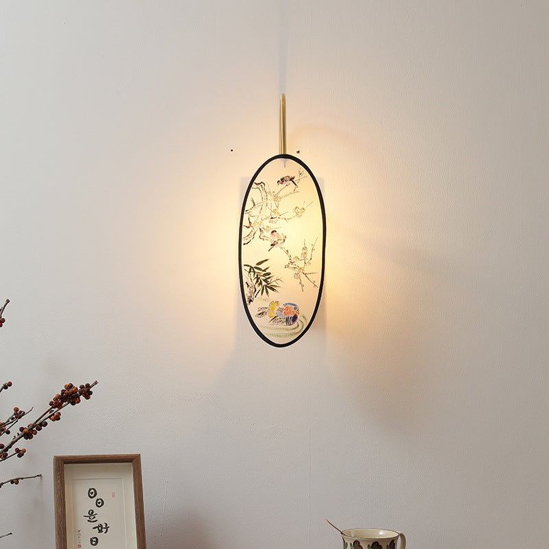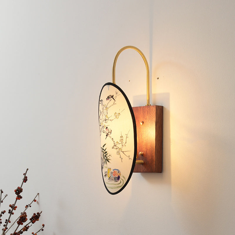 Traditional Chinese Oval Flower And Bird Patterned Hawthorn Wood Brass Fabric 1-Light Wall Sconce Lamp For Bedroom