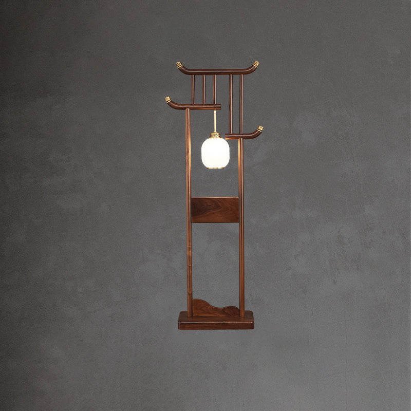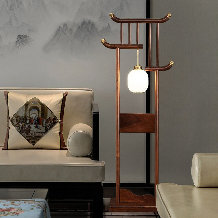 Traditional Chinese Solid Wood Frame Glass Round Shade 1-Light Standing Floor Lamp For Home Office