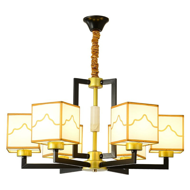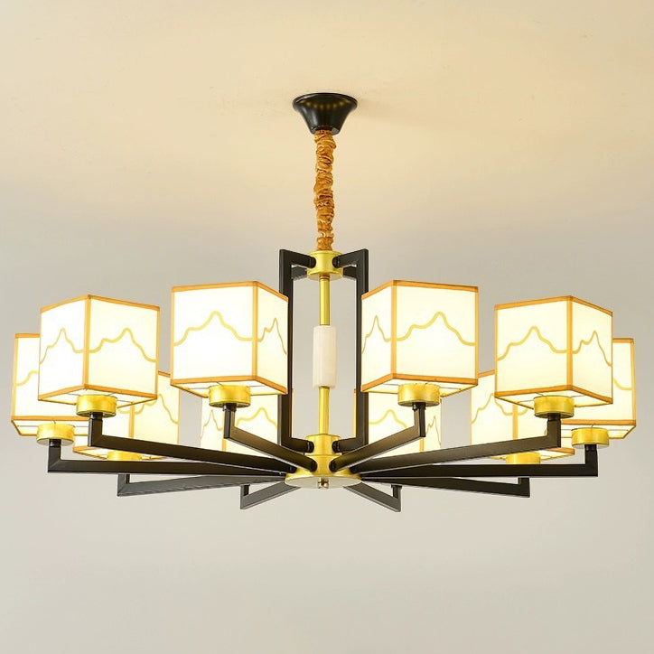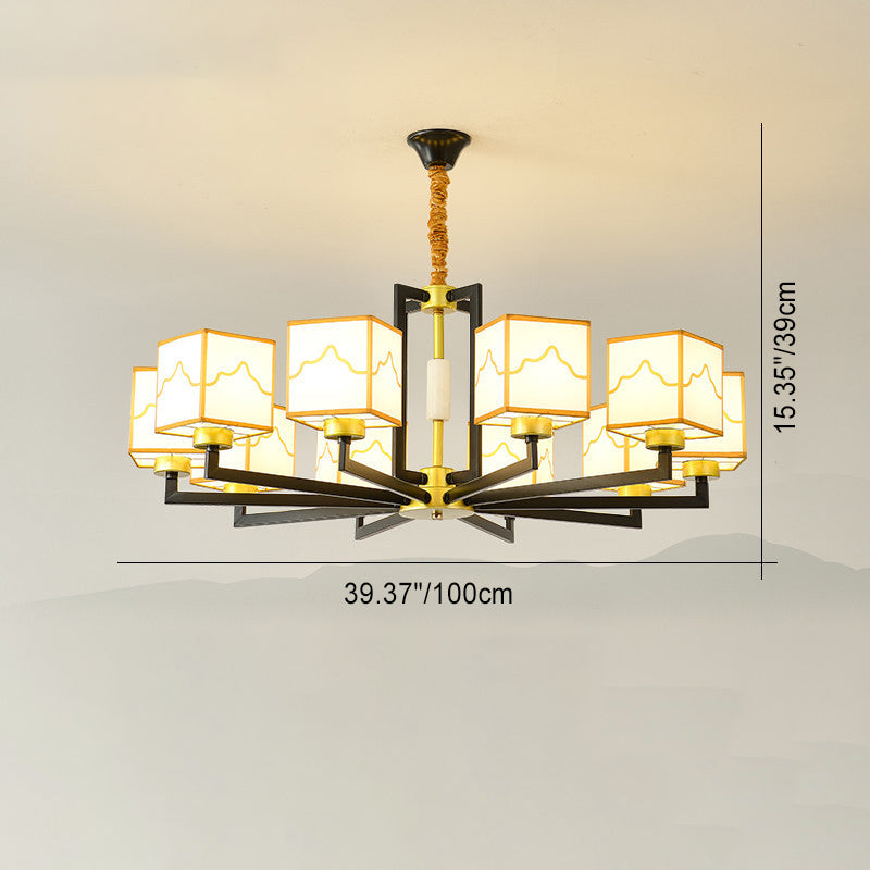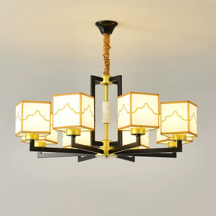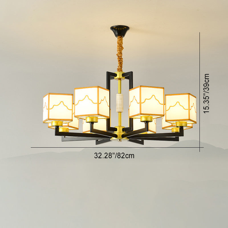 Traditional Chinese Square Pattern Fabric Lampshade Iron 6/8/10/15 - Light Chandeliers For Living Room