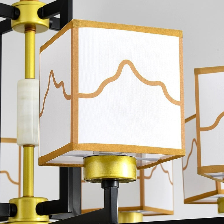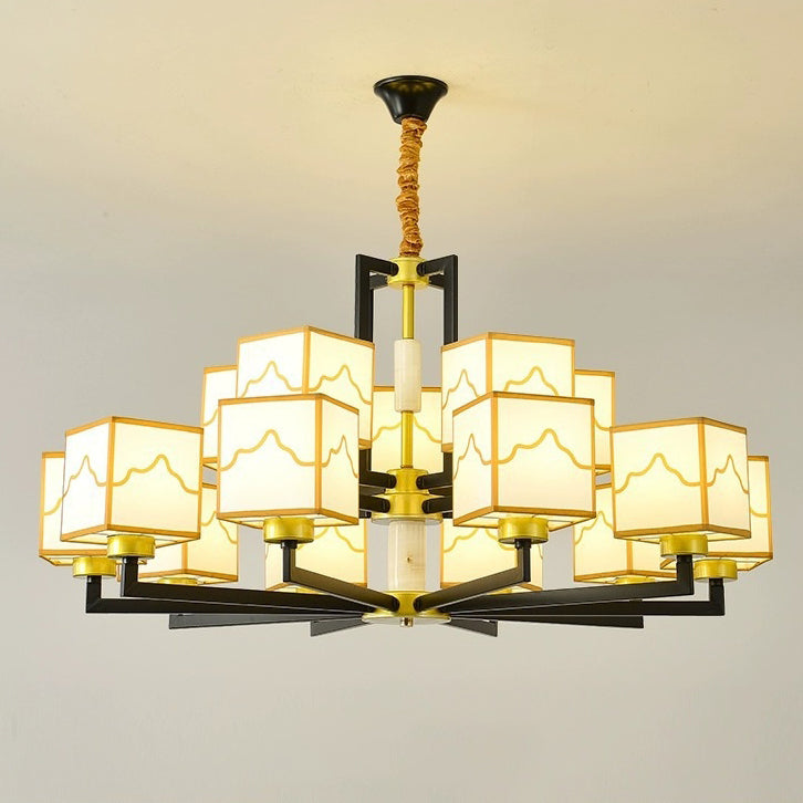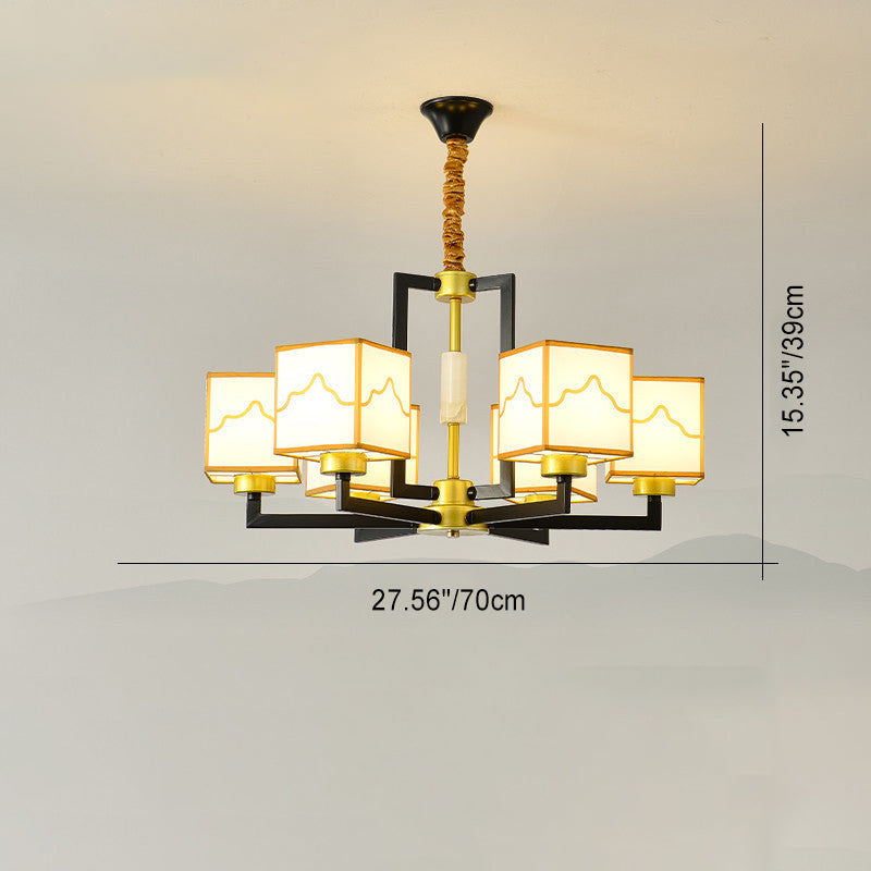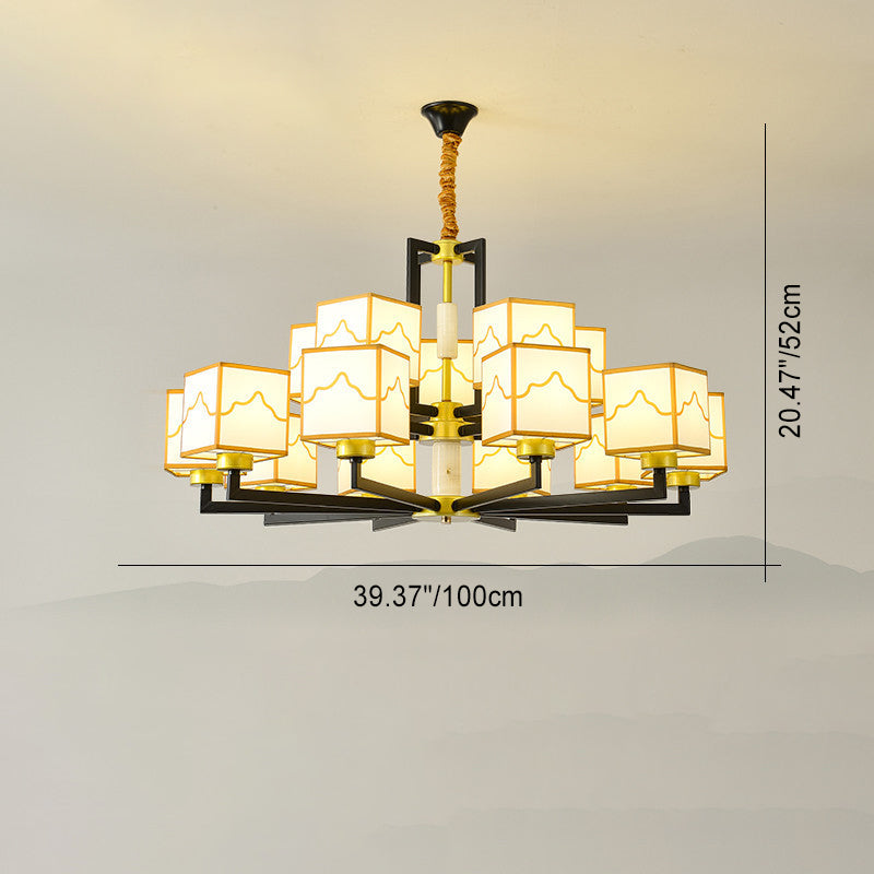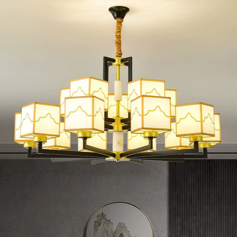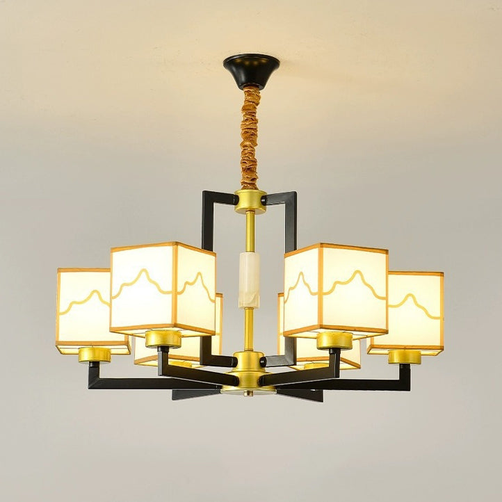 Traditional Chinese Square Pattern Fabric Lampshade Iron 6/8/10/15 - Light Chandeliers For Living Room