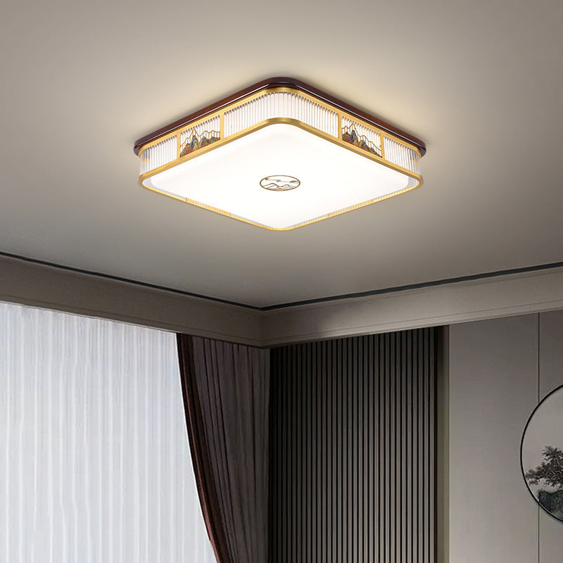 Traditional Chinese Square Rectangle Pattern Acrylic Iron Copper LED Flush Mount Ceiling Light For Living Room
