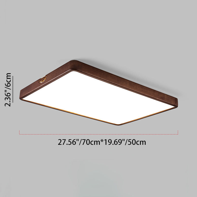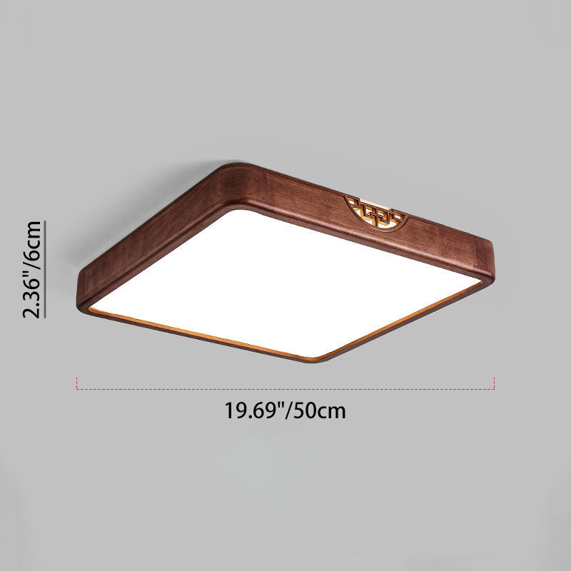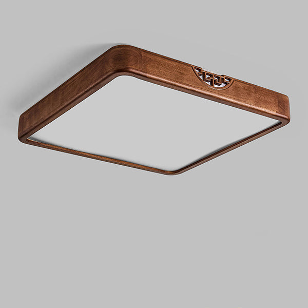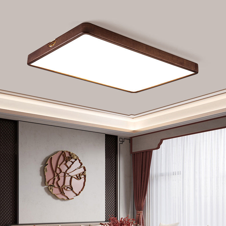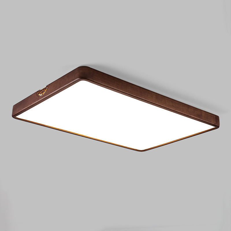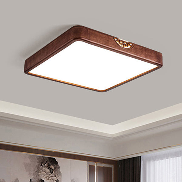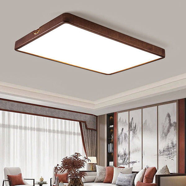 Traditional Chinese Square Rectangle Walnut Grain Rubber Wood Hardware PVC Shade LED Flush Mount Ceiling Light For Living Room