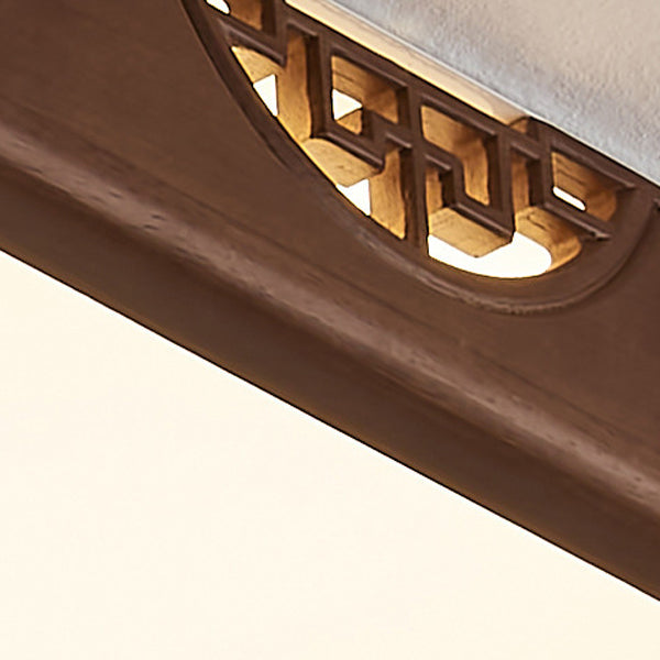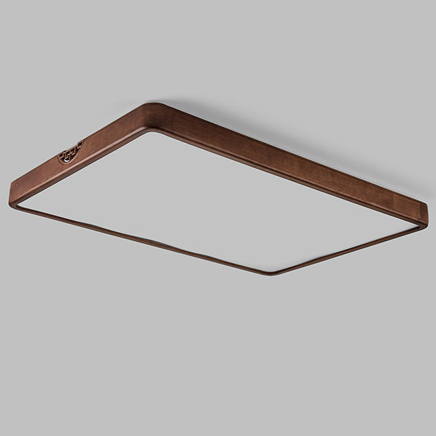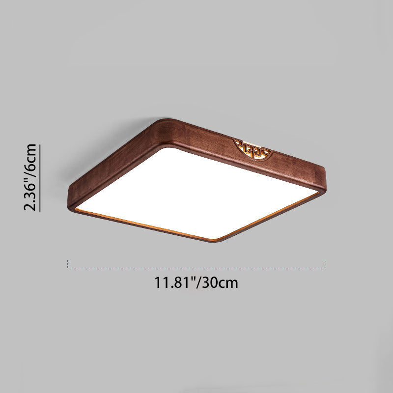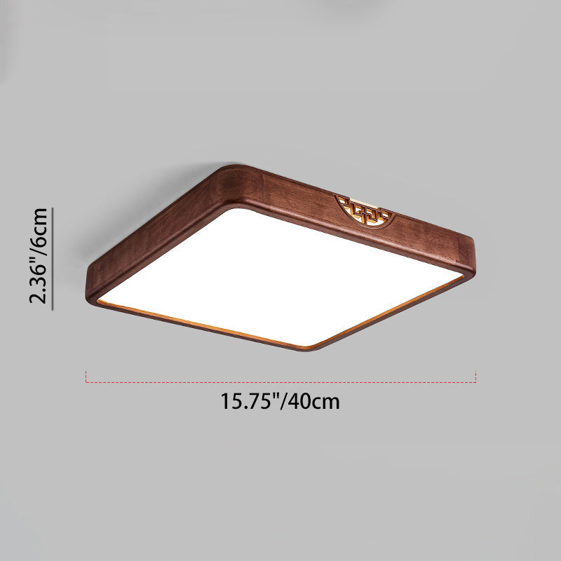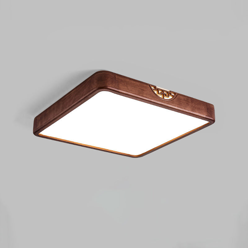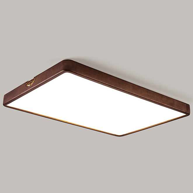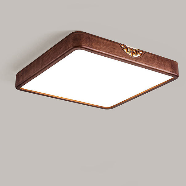 Traditional Chinese Square Rectangle Walnut Grain Rubber Wood Hardware PVC Shade LED Flush Mount Ceiling Light For Living Room