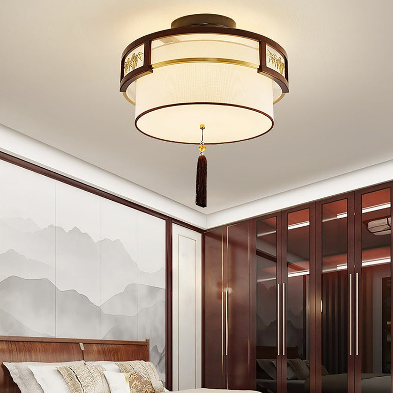 Traditional Chinese Tassels Round Bamboo Carving Fabric Wood Brass 3/5-Light Semi-Flush Mount Ceiling Light For Living Room