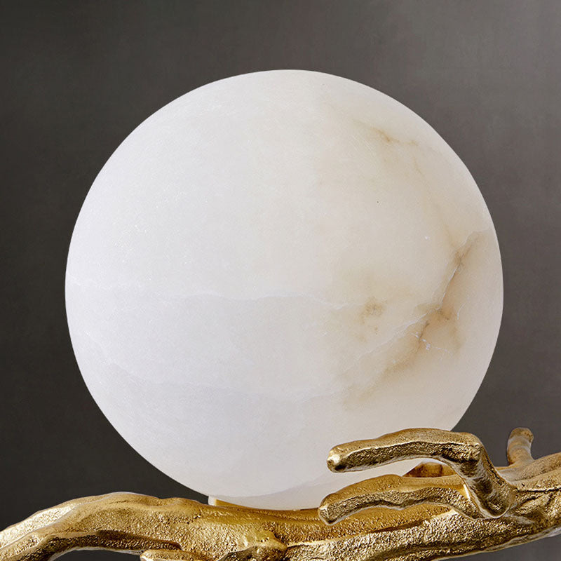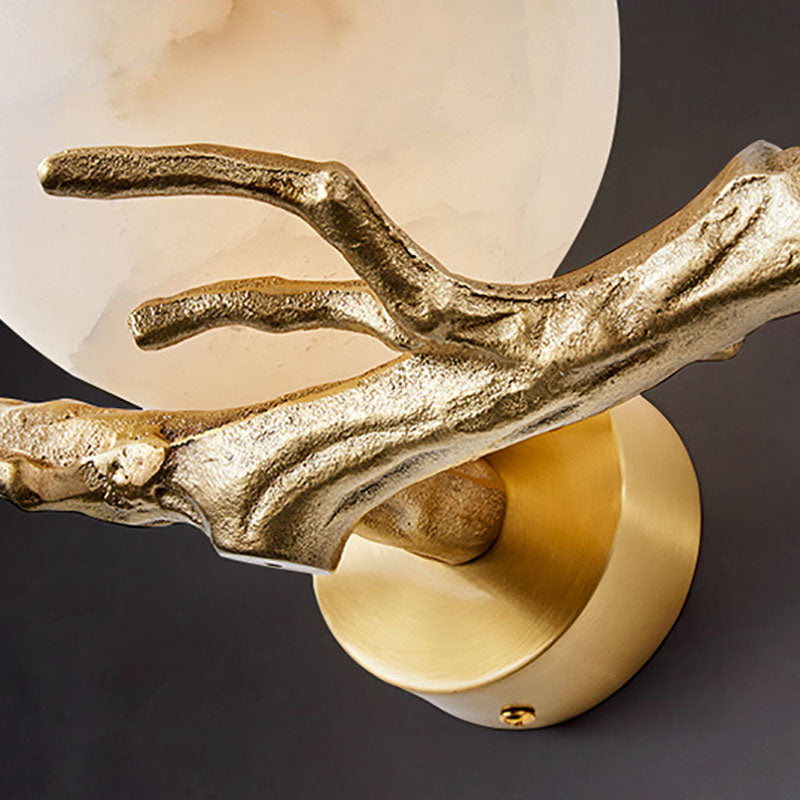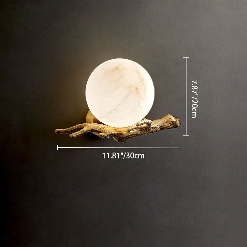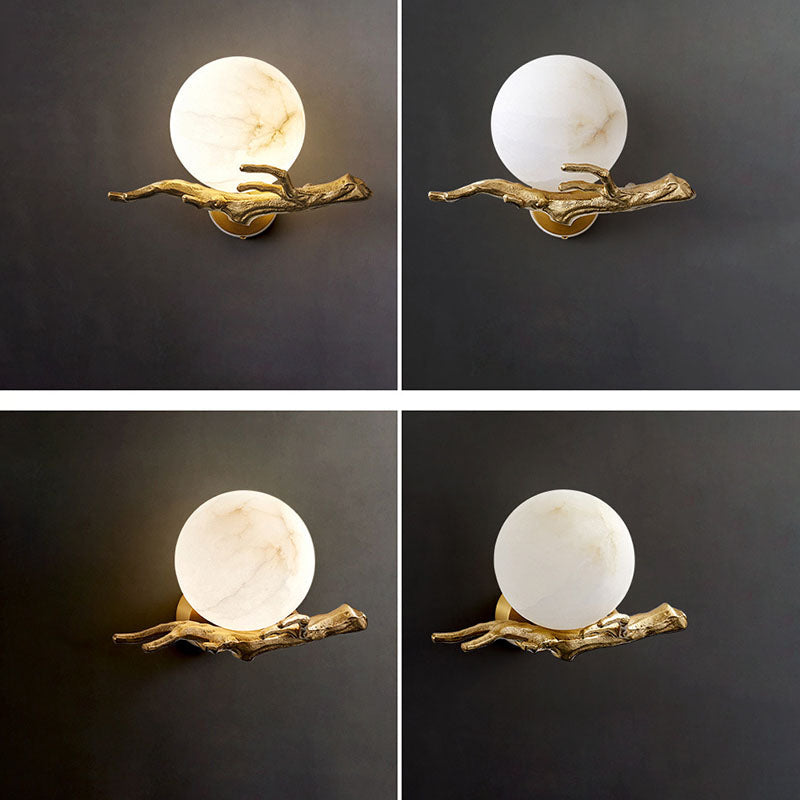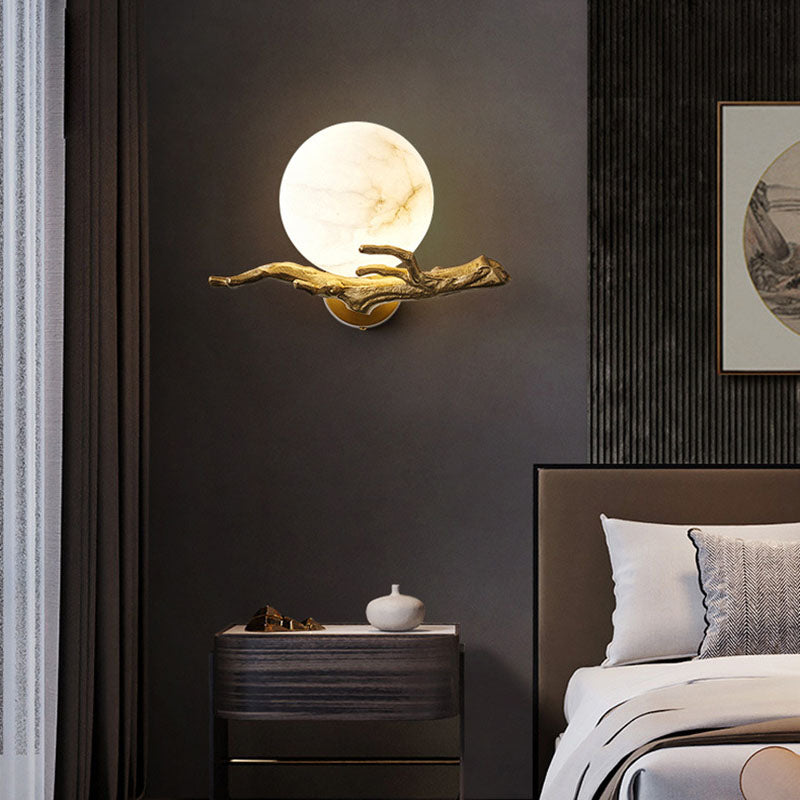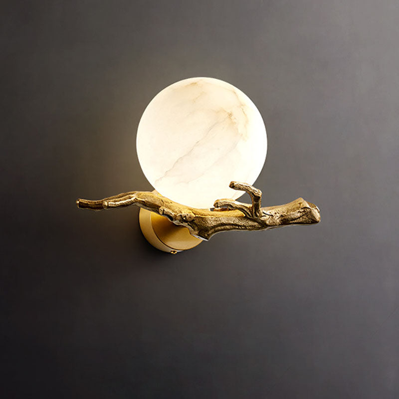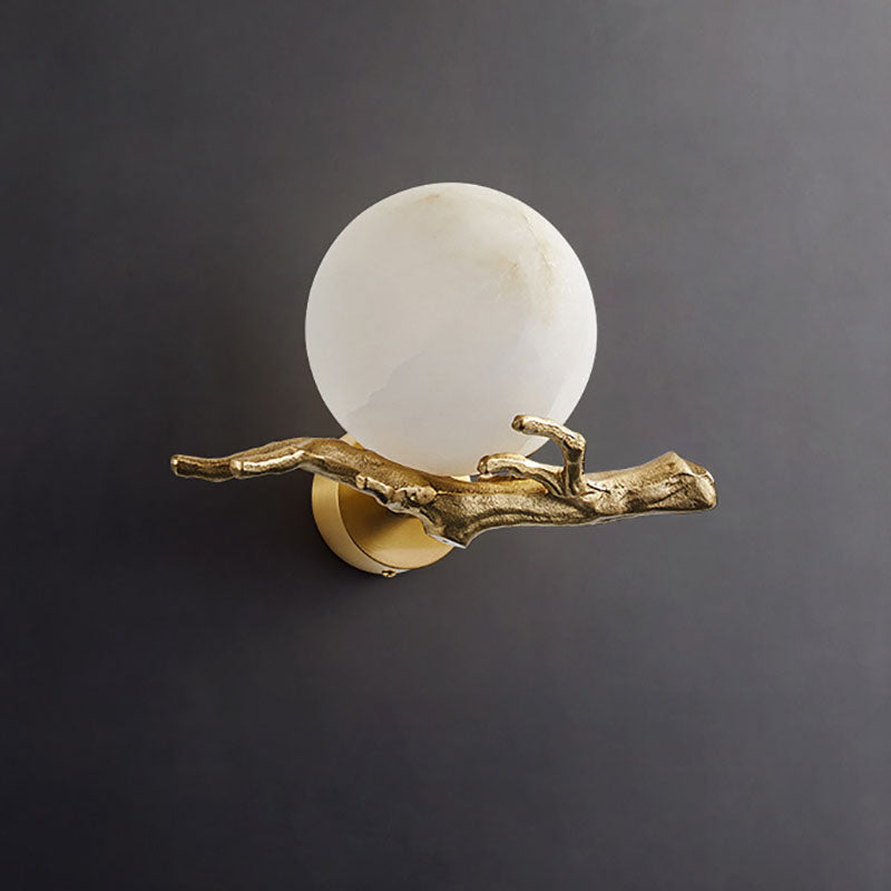 Traditional Chinese Twig Orb Brass Marble LED Wall Sconce Lamp For Living Room