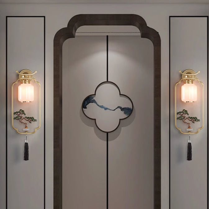 Traditional Chinese Welcoming Pine Sika Deer Iron Hardware Glass 1 - Light Wall Sconce Lamp For Living Room