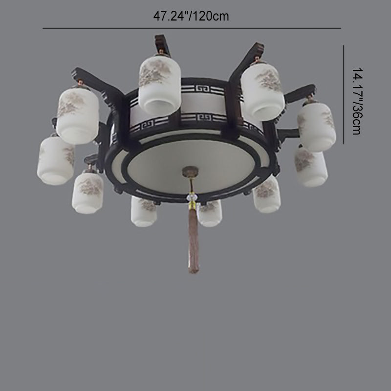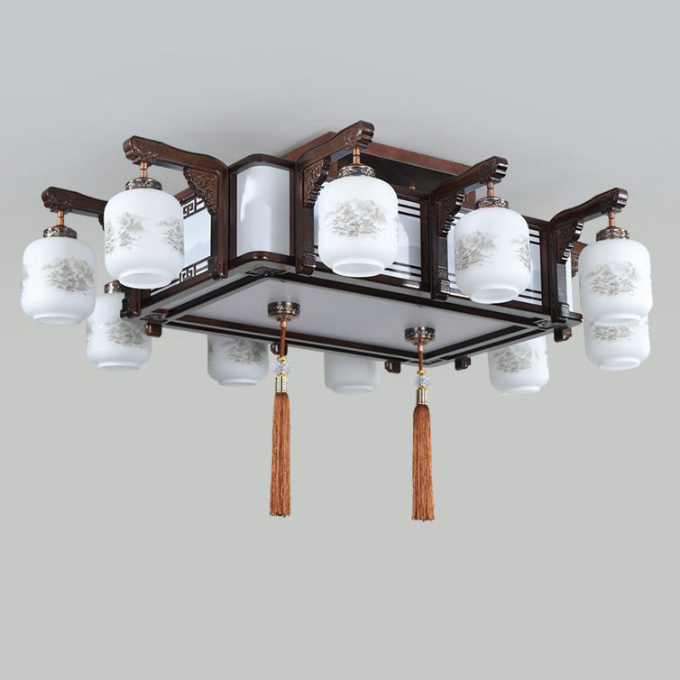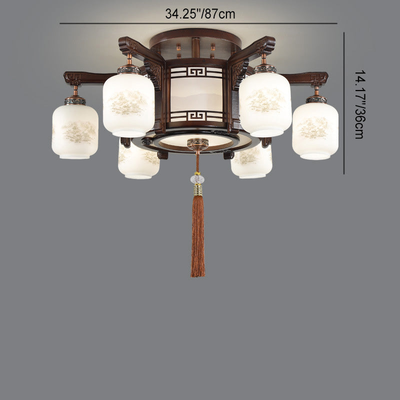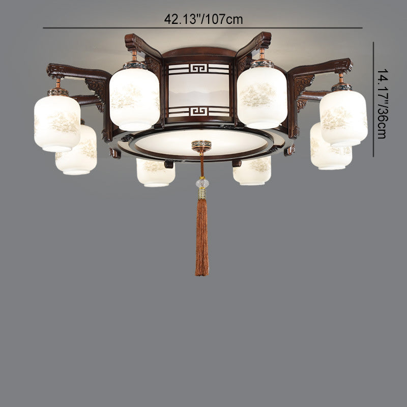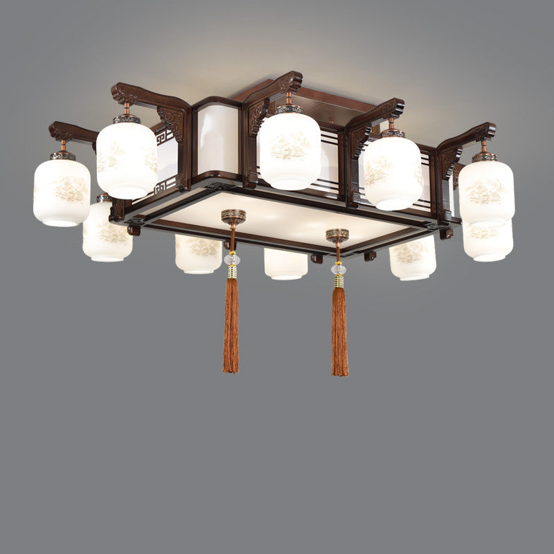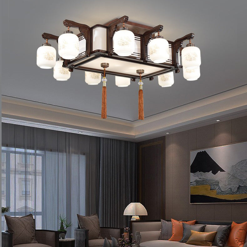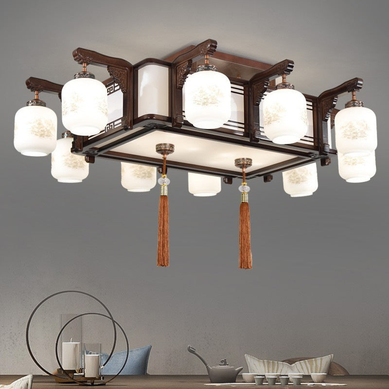 Traditional Chinese Wood Acrylic Glass Round Rectangular Lantern 6/8/10 Light Flush Mount Ceiling Light For Living Room