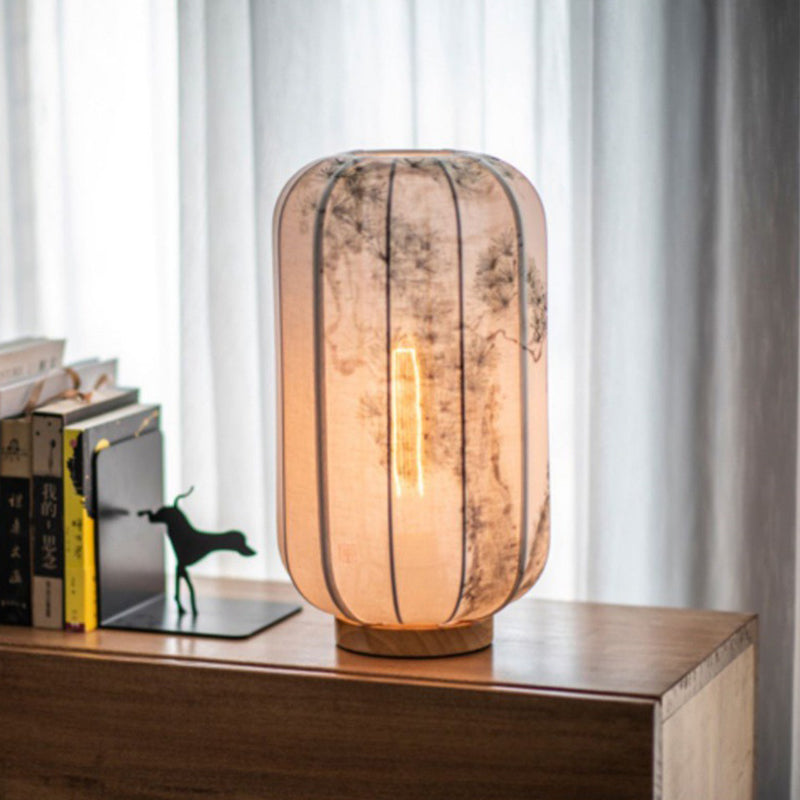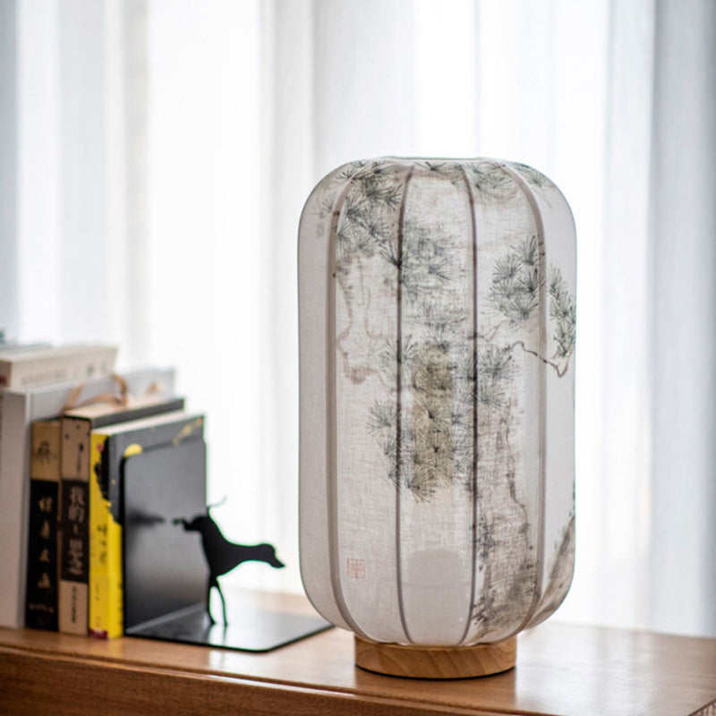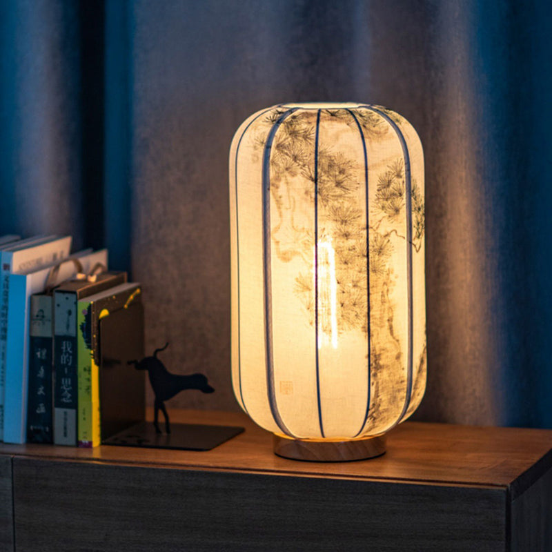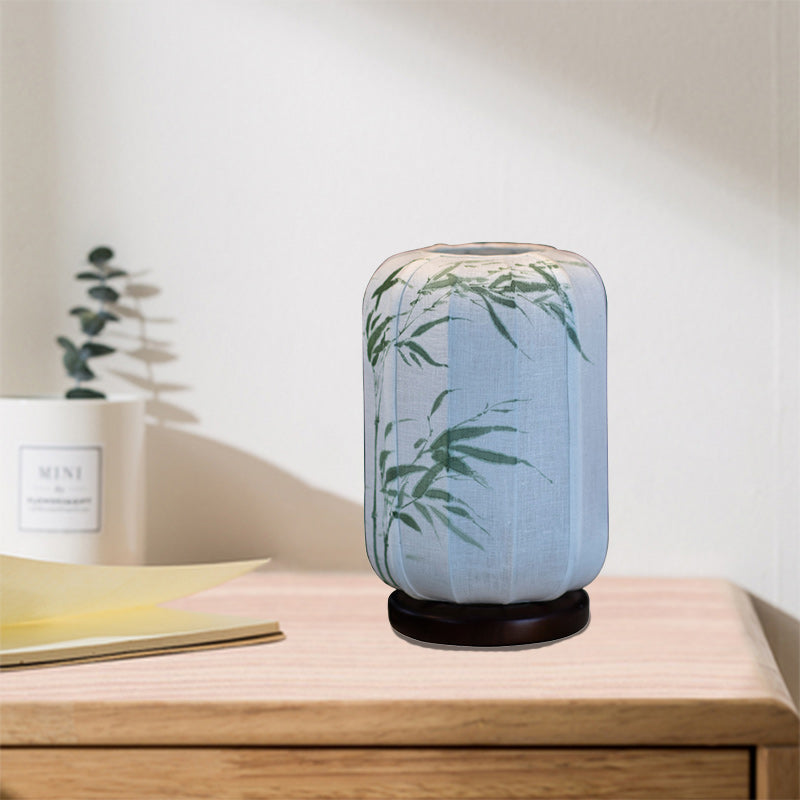 Traditional Chinese Wood Cotton Hemp Cylinder Hand Painted Bamboo Leaf 1-Light Table Lamp For Bedroom