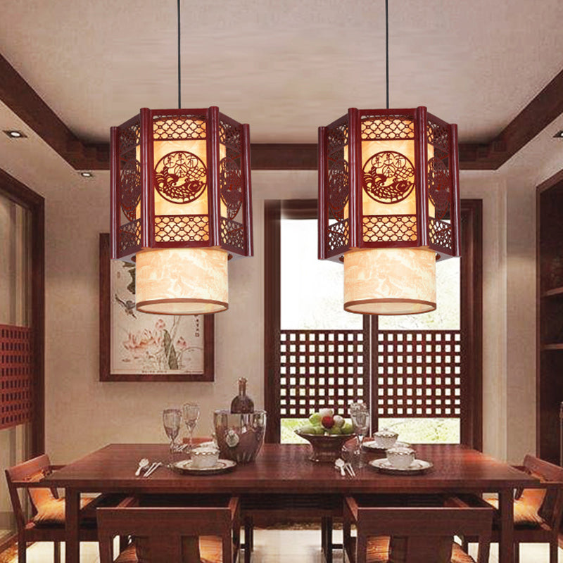 Traditional Chinese Wood PVC Cylinder Lantern Carved Fish 1-Light Pendant Light For Dining Room