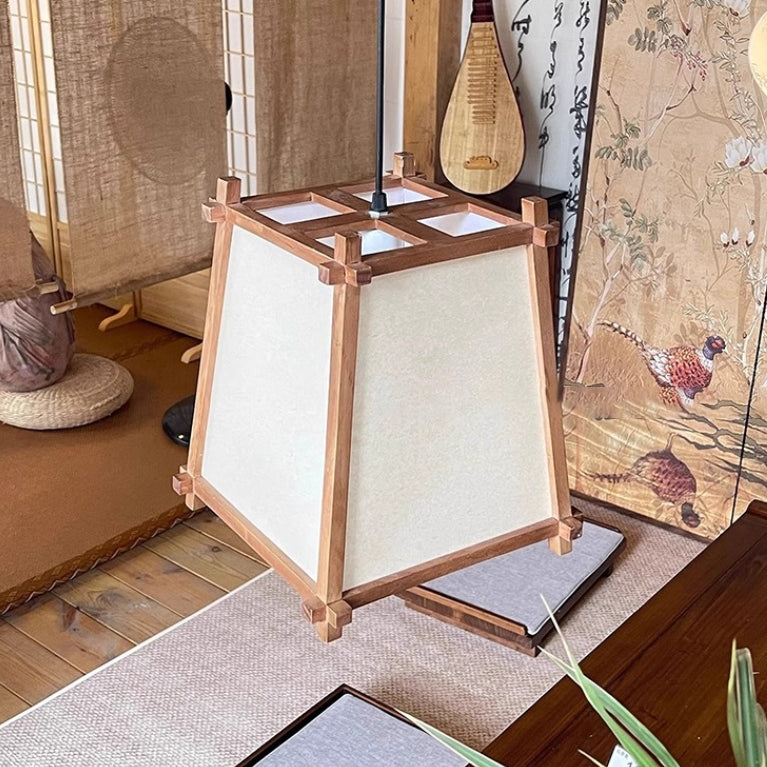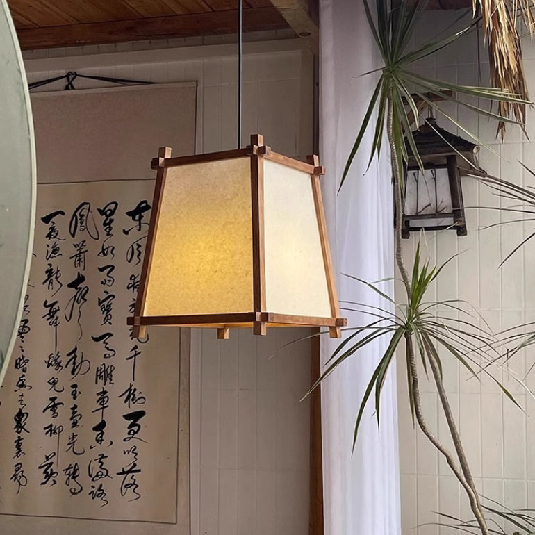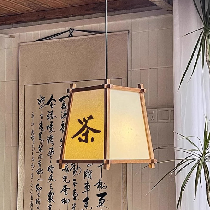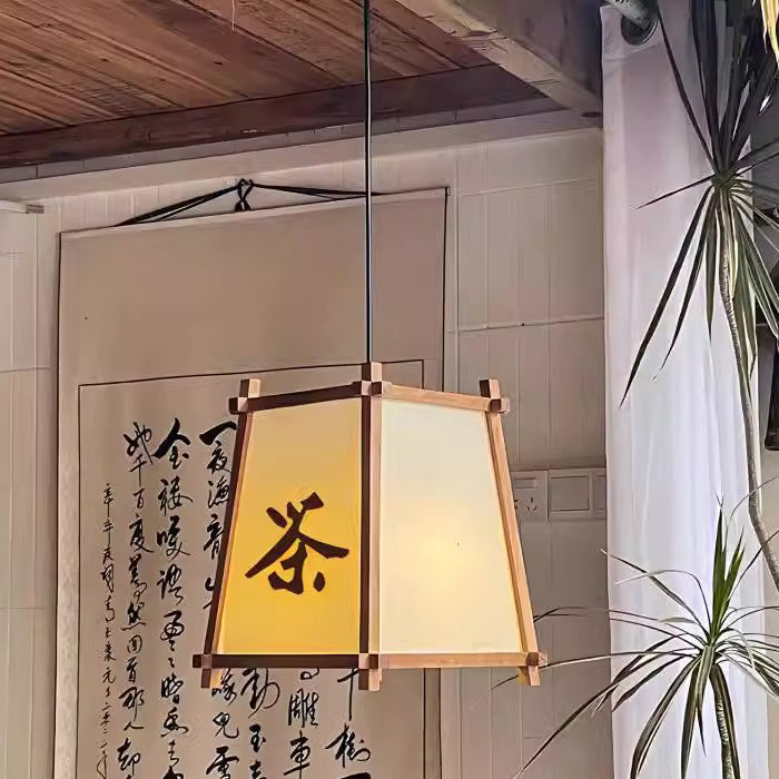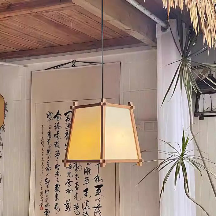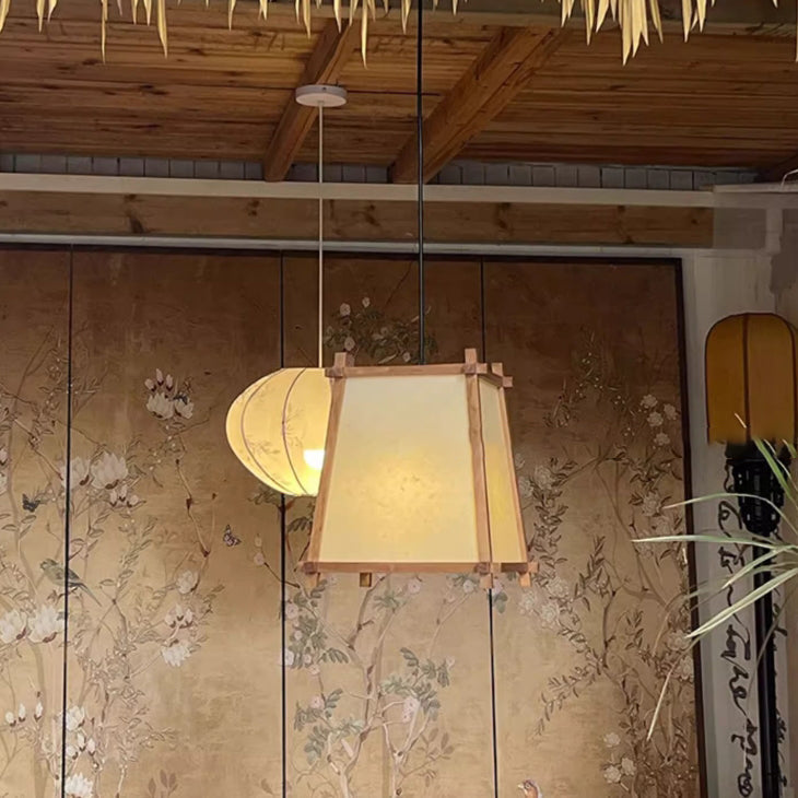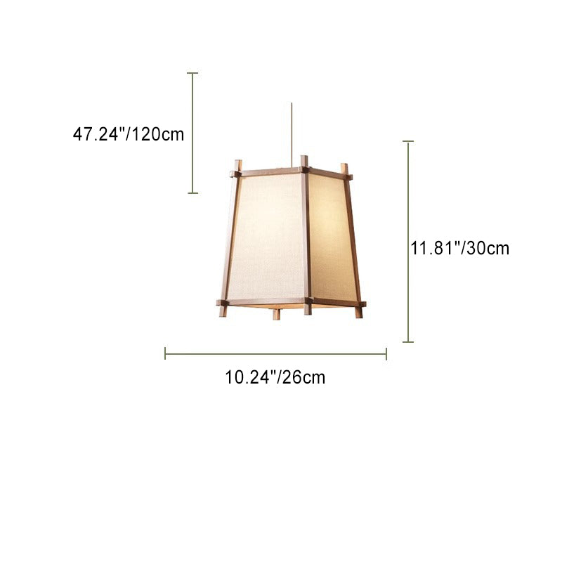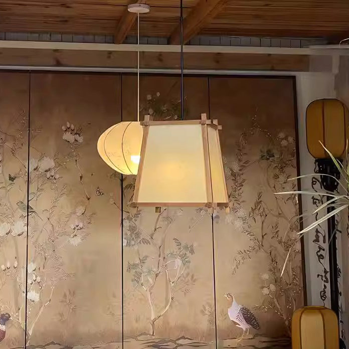 Traditional Chinese Zen Wood Frame Fabric 1-Light Pendant Light For Living Room