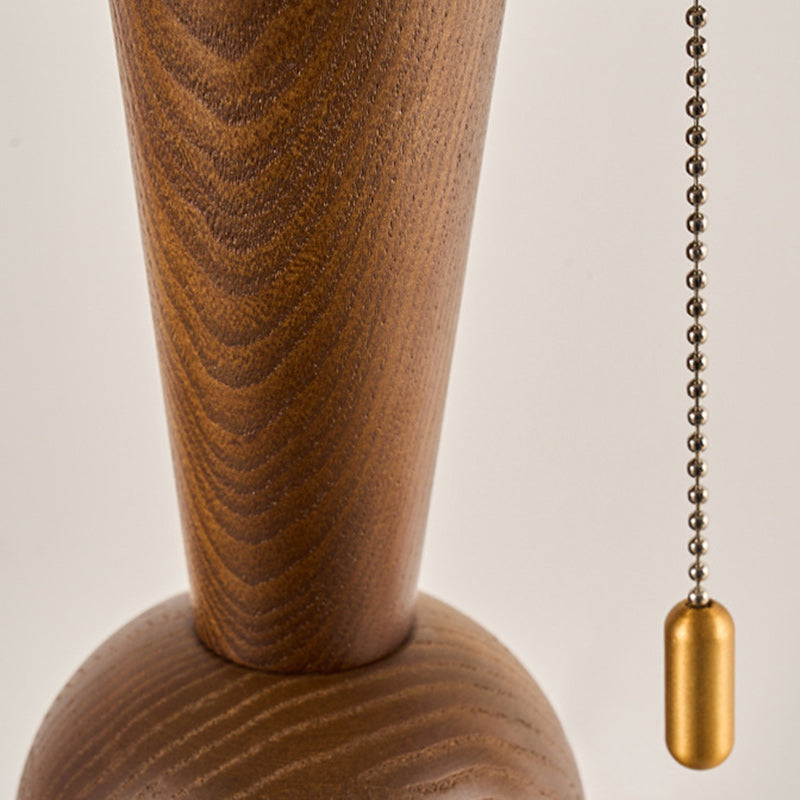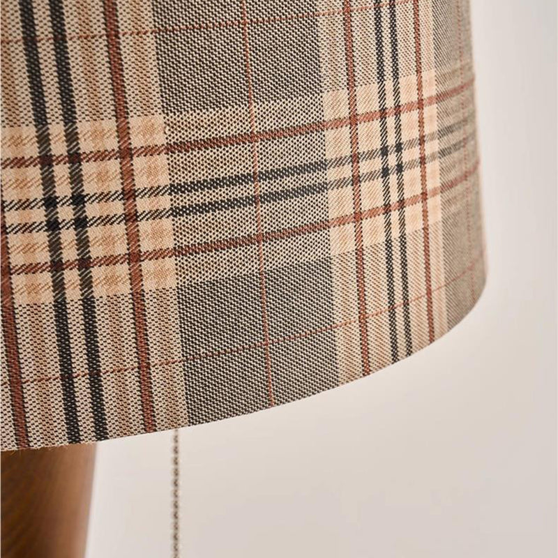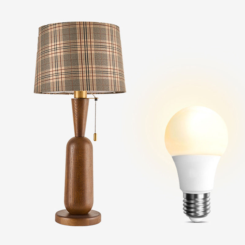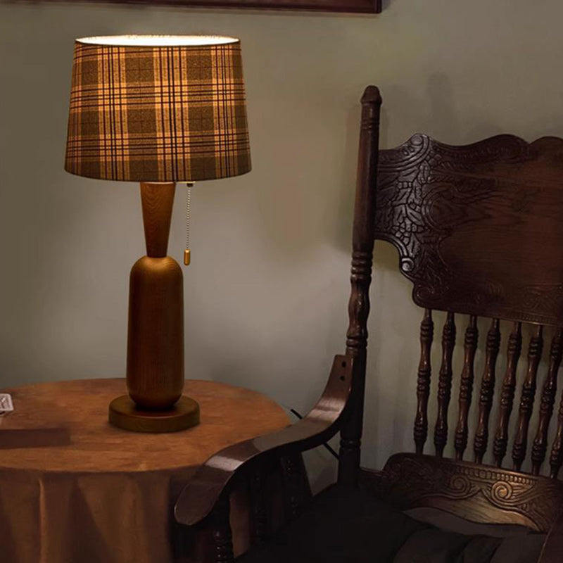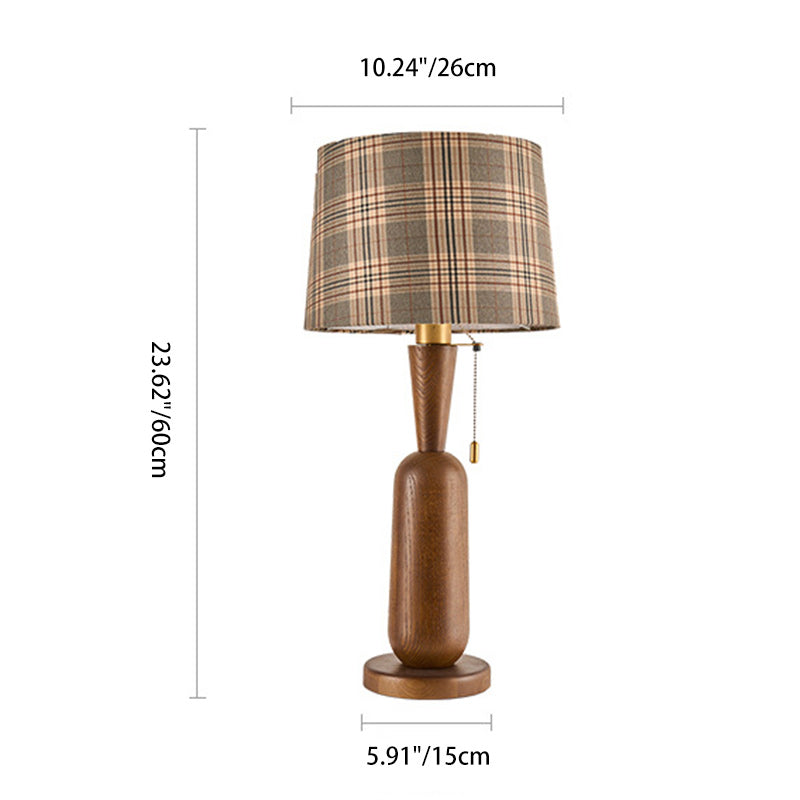 Traditional Colonial Plaid Fabric Round Shade Solid Wood Column Base 1-Light Table Lamp For Bedroom