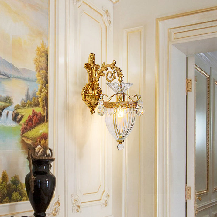 Traditional European Alloy Brass Glass Crystal Teardrop-Shaped Carved 1/2 Light Wall Sconce Lamp For Living Room