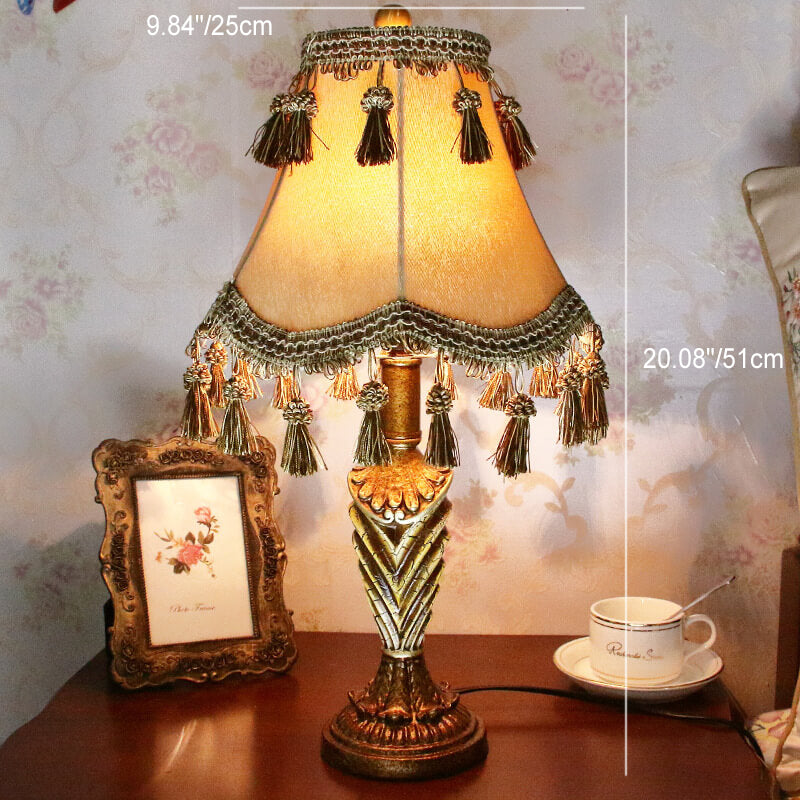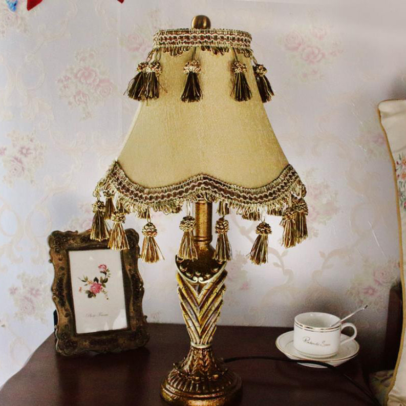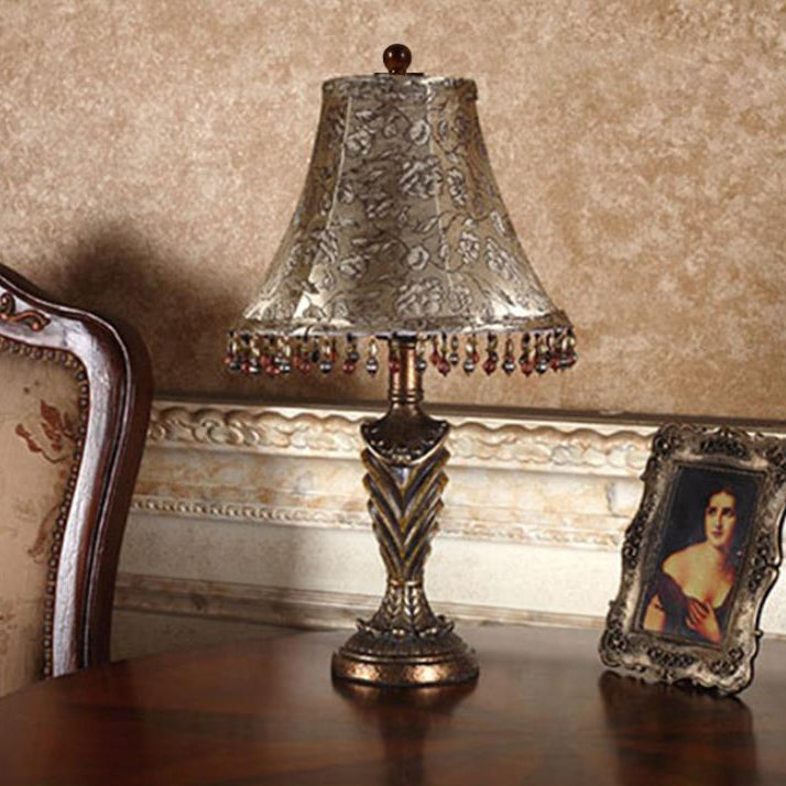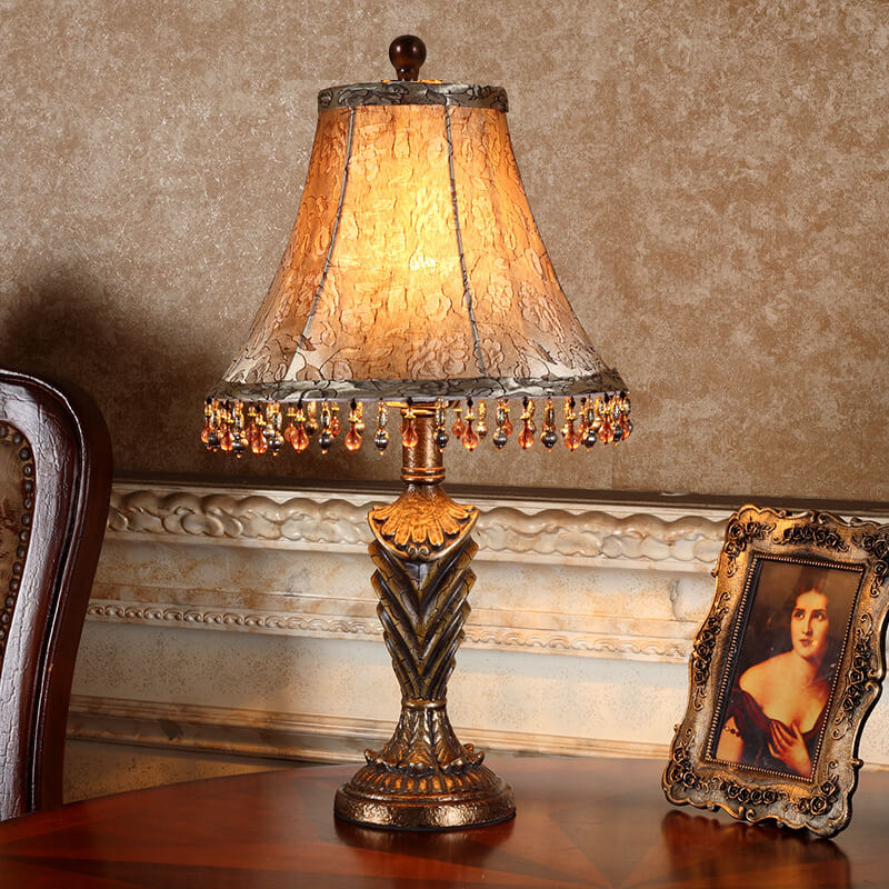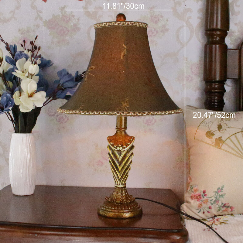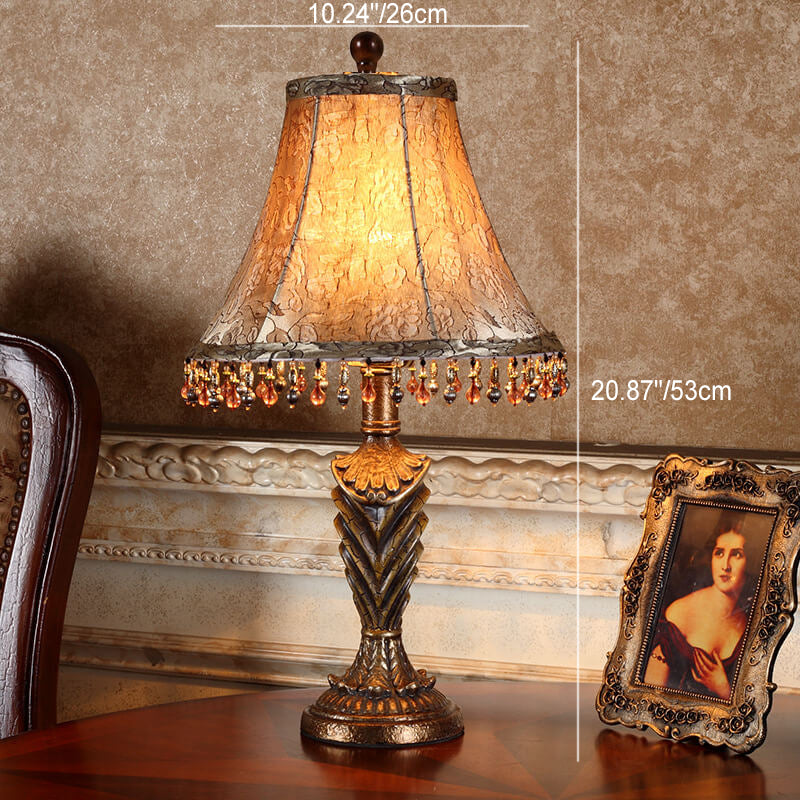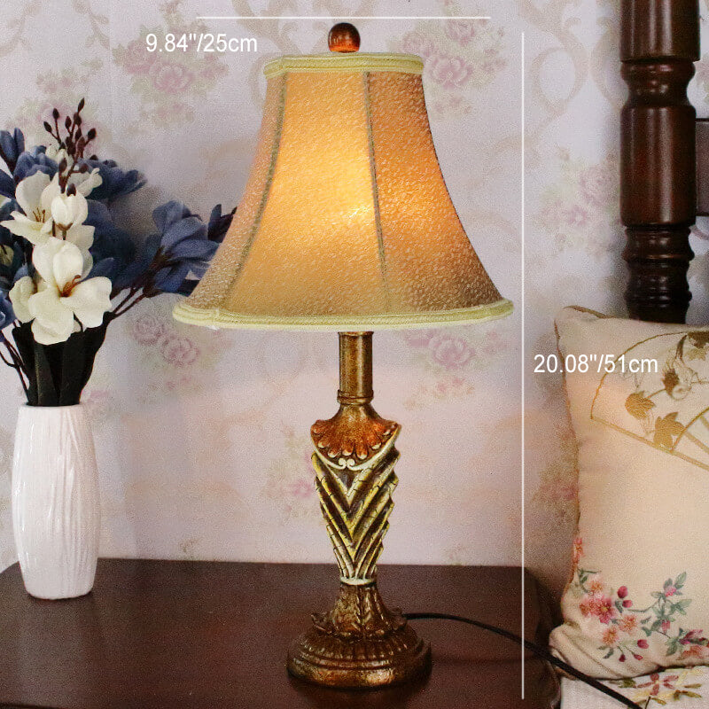 Traditional European Cylinder Carved Stripe Base Resin Fabric 1-Light Table Lamp For Bedroom