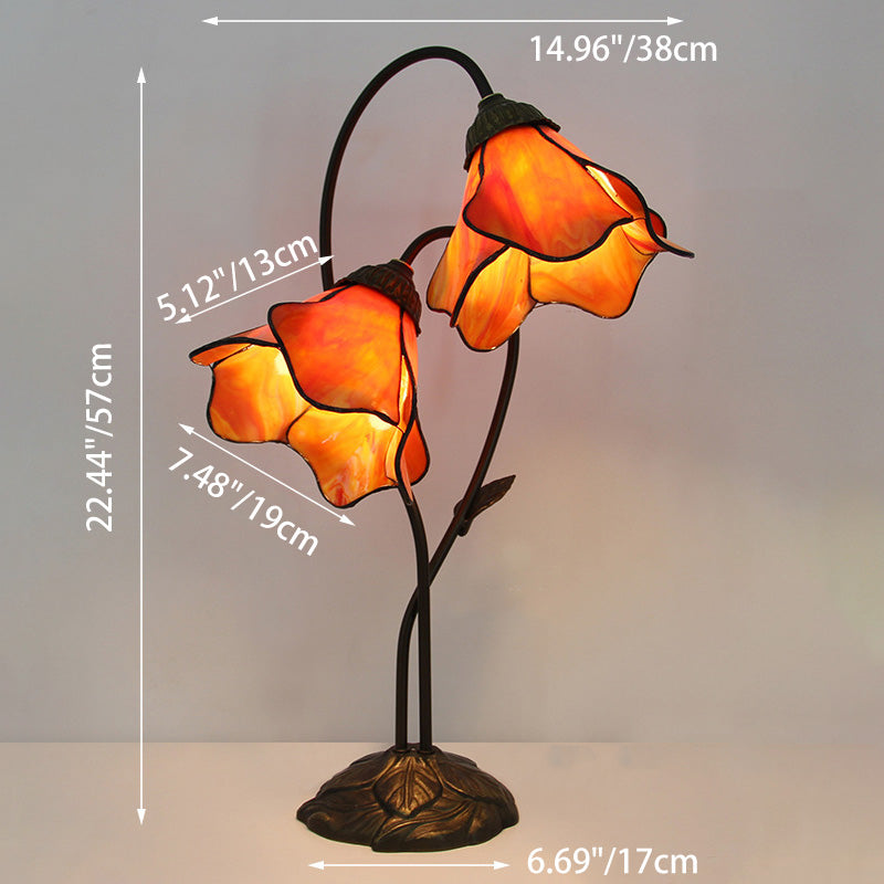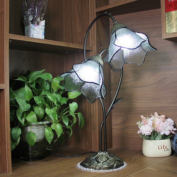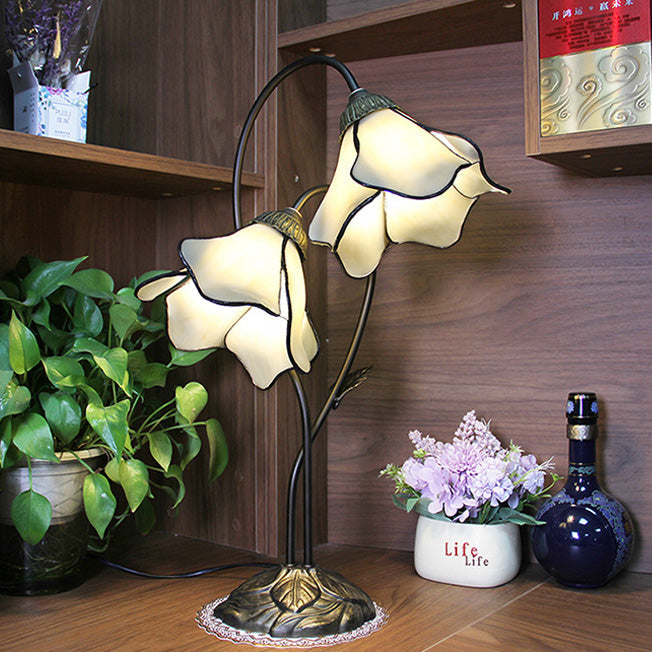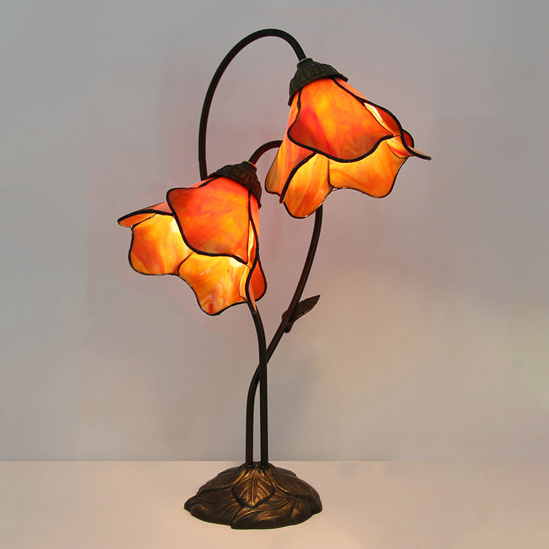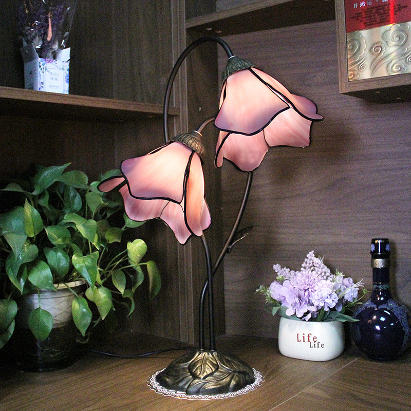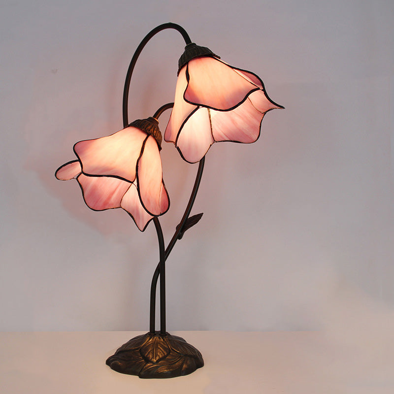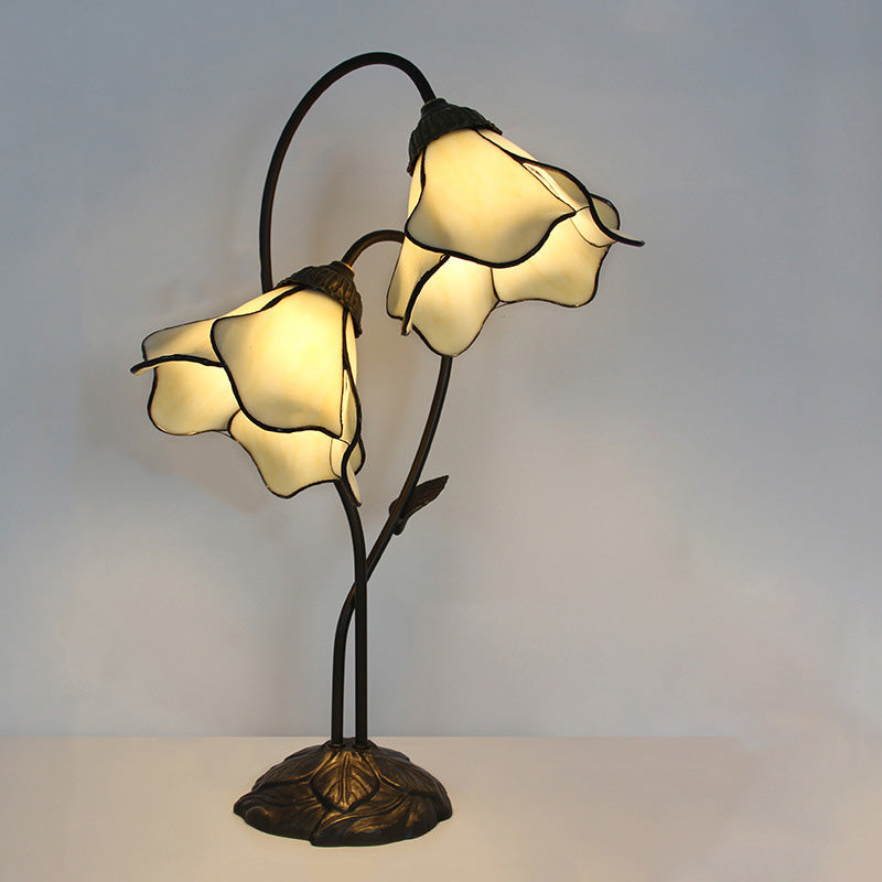 Traditional European Lotus Glass Shade Resin Base 2-Light Table Lamp For Bedroom
