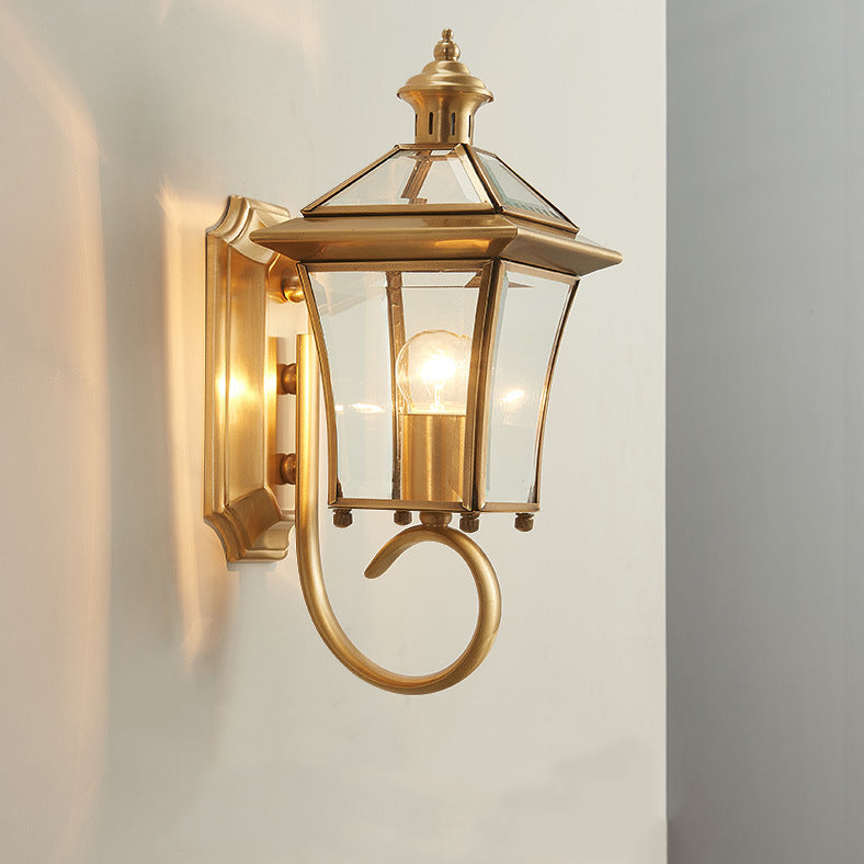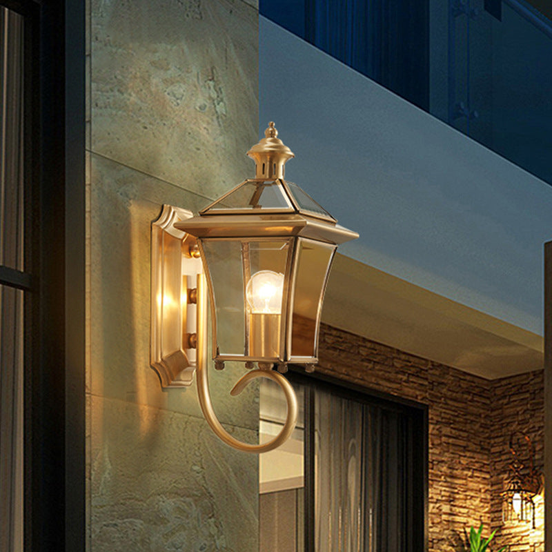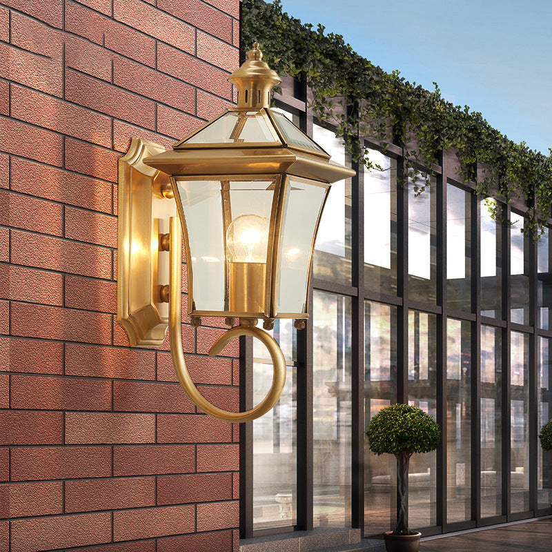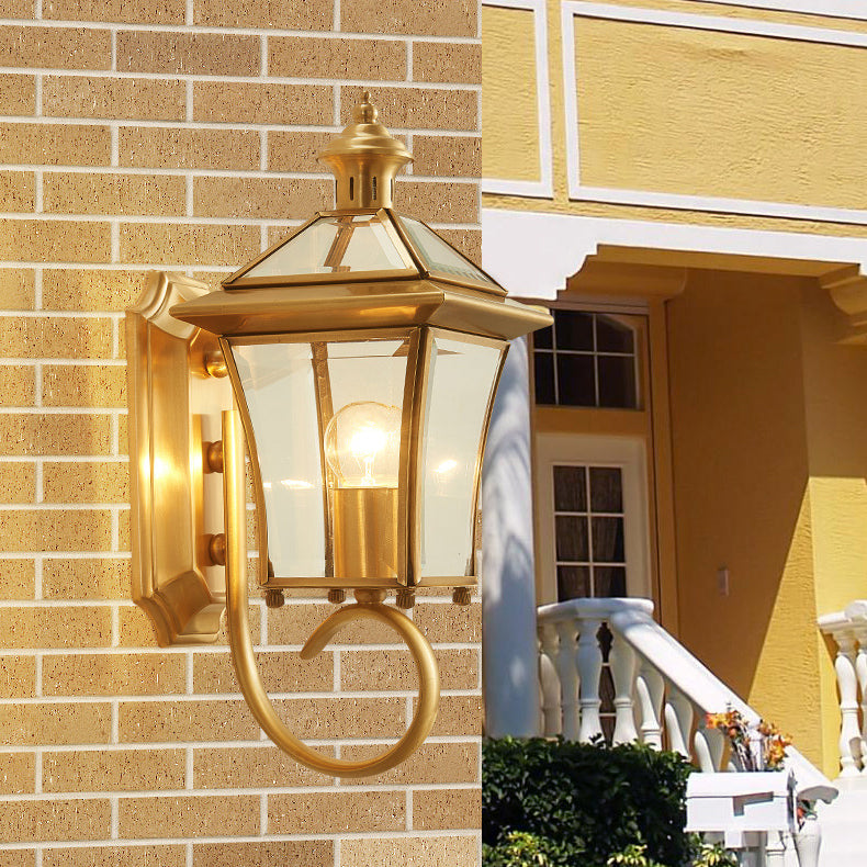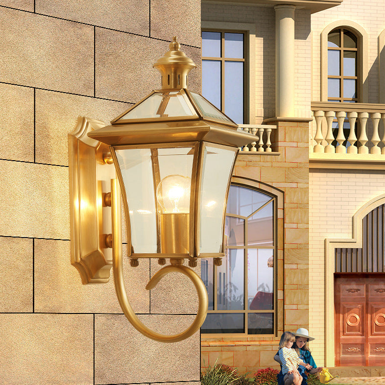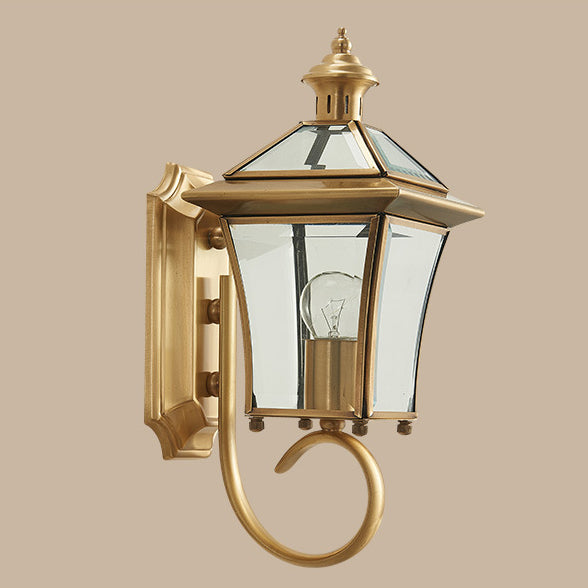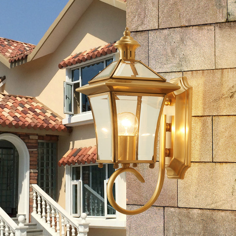 Traditional European Quadrangle Candle Holder Copper Frame Glass Shade 1-Light Wall Sconce Lamp For Garden