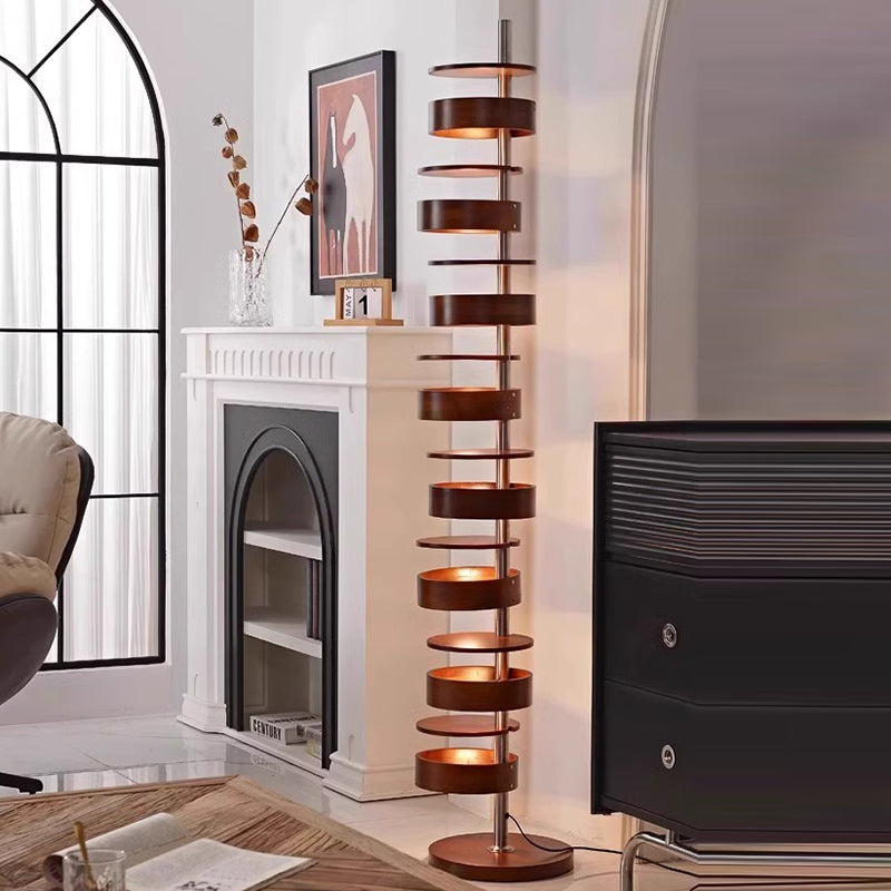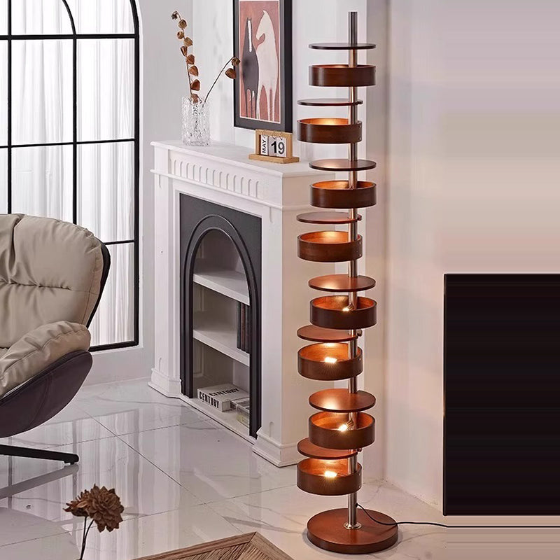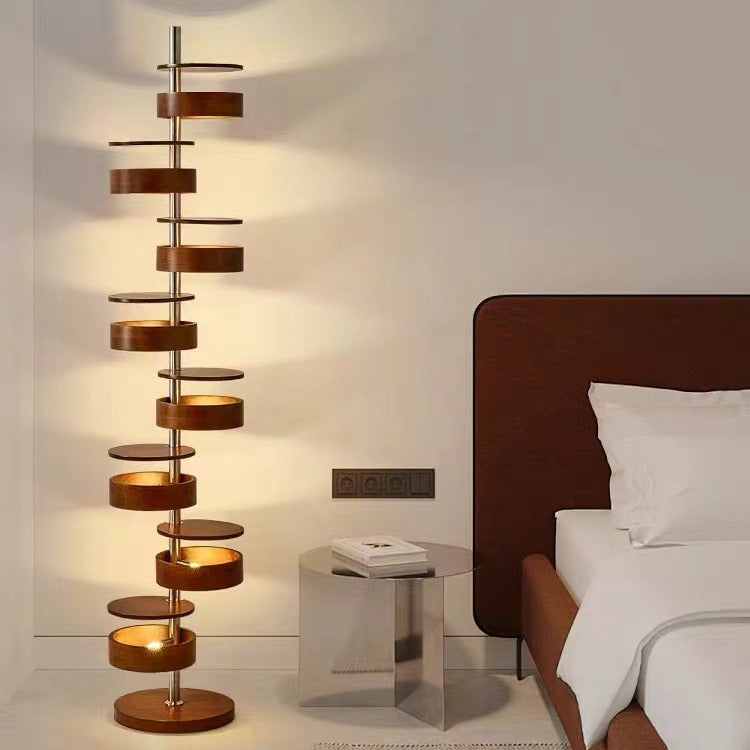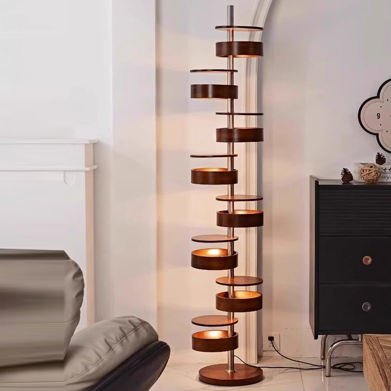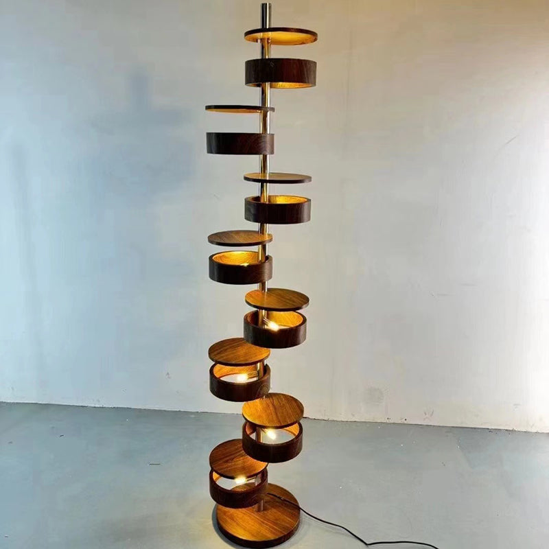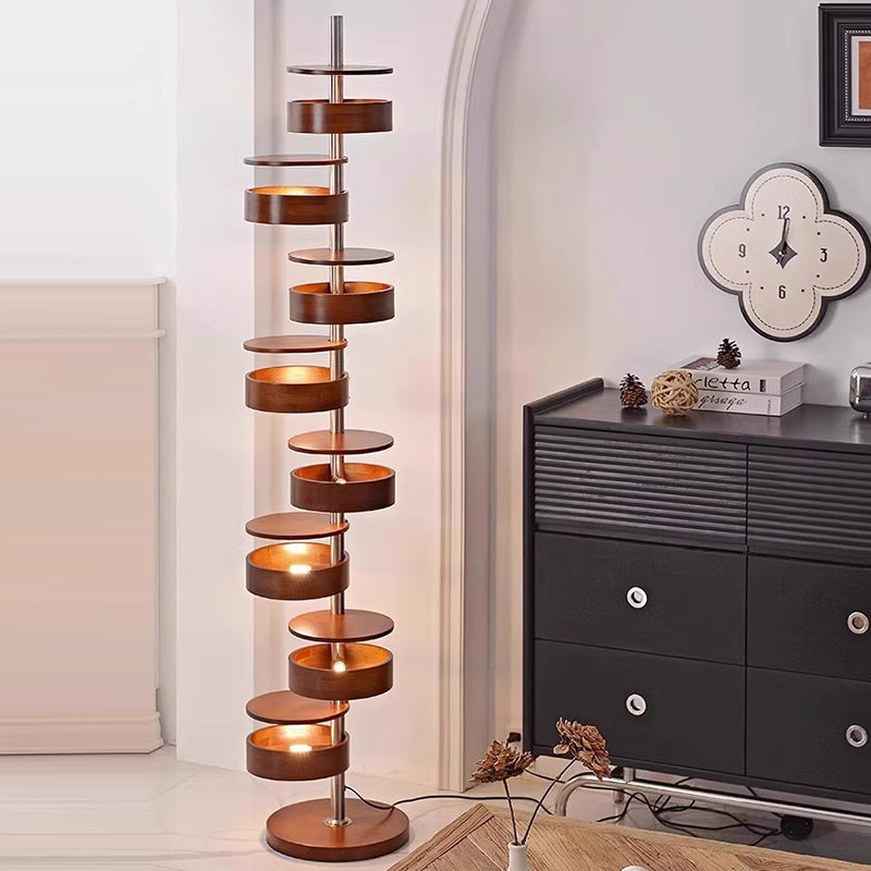 Traditional French Ash Wood Circle Ring Stacking Stainless Steel 8-Light Standing Floor Lamp For Home Office