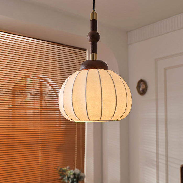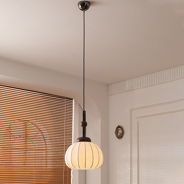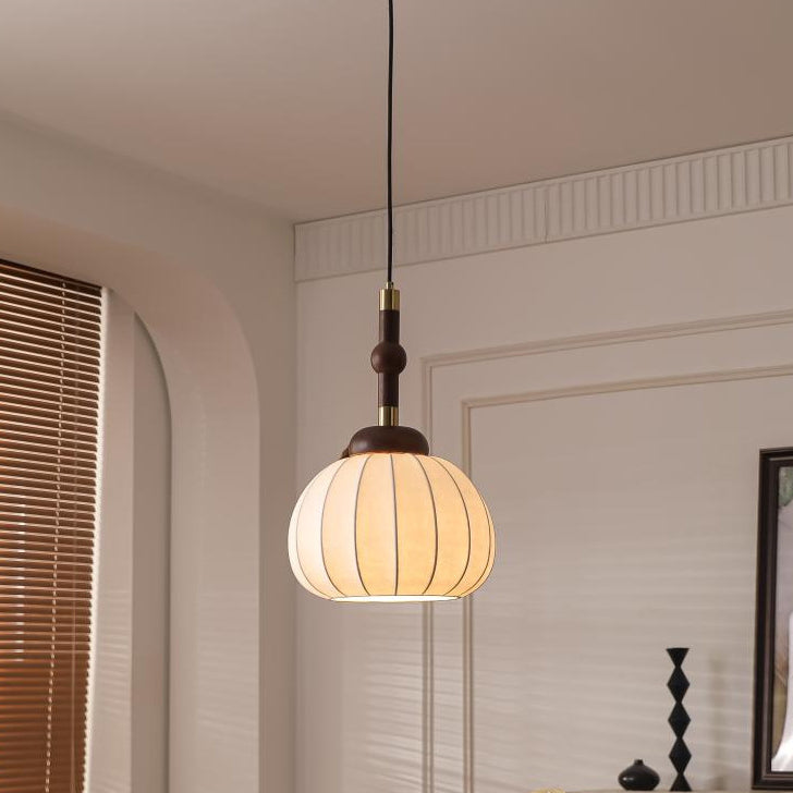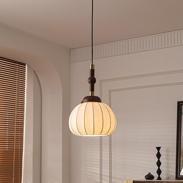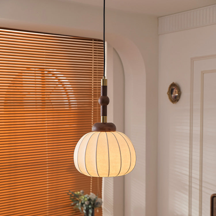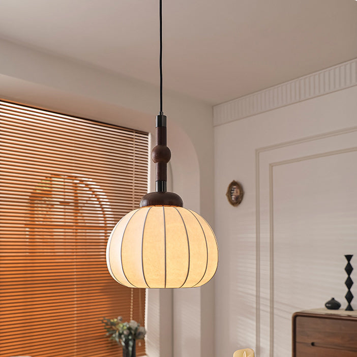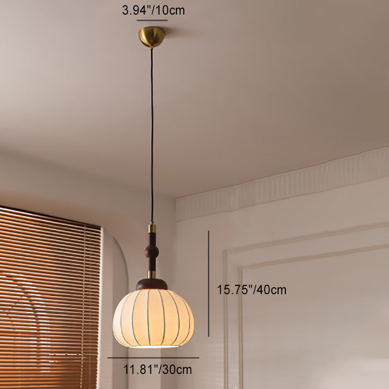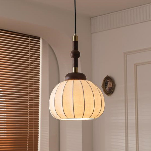 Traditional French Cylinder Lantern Shape Aluminum Wood Frame Silk Shade 1-Light Pendant Light For Living Room