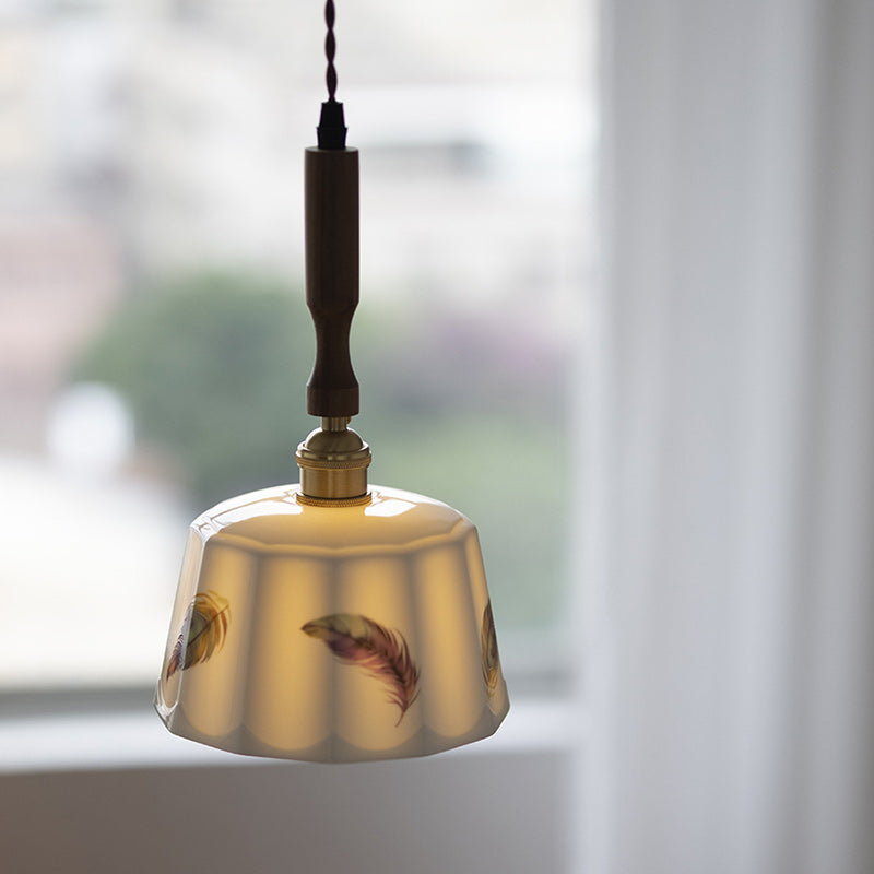 Traditional French Feather Pattern Glazed Ceramic Round Shade Walnut Wood Brass 1-Light Pendant Light For Living Room
