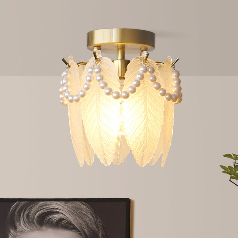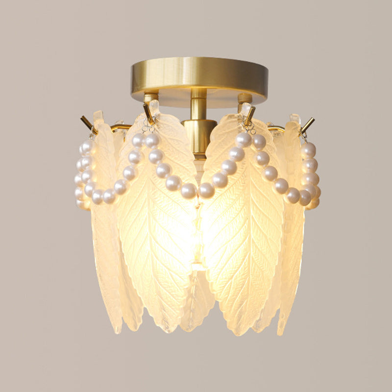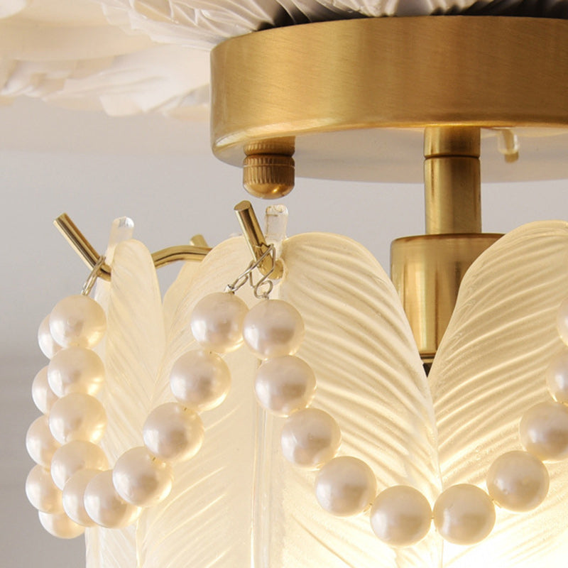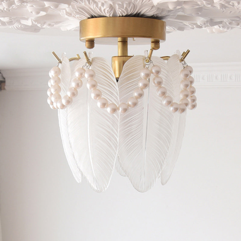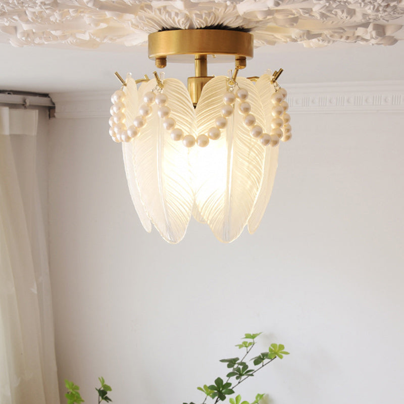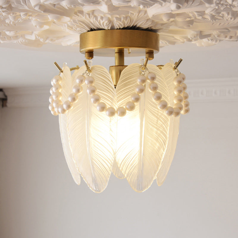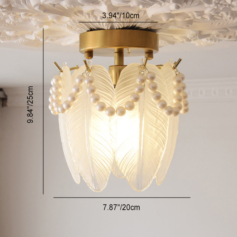 Traditional French Feather Shape Hanging Pearl Edge Iron Glass 1- Light Semi-Flush Mount Ceiling Light For Bedroom