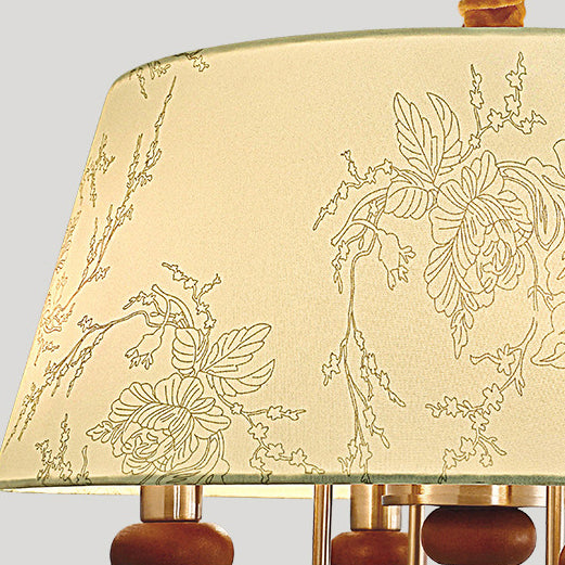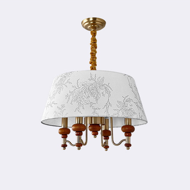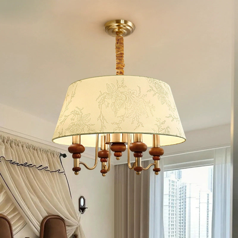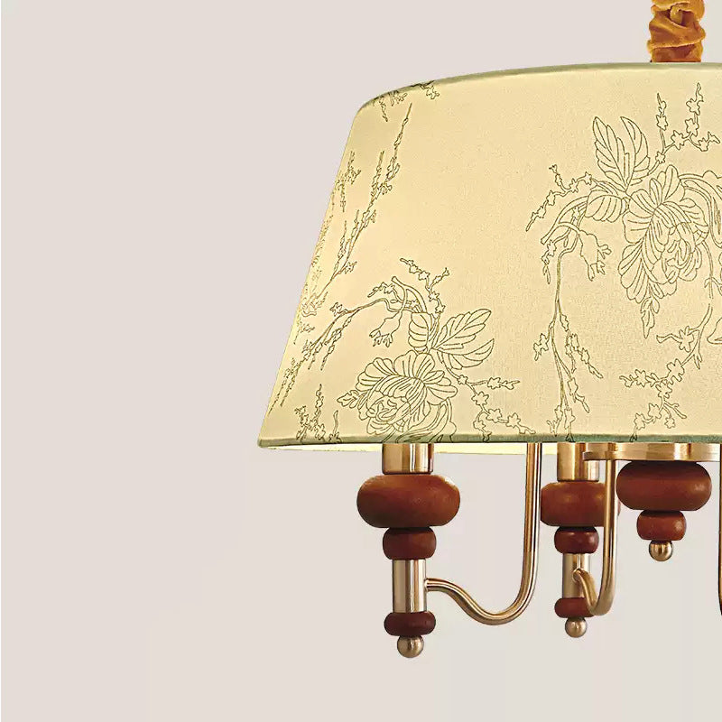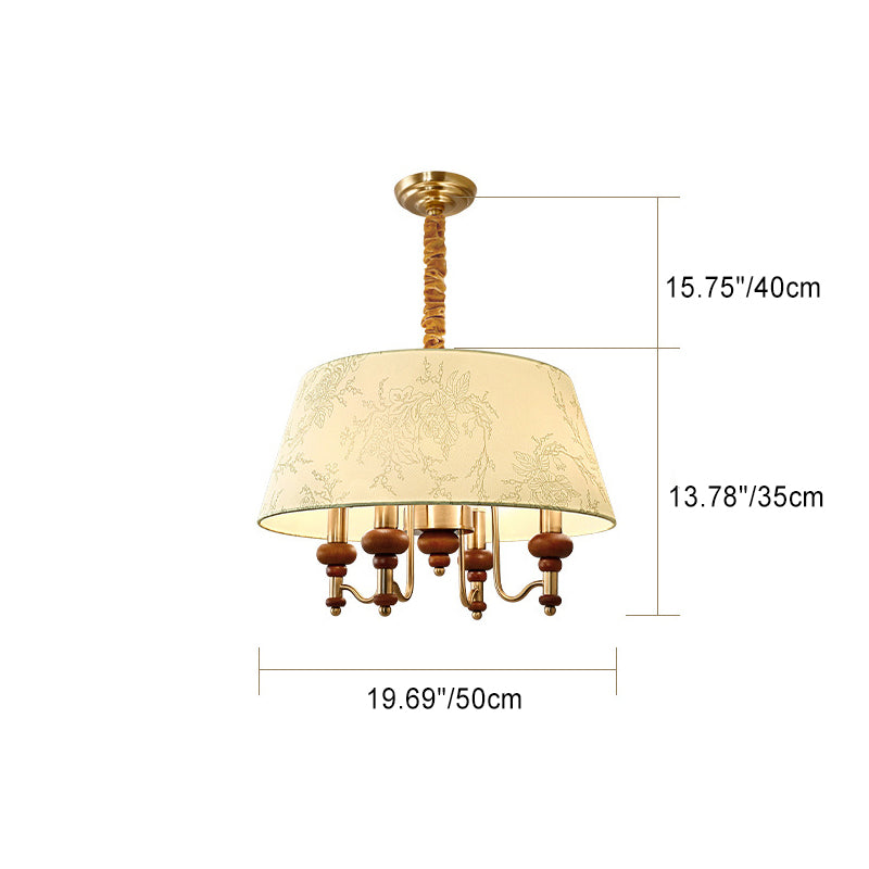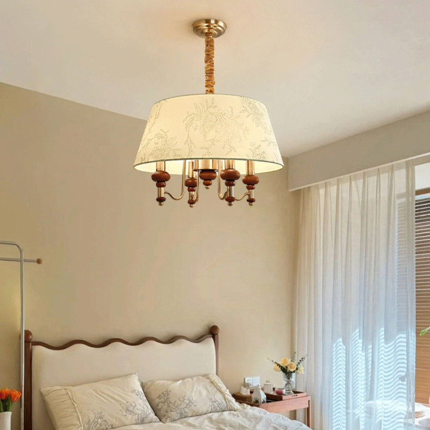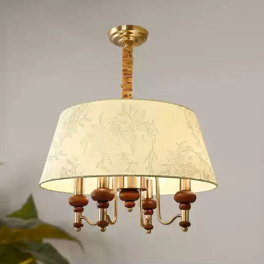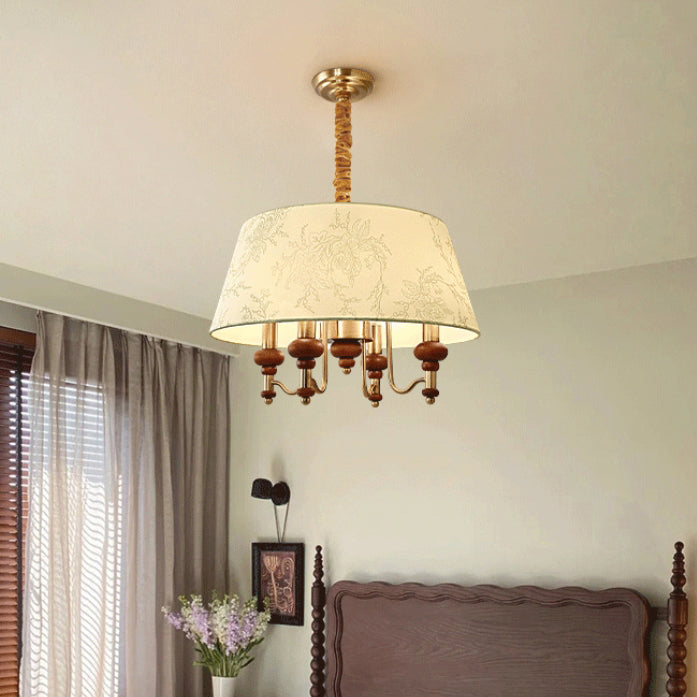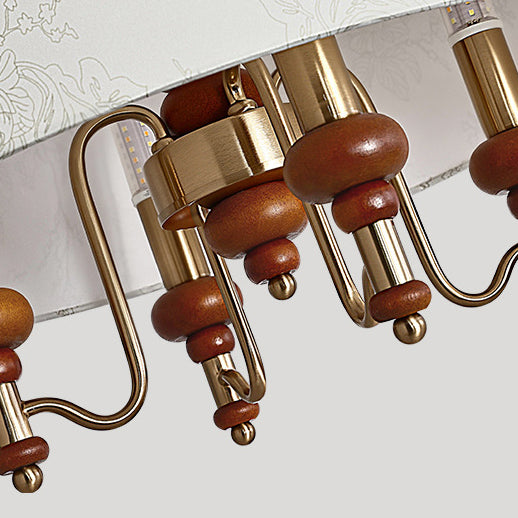 Traditional French Round Candle Holder Solid Wood Iron Frame Fabric Shade 4-Light Chandelier For Living Room