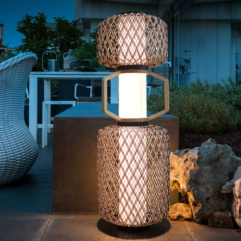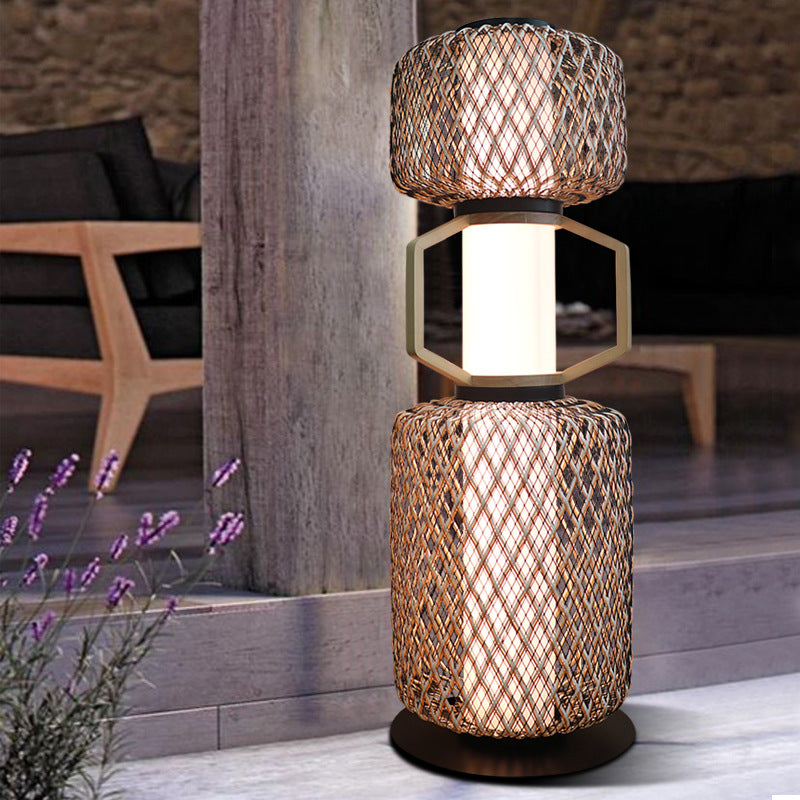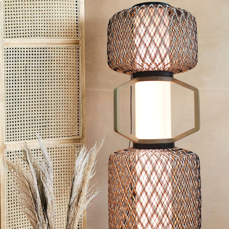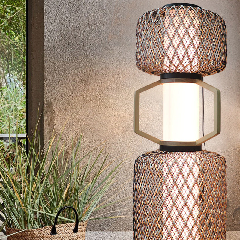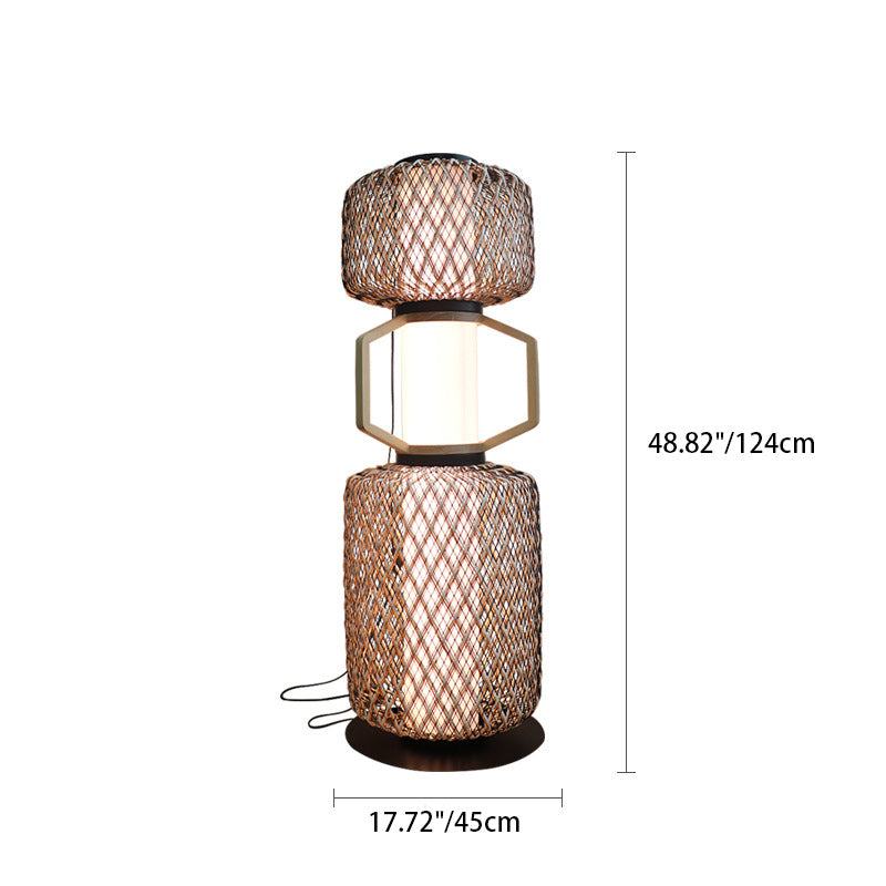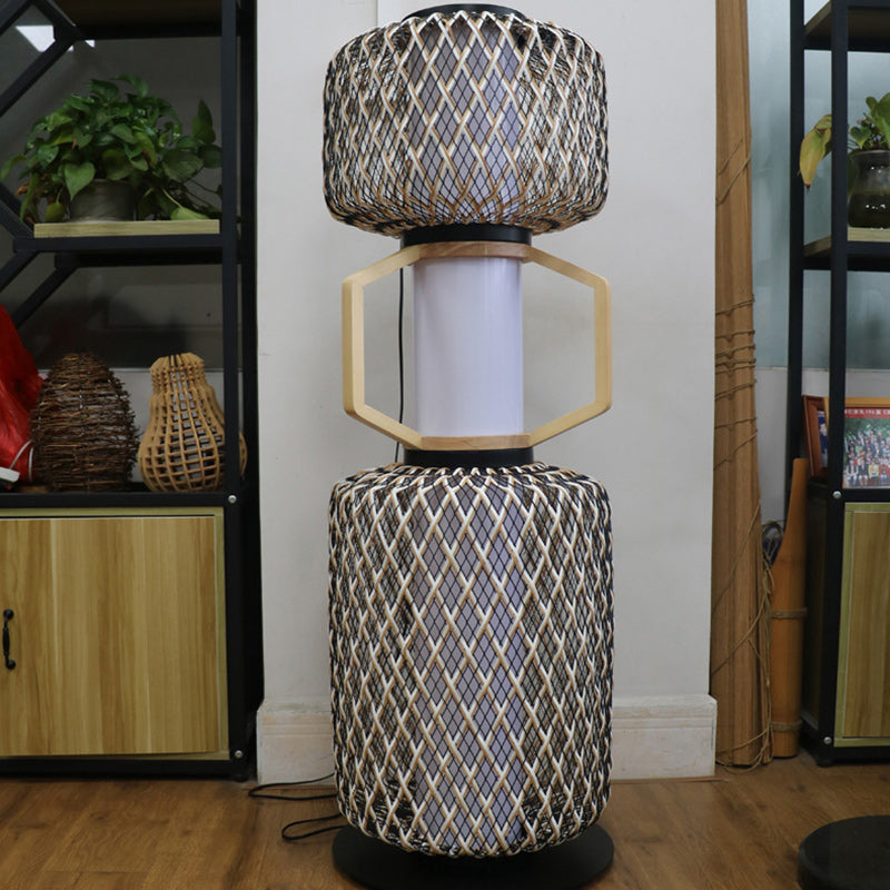Traditional Japanese Cylinder Lantern Mesh Iron Solid Wood Rattan LED Standing Floor Lamp For Living Room
