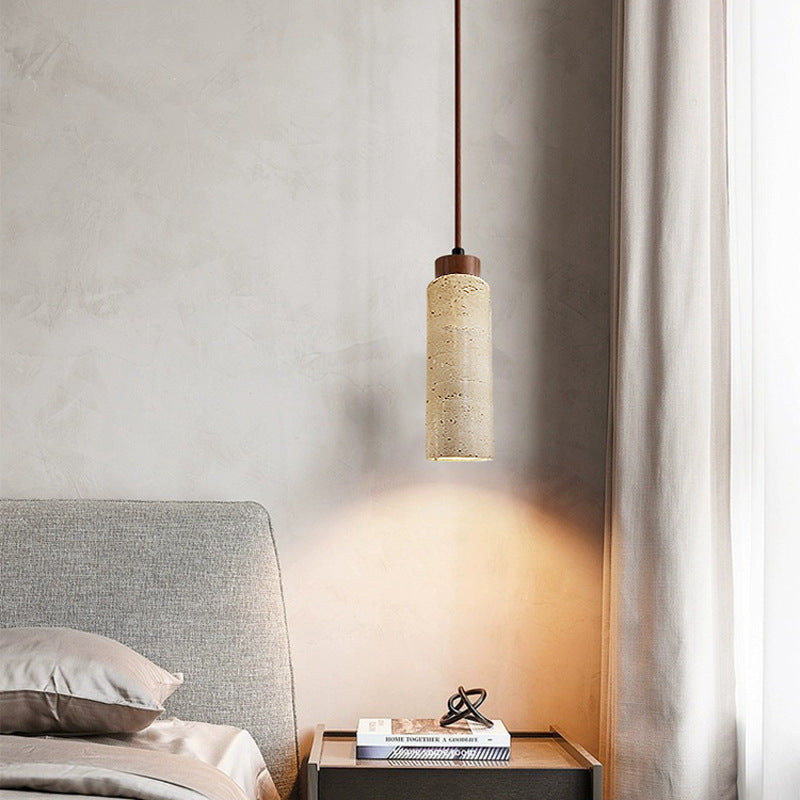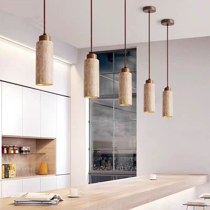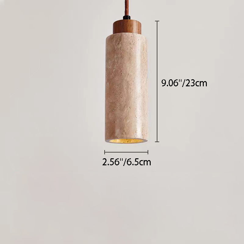 Traditional Japanese Cylinder Yellow Travertine Wood 1-Light Pendant Light For Living Room