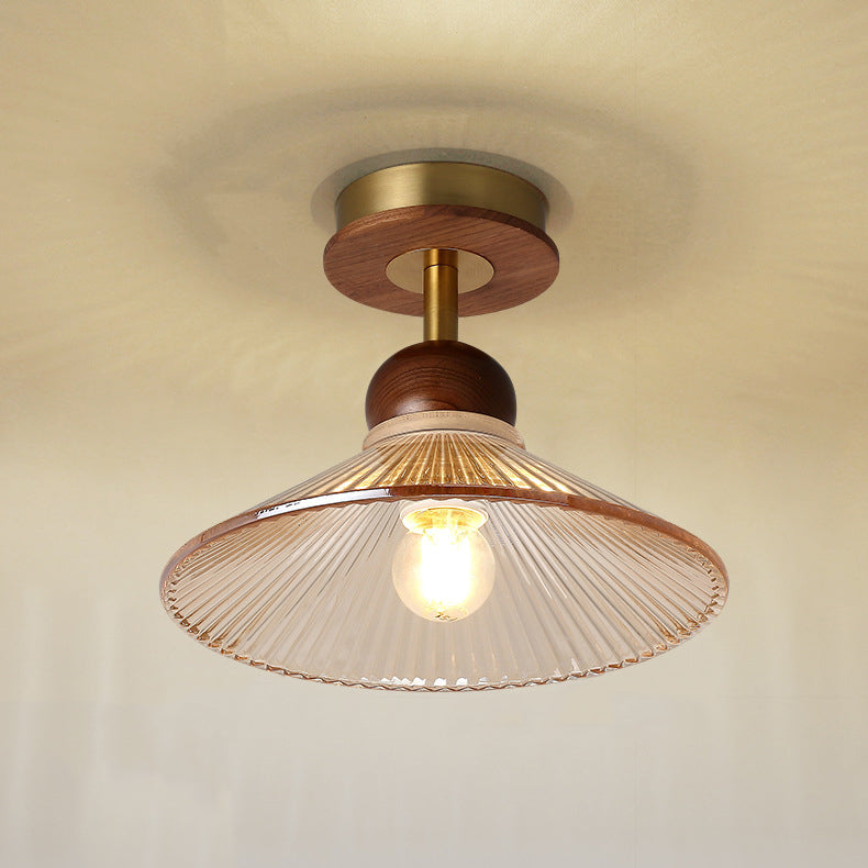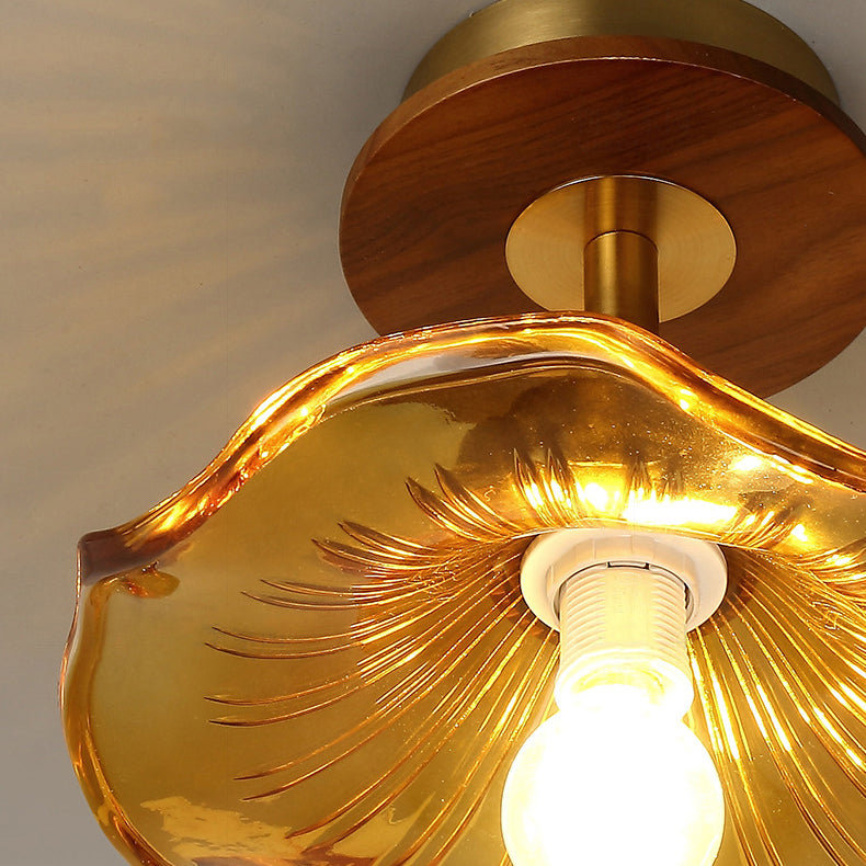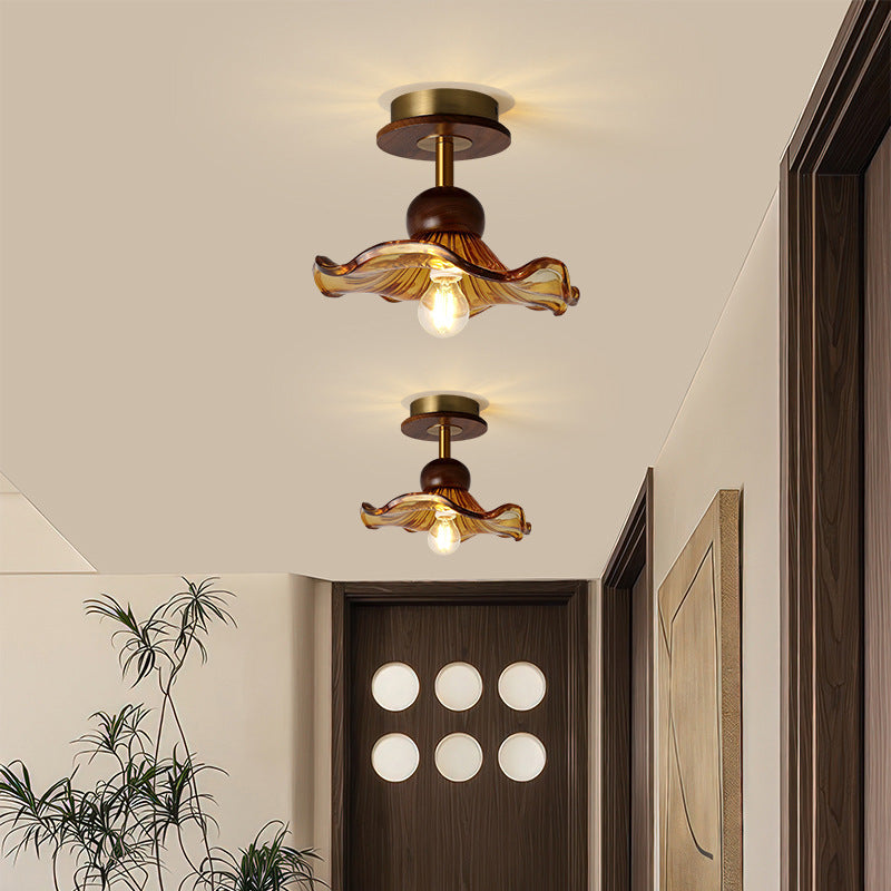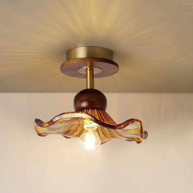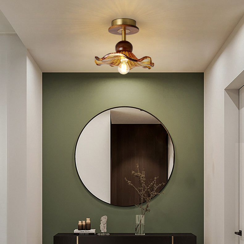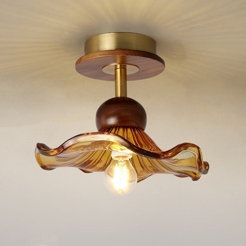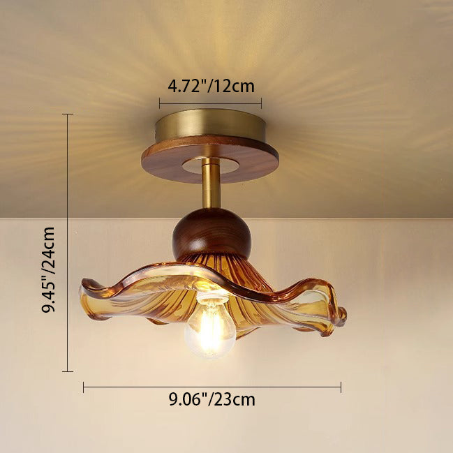 Traditional Japanese Flower Glass Shade Solid Wood 1-Light Semi-Flush Mount Ceiling Light For Living Room