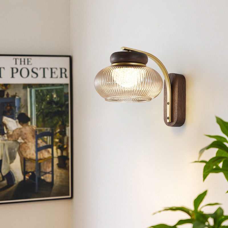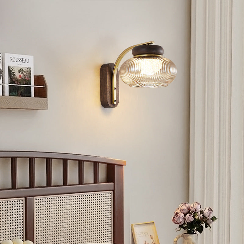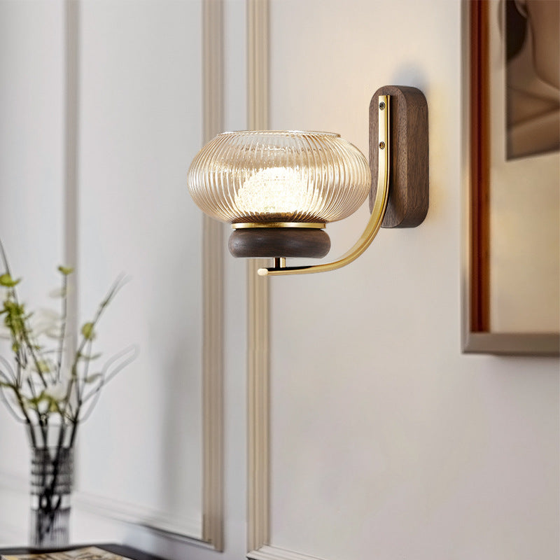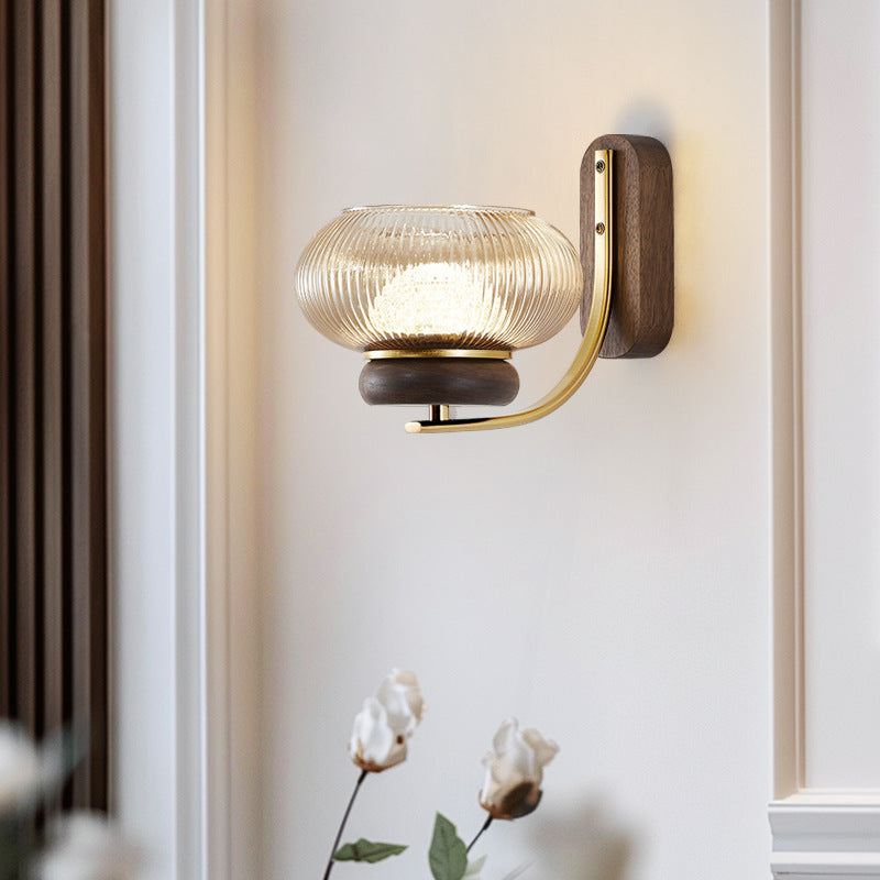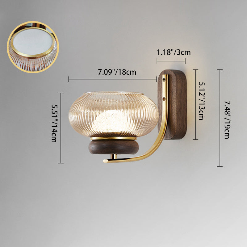Traditional Japanese Solid Wood Glass Round Shade LED Wall Sconce Lamp For Living Room