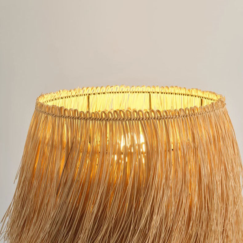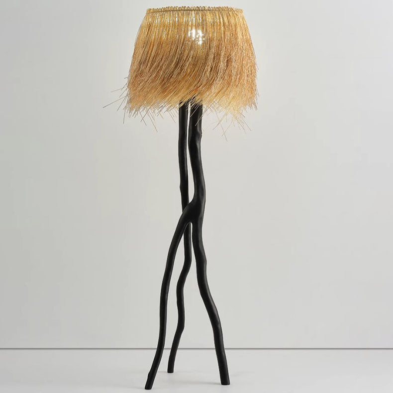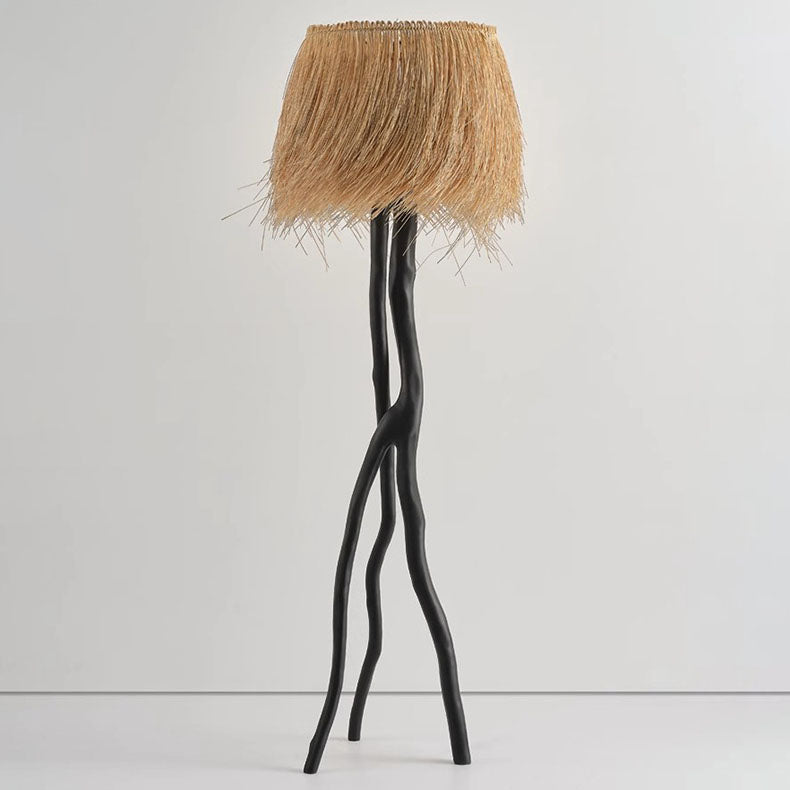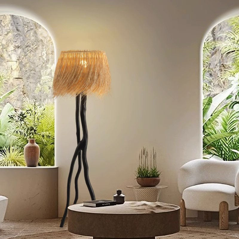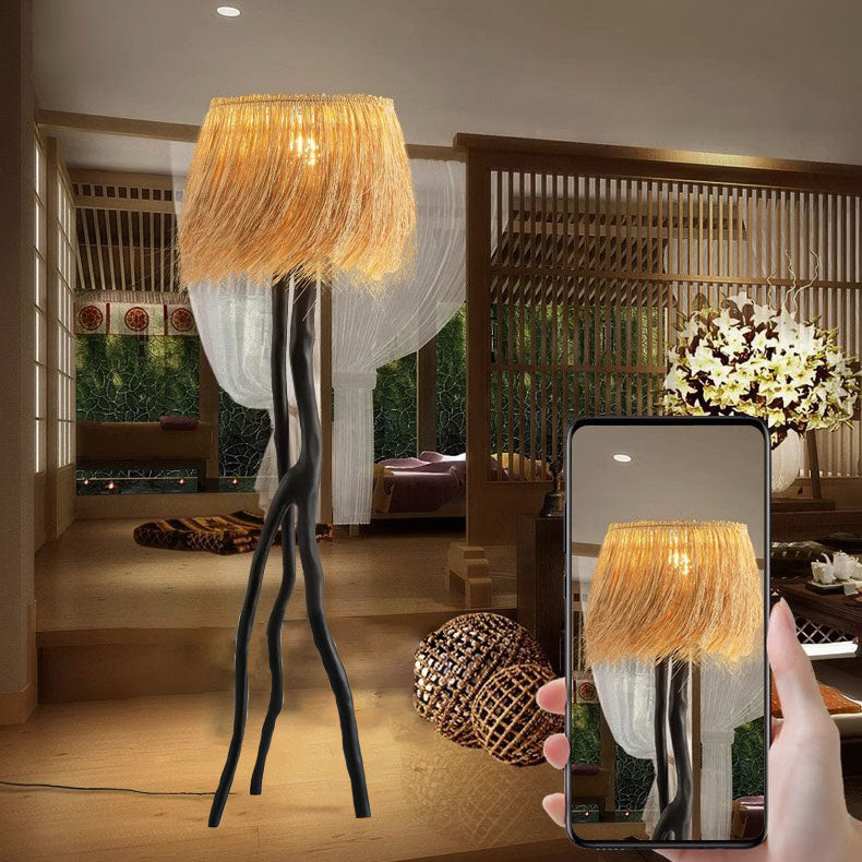 Traditional Rustic Bamboo Weaving Round Shade Resin Branch Base 1-Light Standing Floor Lamp For Entertainment Rooms
