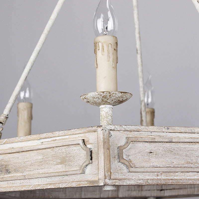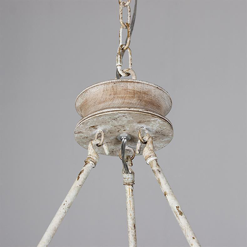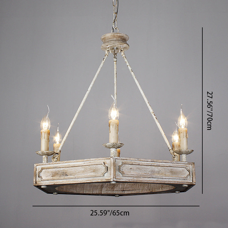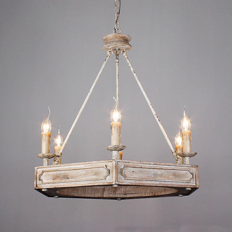 Traditional Rustic Distressed White Carving Wood Beam Hexagon Iron 6-Light Chandelier For Living Room