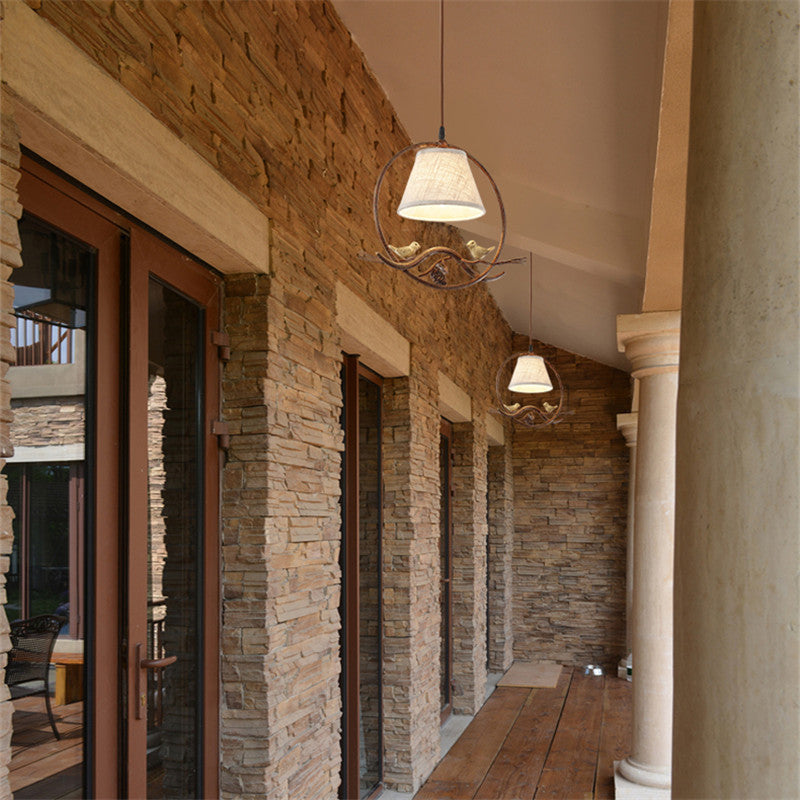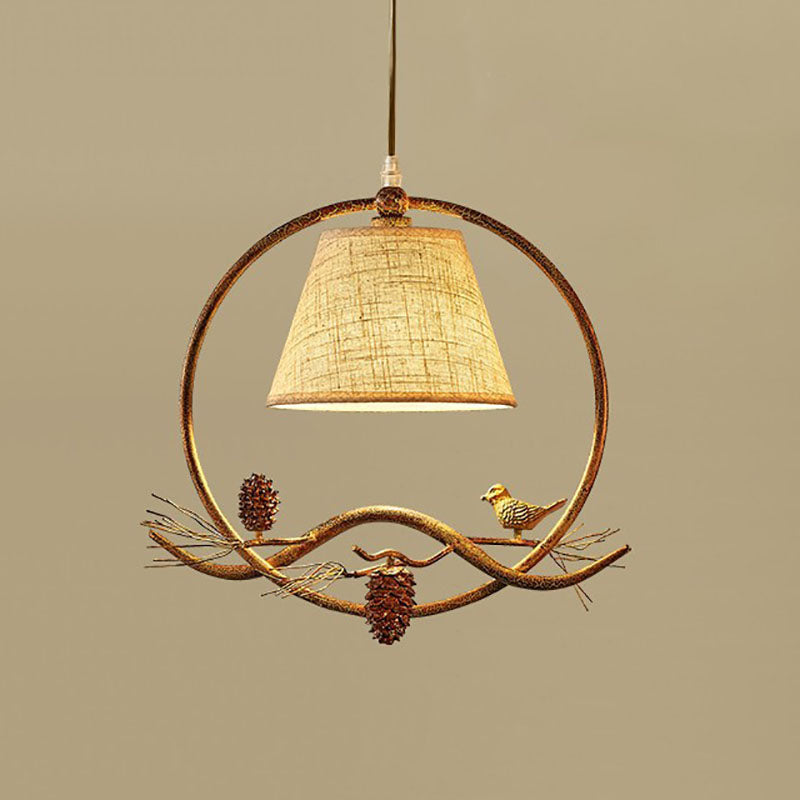 Traditional Rustic Fabric Shade Iron Ring Resin Bird 1-Light Pendant Light For Bedroom