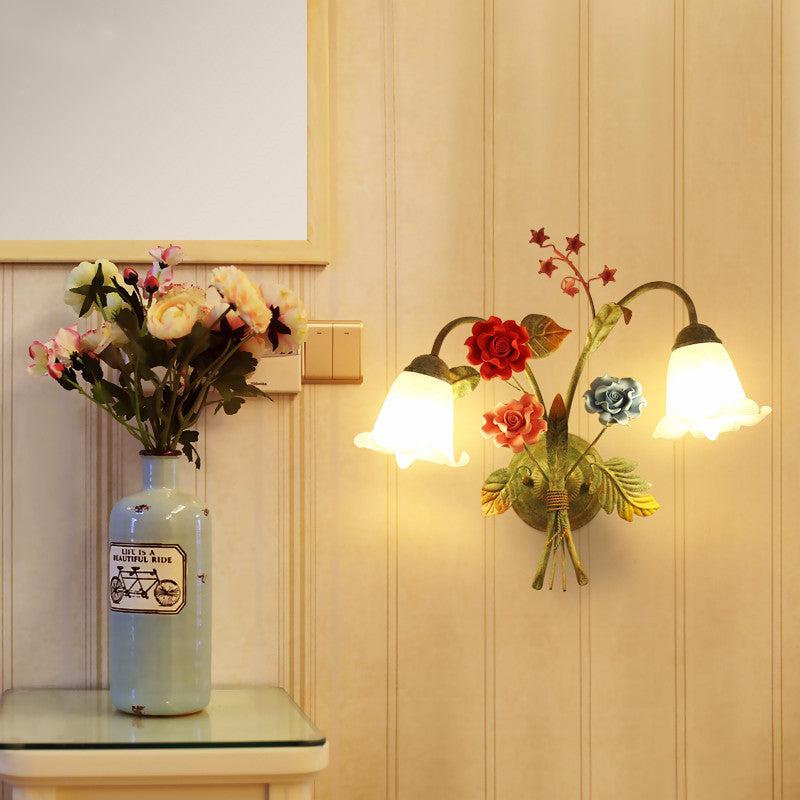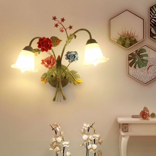 Traditional Rustic Faux Flower Iron Frame Glass Shade 1/2 Light Wall Sconce Lamp For Bedroom