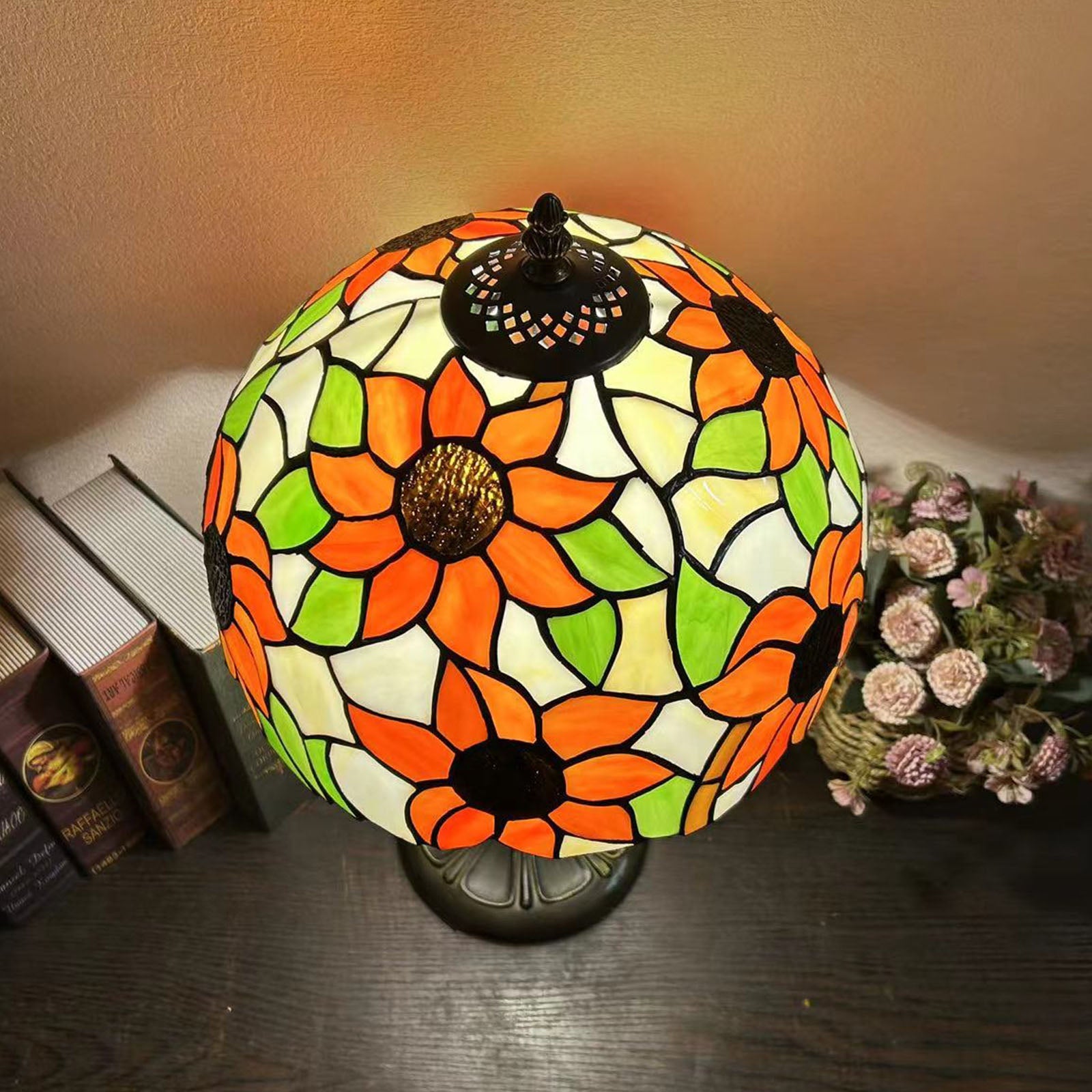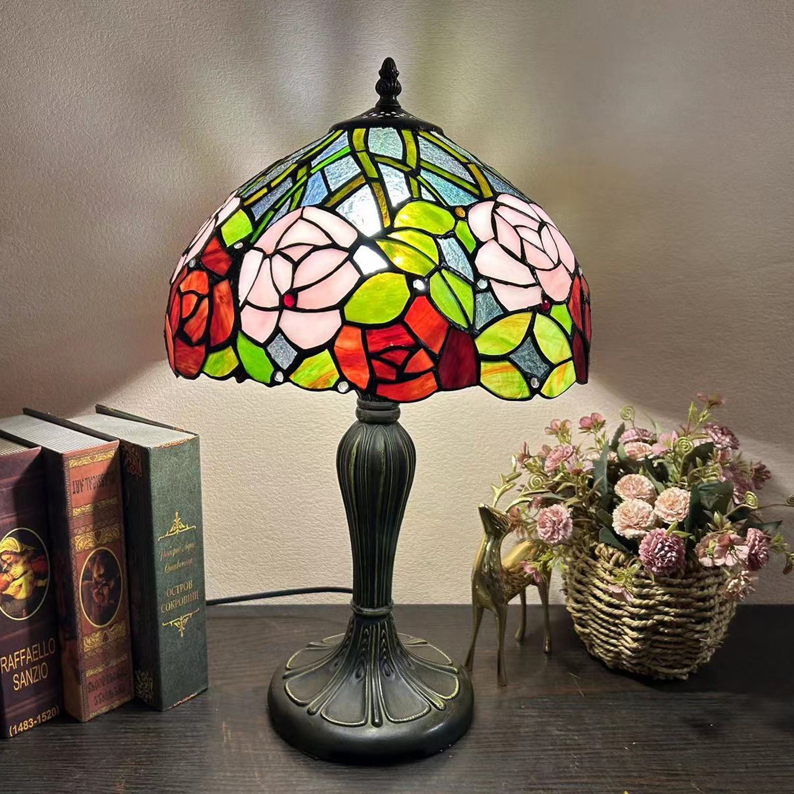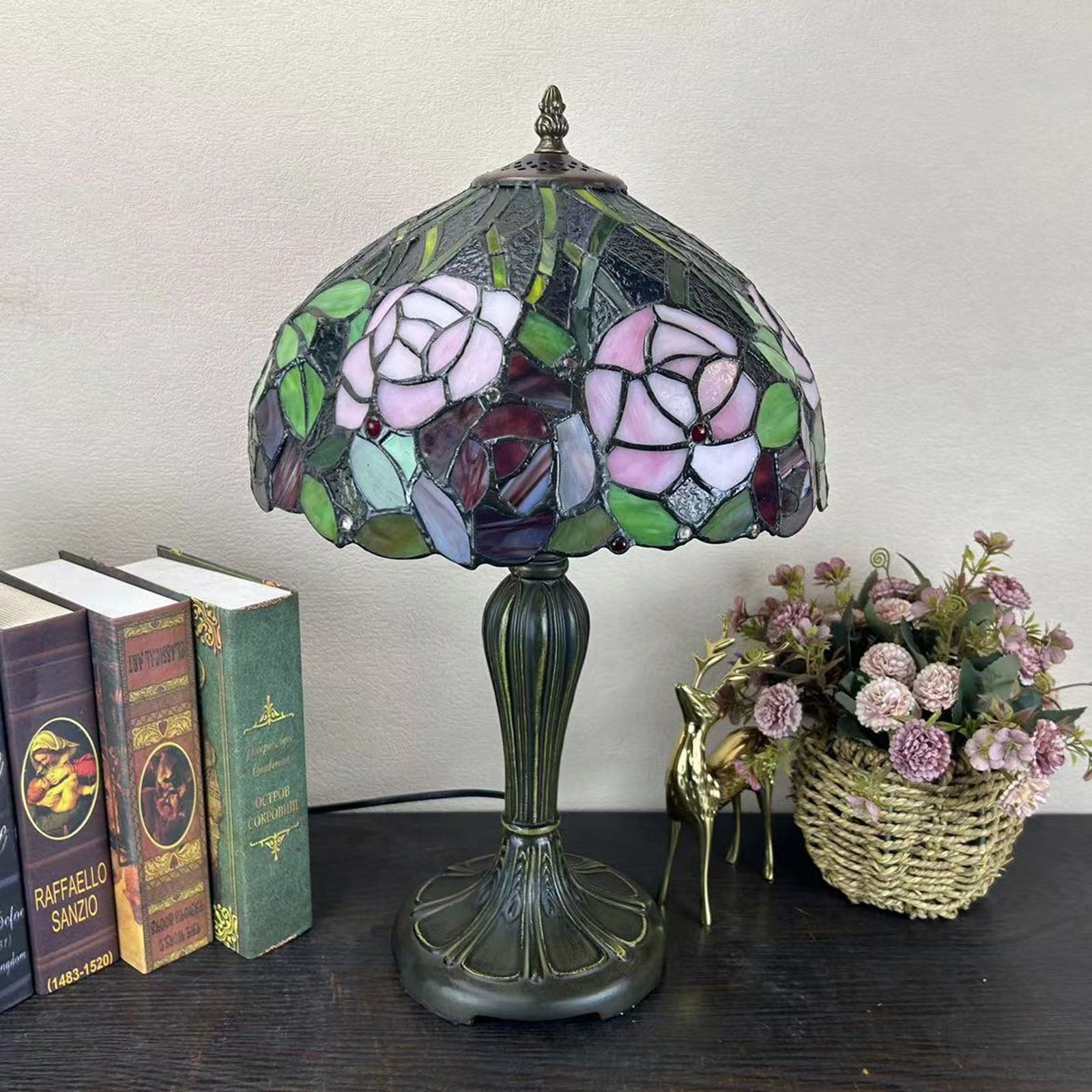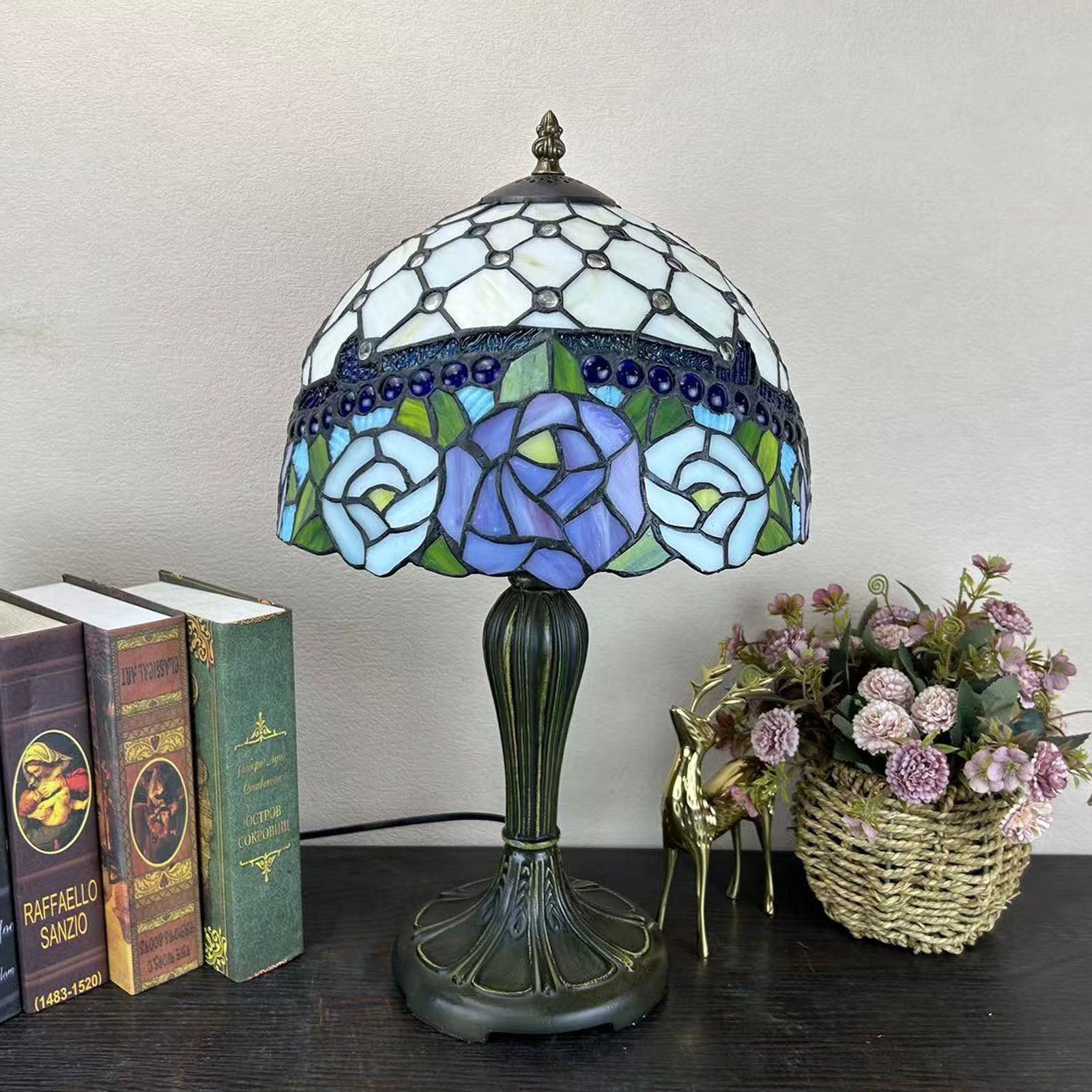 Traditional Tiffany Metal Glass Dome Grape Flower Dragonfly Butterfly 1-Light Table Lamp For Bedside