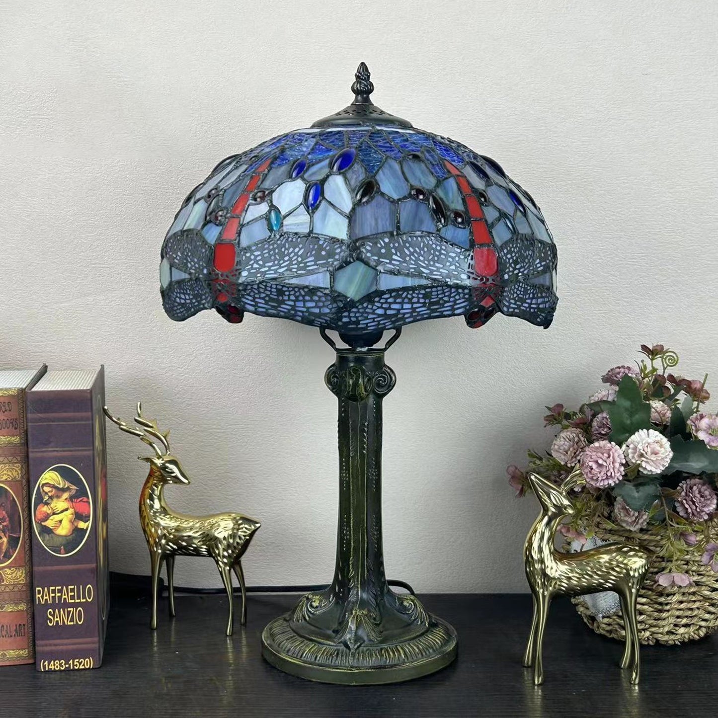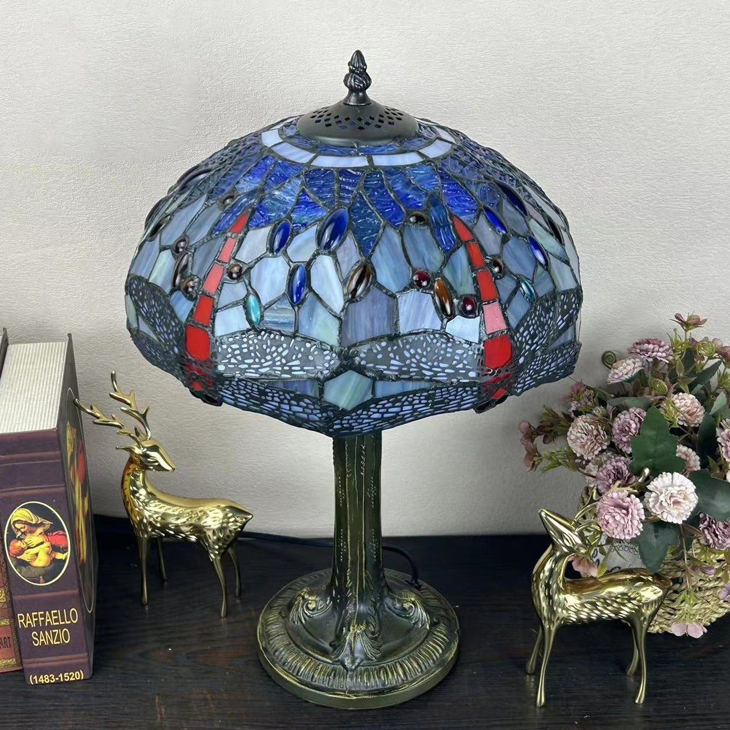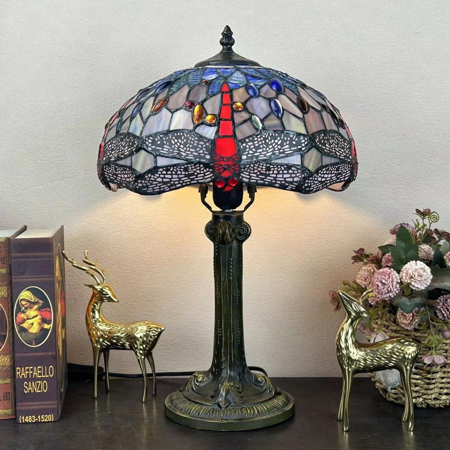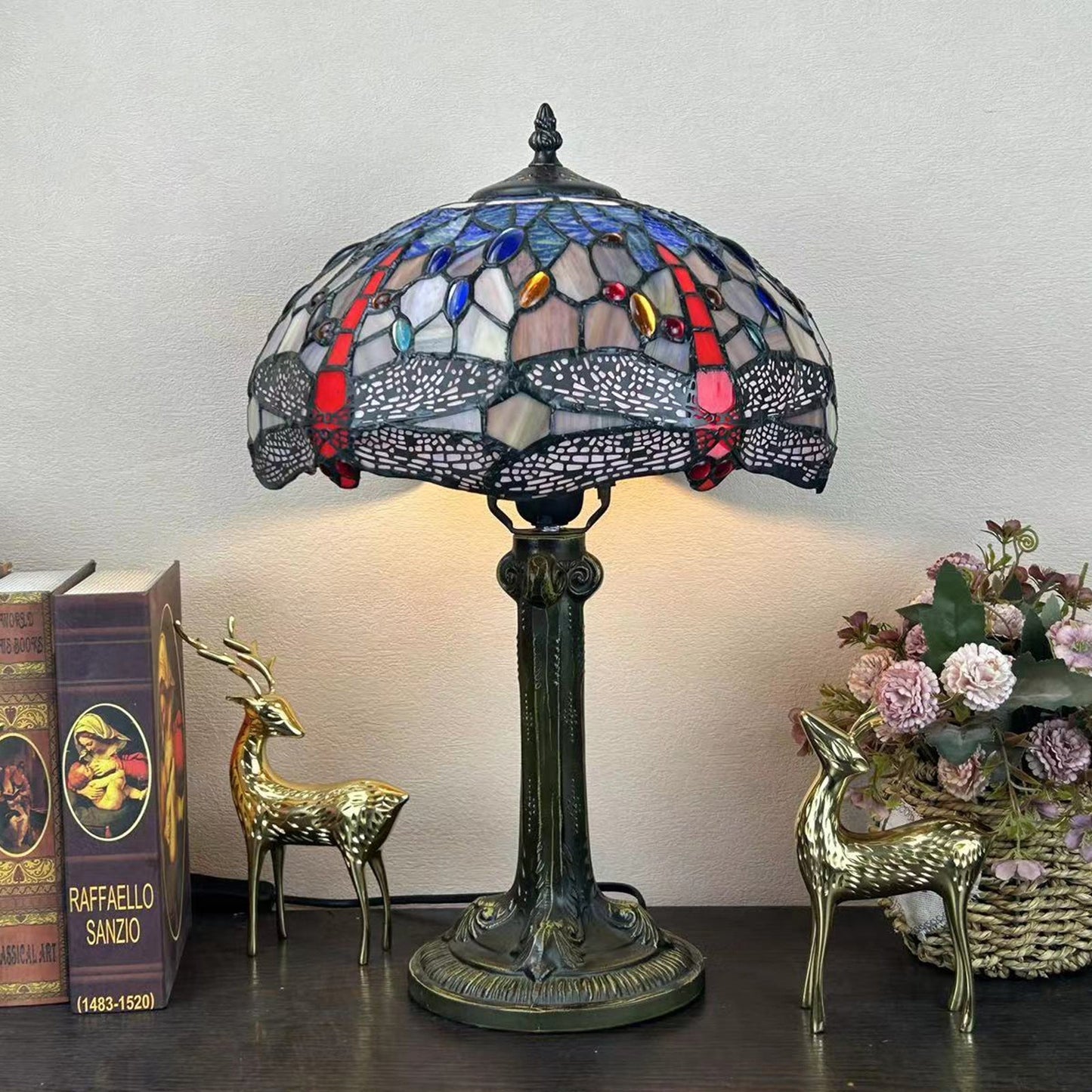 Traditional Tiffany Metal Hardware Glass Semicircular Dragonfly Flower Water Drop 1-Light Table Lamp For Bedroom