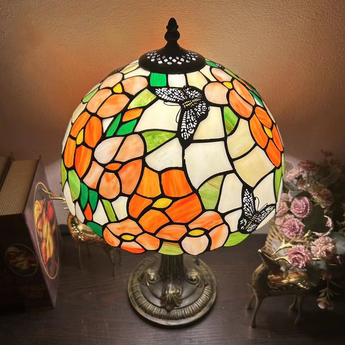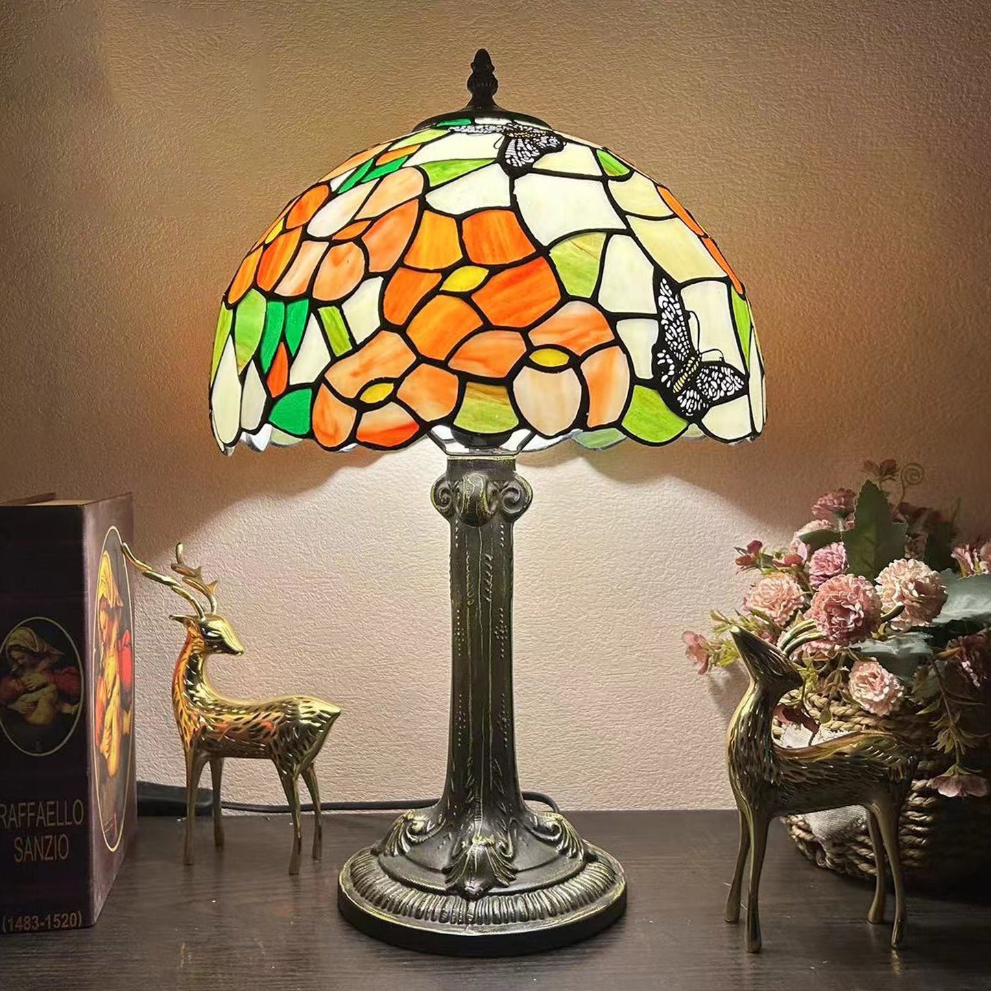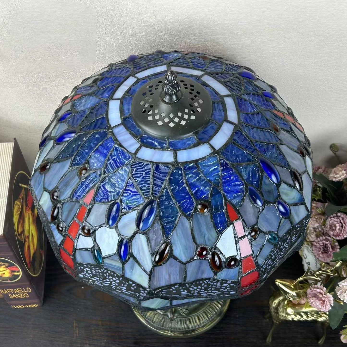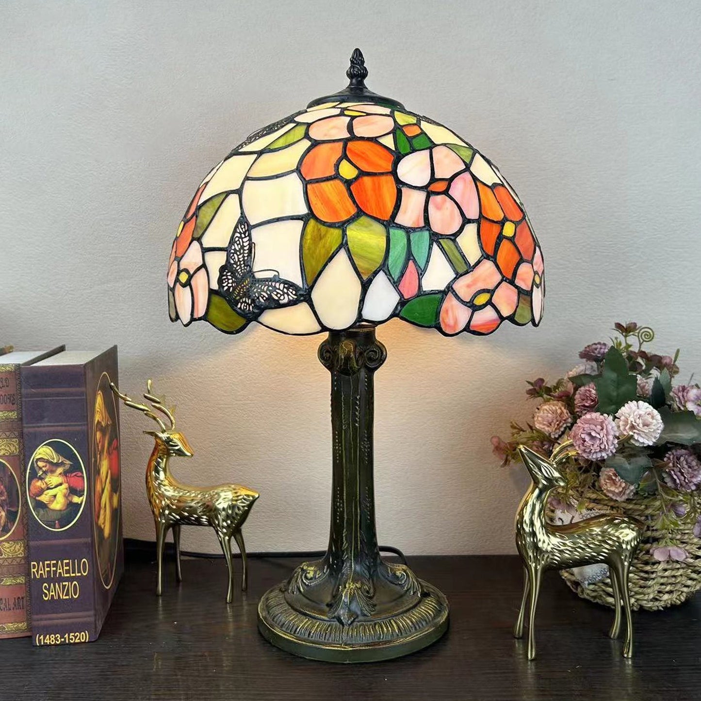 Traditional Tiffany Metal Hardware Glass Semicircular Dragonfly Flower Water Drop 1-Light Table Lamp For Bedroom