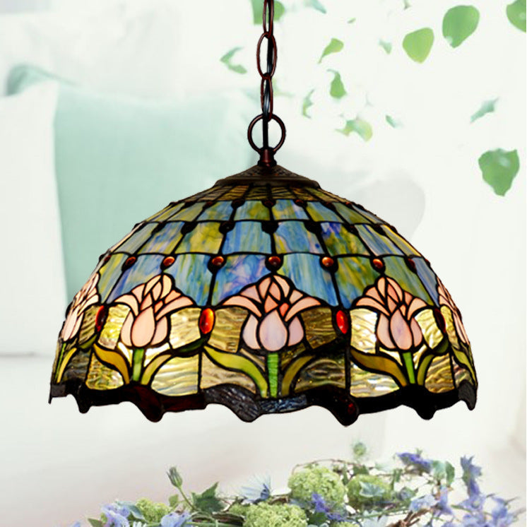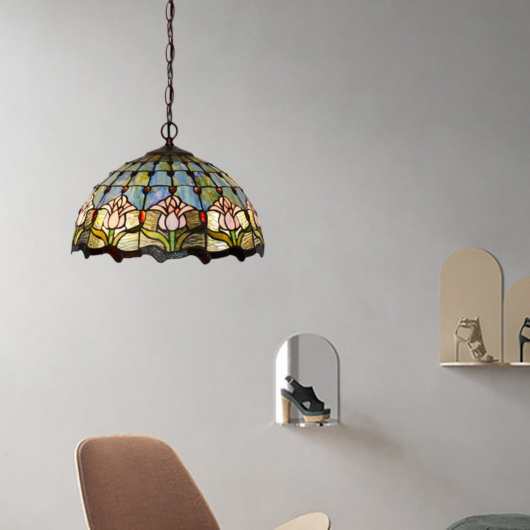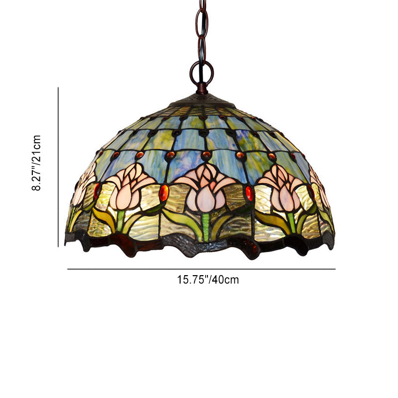 Traditional Tiffany Pastoral Tulip Stained Glass Dome 2-Light Chandelier For Dining Room