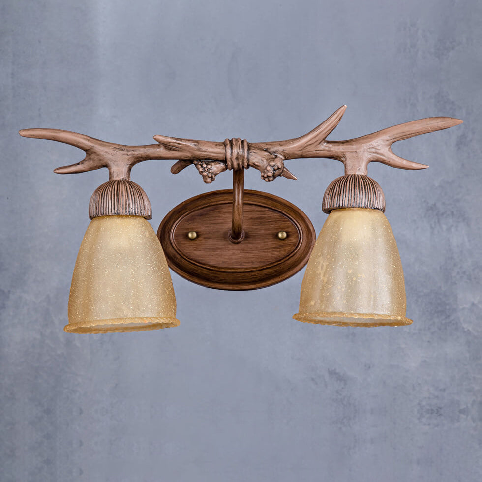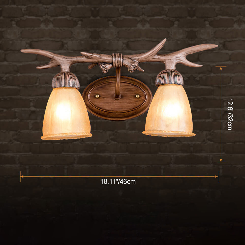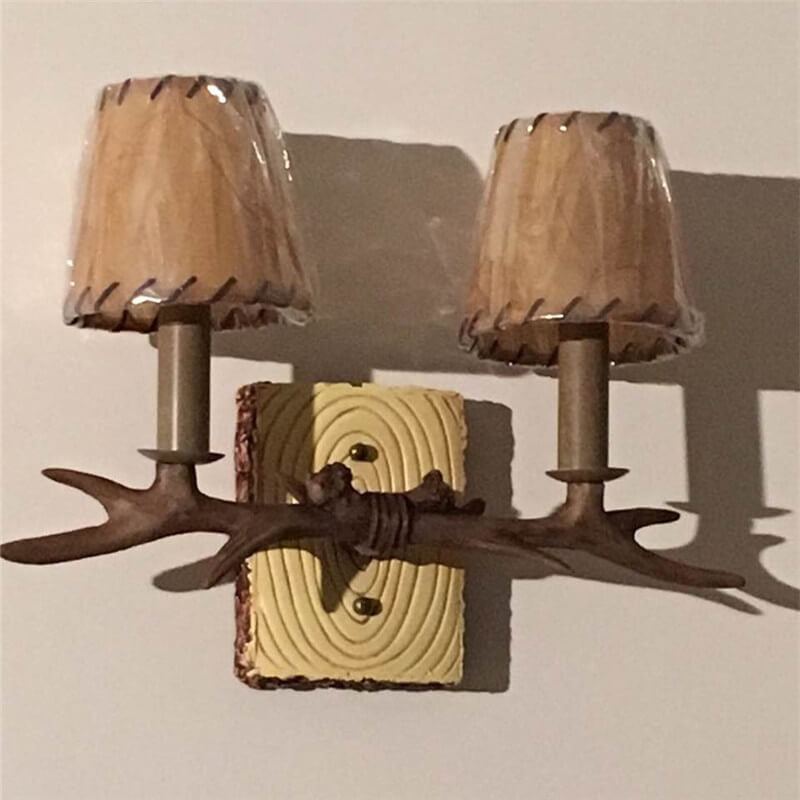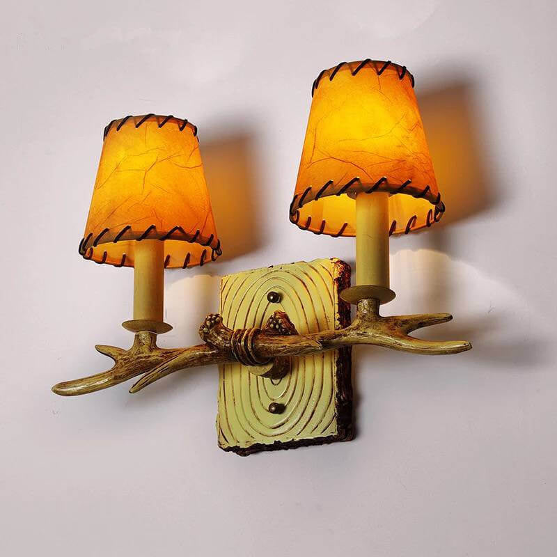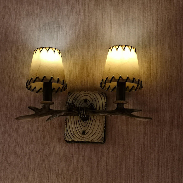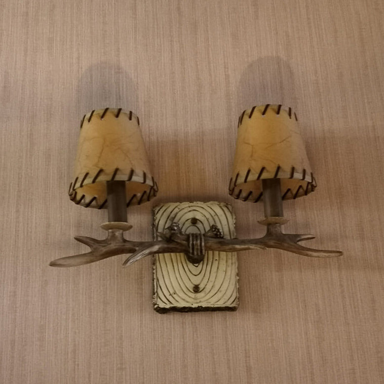Traditional Vintage Antler Iron Resin Faux Parchment Shade 2-Light Wall Sconce Lamp For Living Room