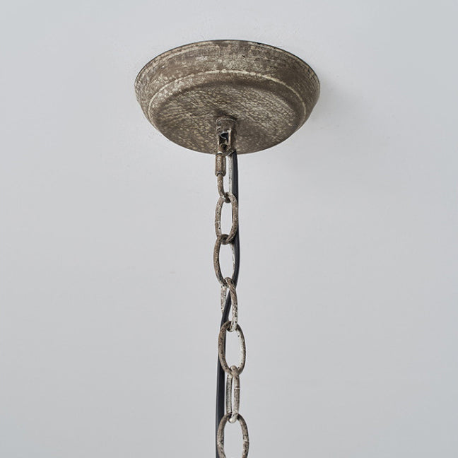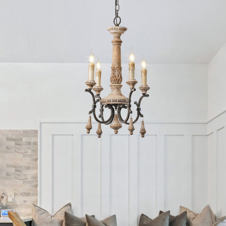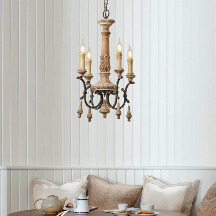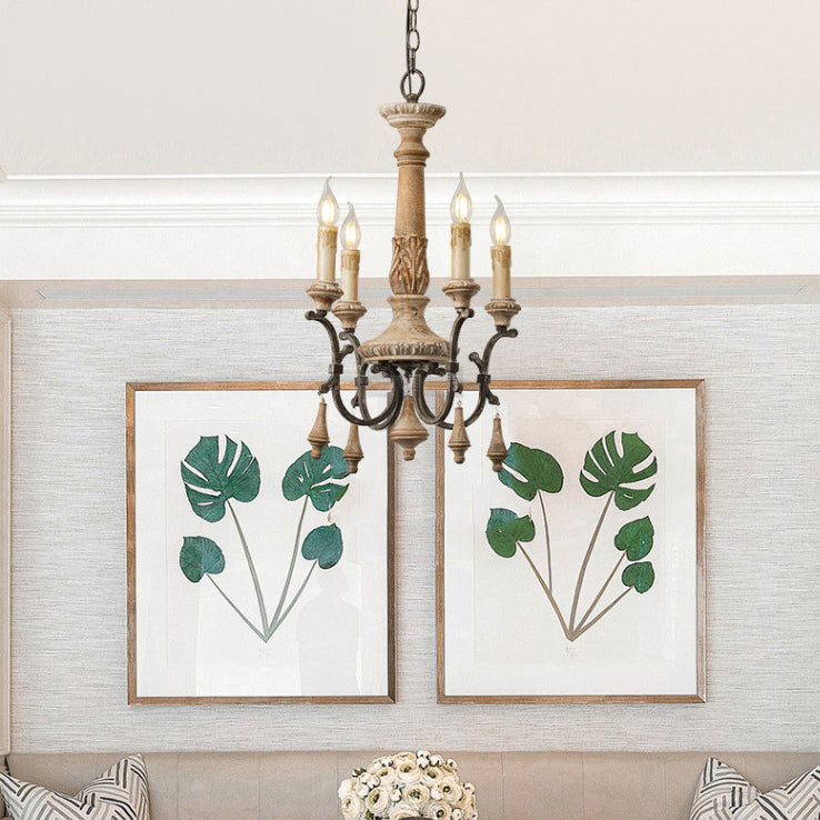 Traditional Vintage Carved Candle Shape Round Ironwood 4/6 Light Chandelier For Living Room
