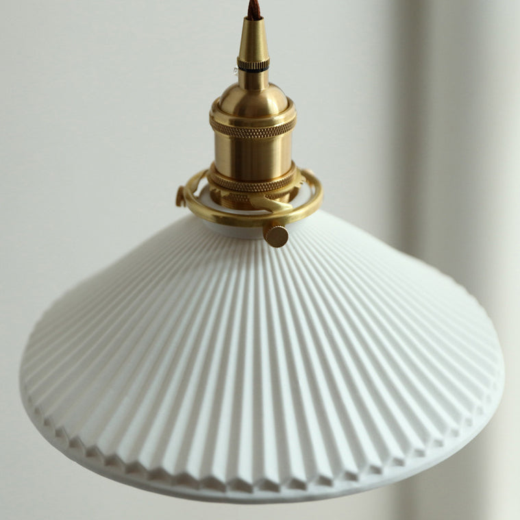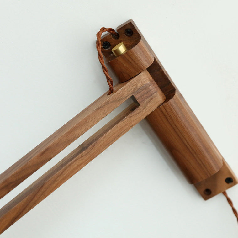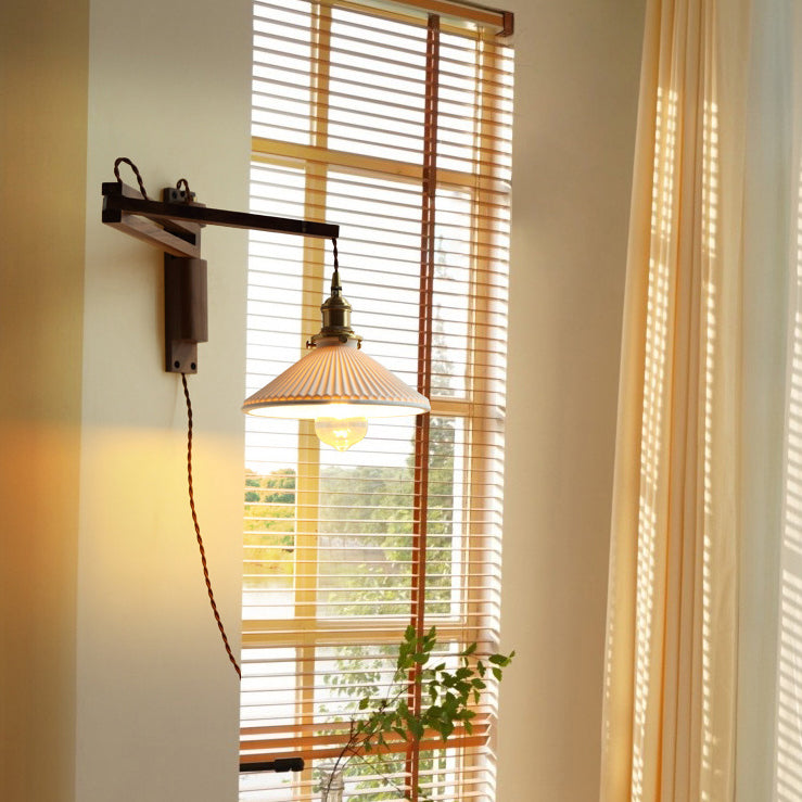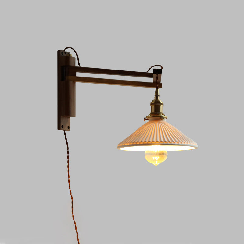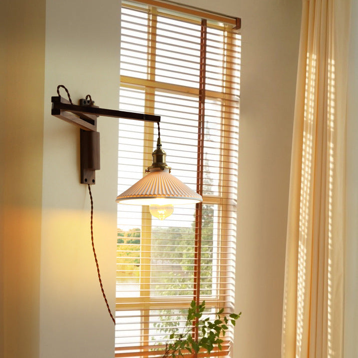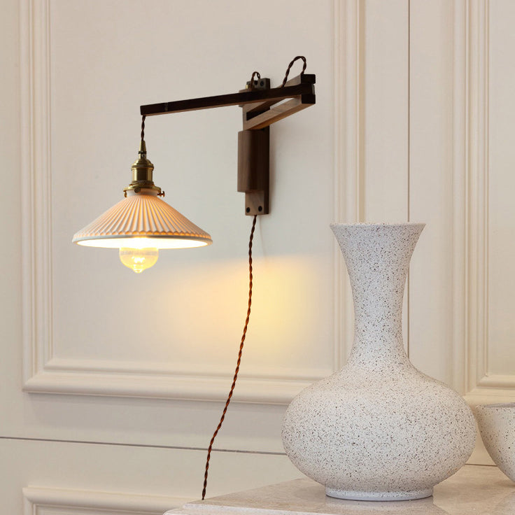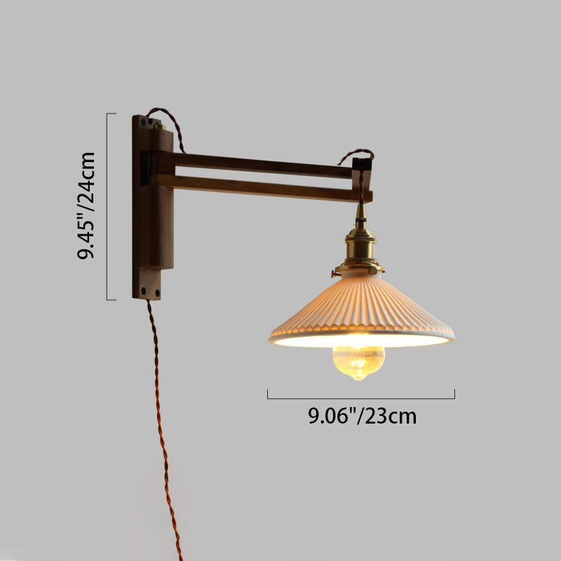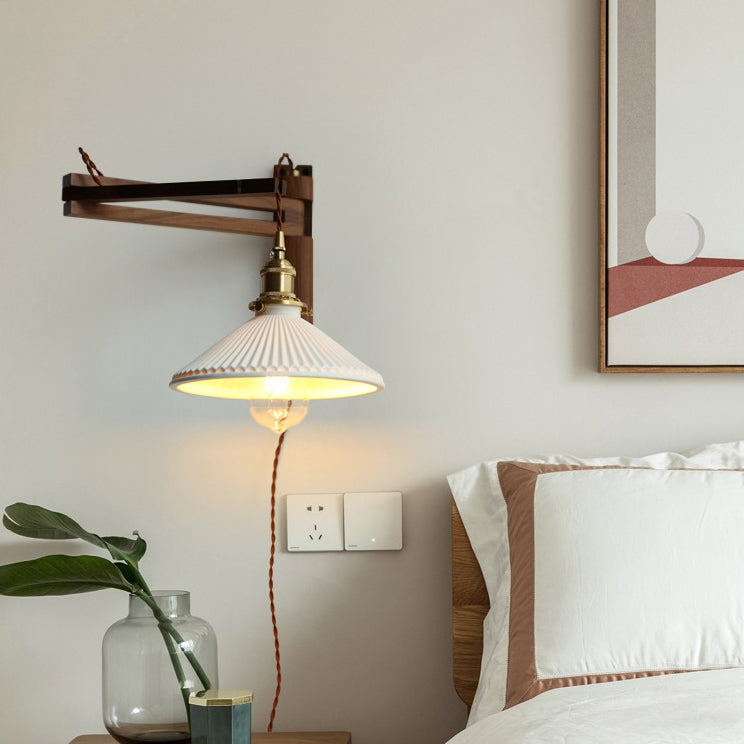Traditional Vintage Conical Folding Retractable Ceramic Walnut Ash Wood Brass 1-Light Wall Sconce Lamp For Living Room