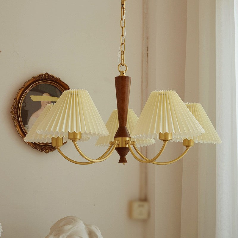 Traditional Vintage Pleated Fabric Shade Wood Brass Frame 3/5-Light Chandelier For Living Room